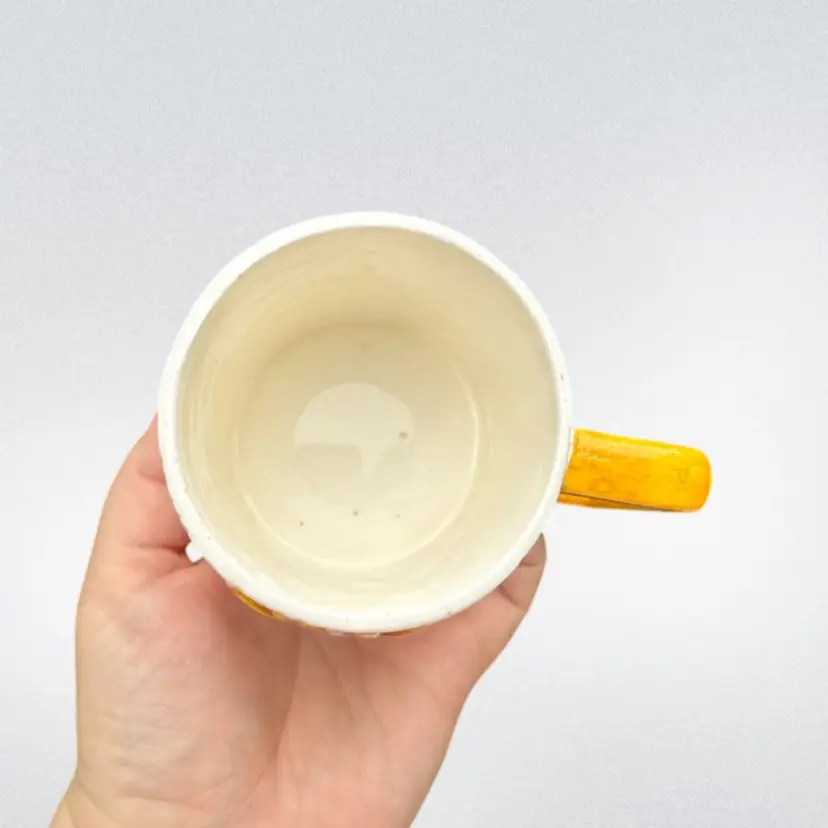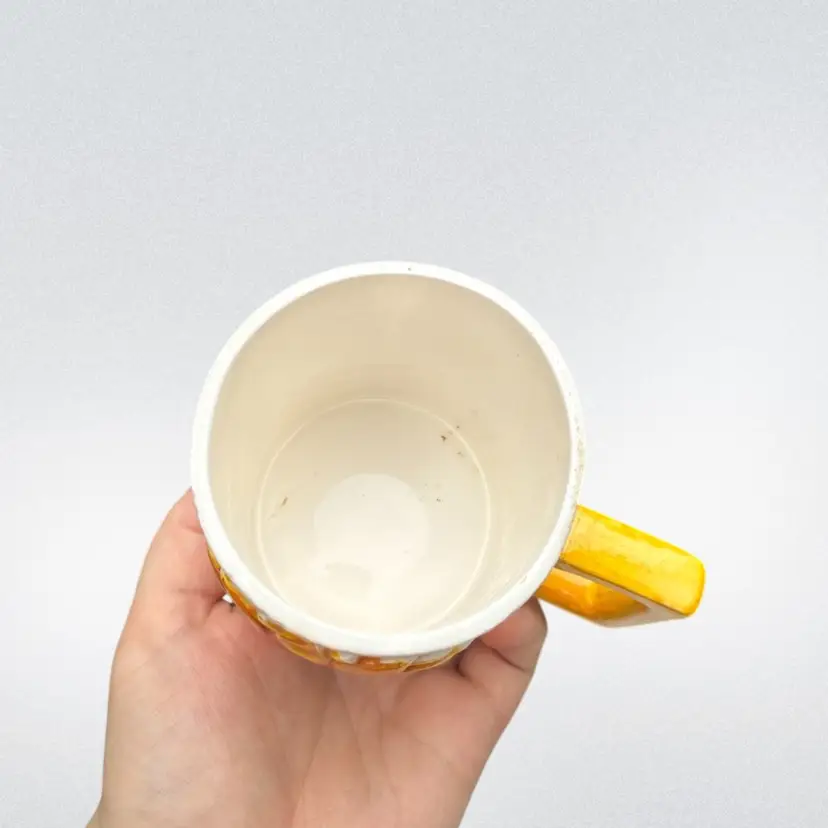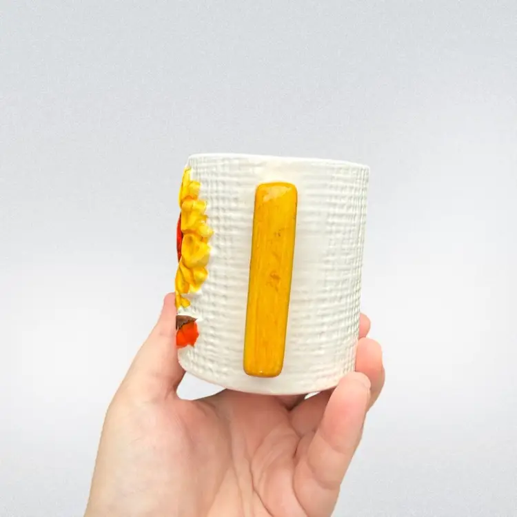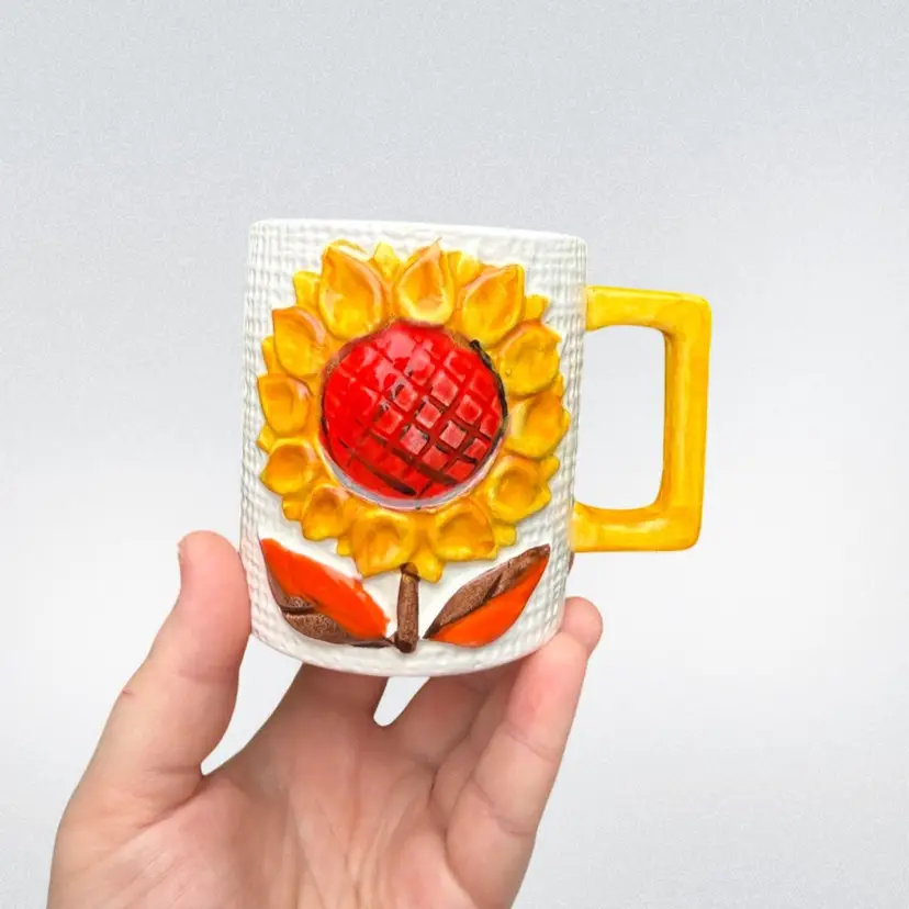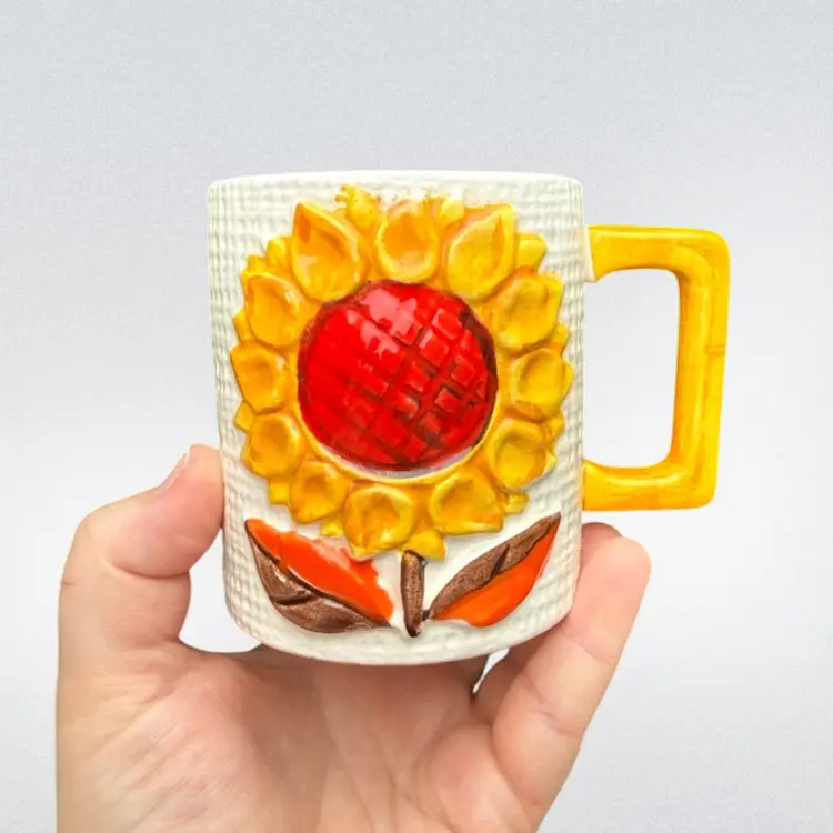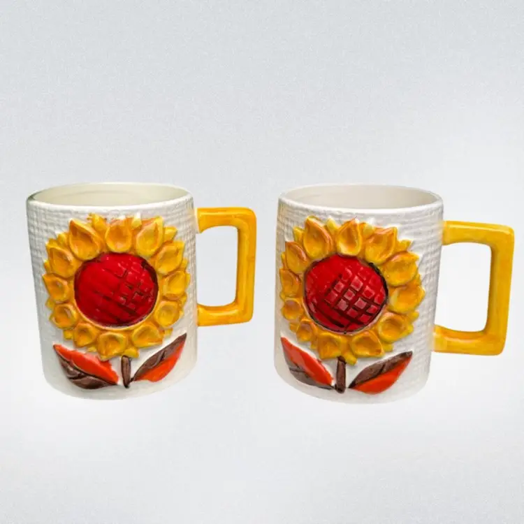 A pair of vintage mugs by Napcoware in the 1970’s, made in Japan. They feature a yellow/red/orange sunflower design. These are both in good vintage condition- no chips or cracks but both have some marks inside the mugs themselves. A perfect addition to your mid century mug collection. About 4 in tall.