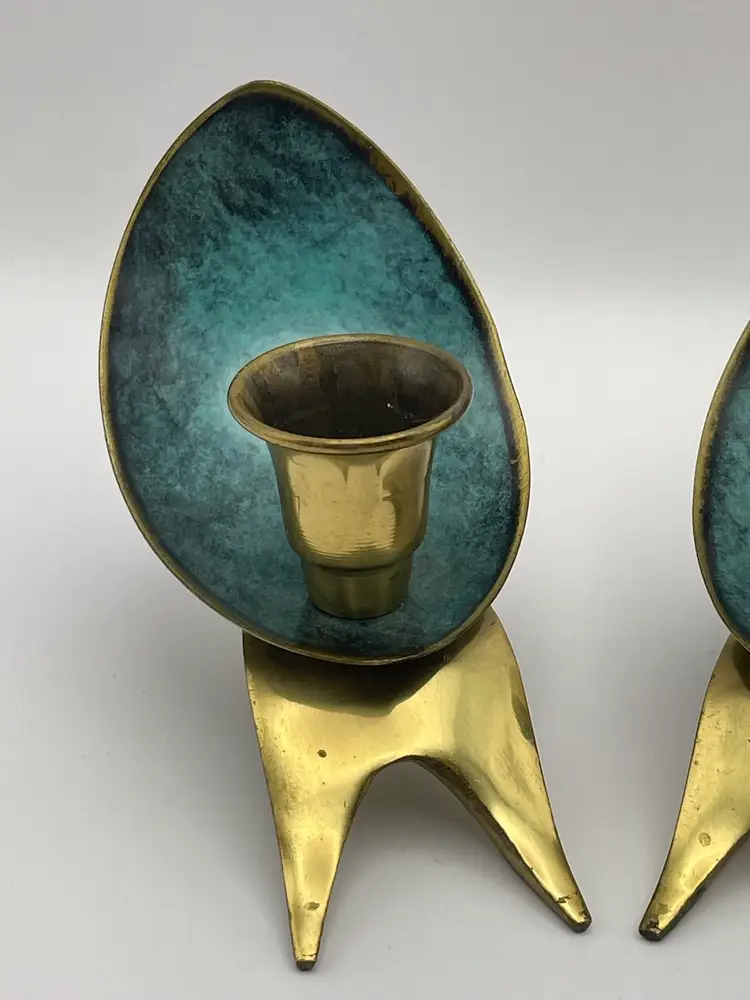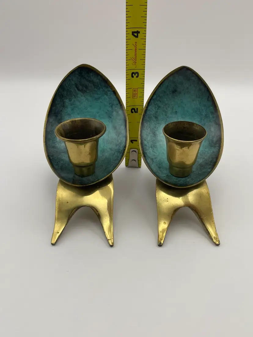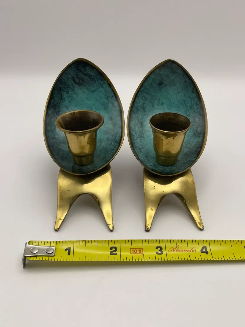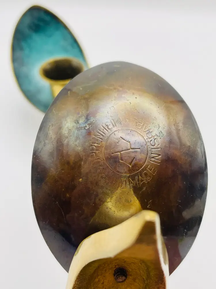 Pair of 2 Vintage Oppenheim Brass Enamel Art Deco Shabbat Candle Holders Israel