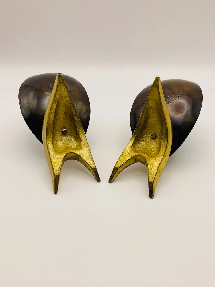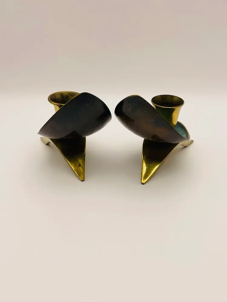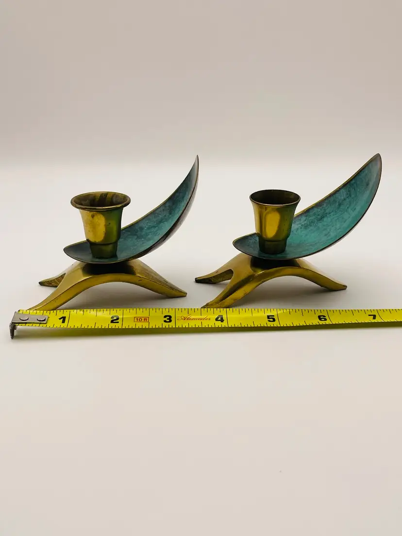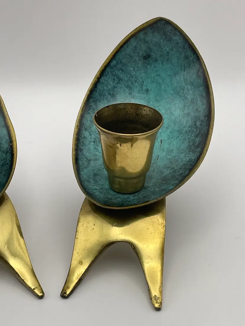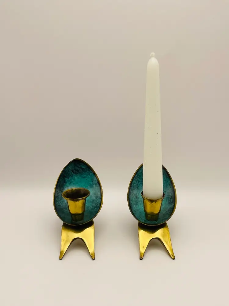 Pair of 2 Vintage Oppenheim Brass Enamel Art Deco Shabbat Candle Holders Israel