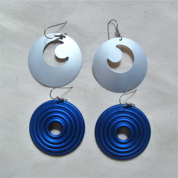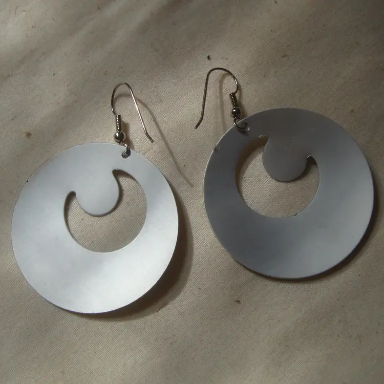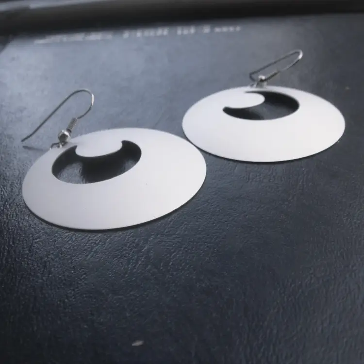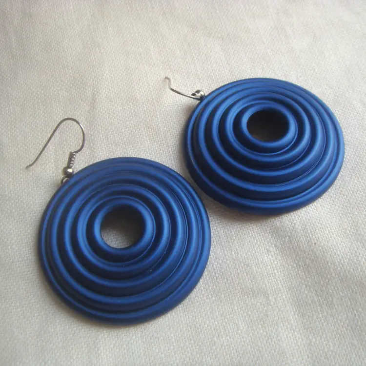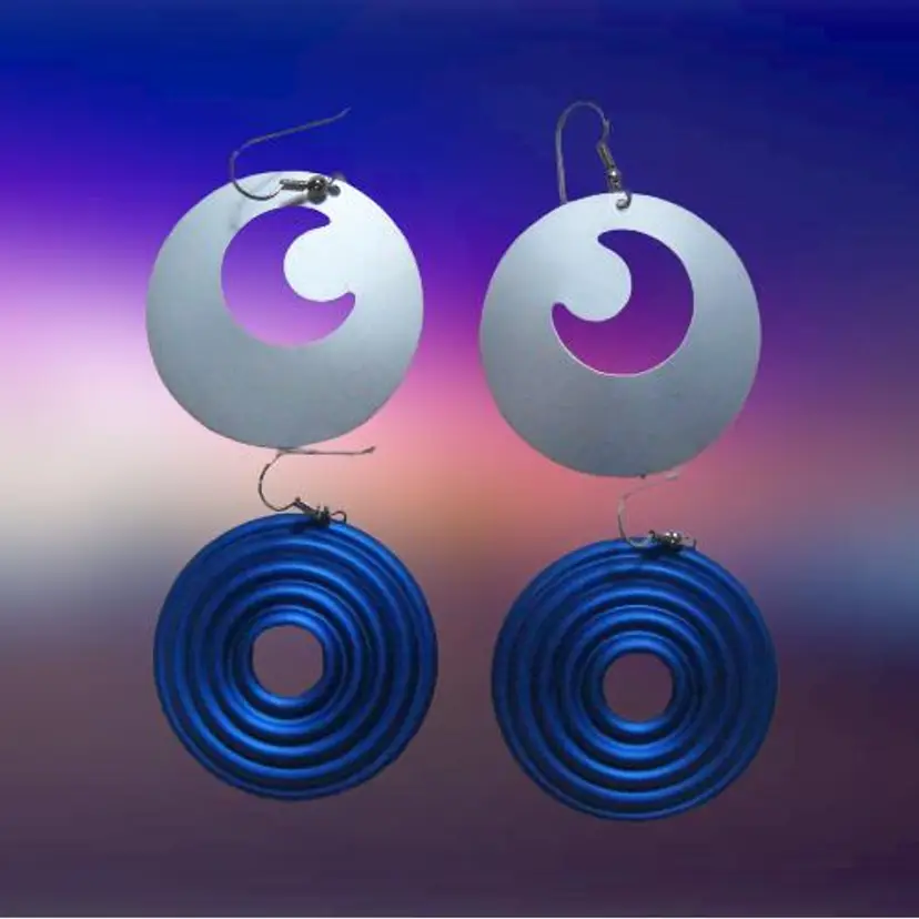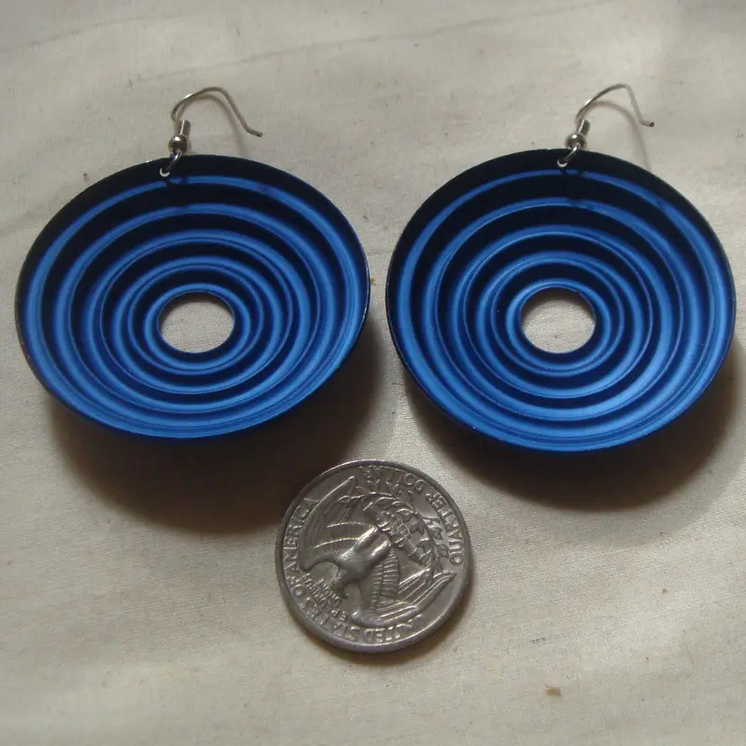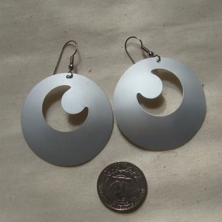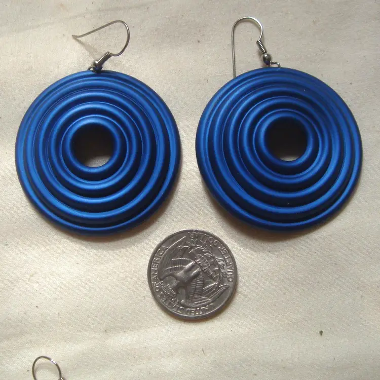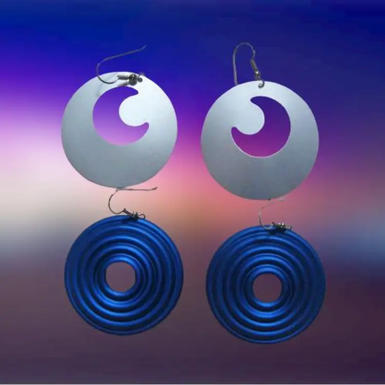 2 cool pair of earrings from 1980s. One silver moon cut-out, one blue dimensional with center cut-out. Matte metallic, very lightweight. Diameter, almost 2" (1 7/8) Both pair are same size. Minimal wear.
