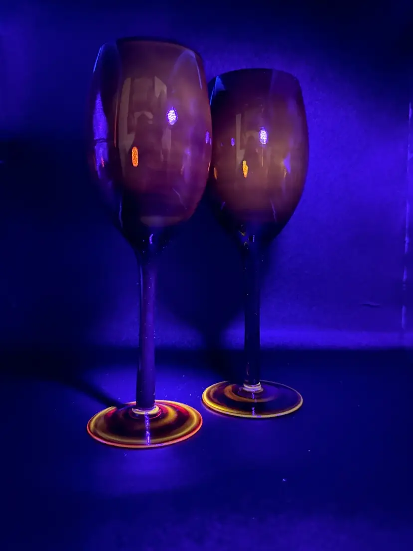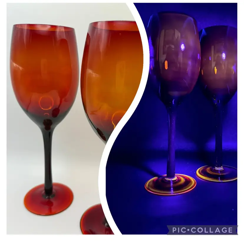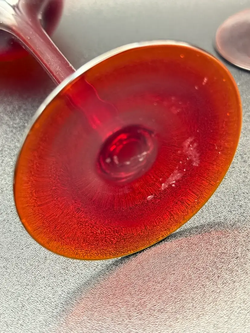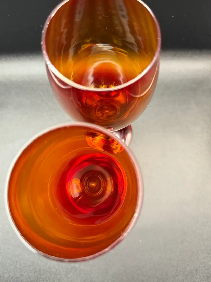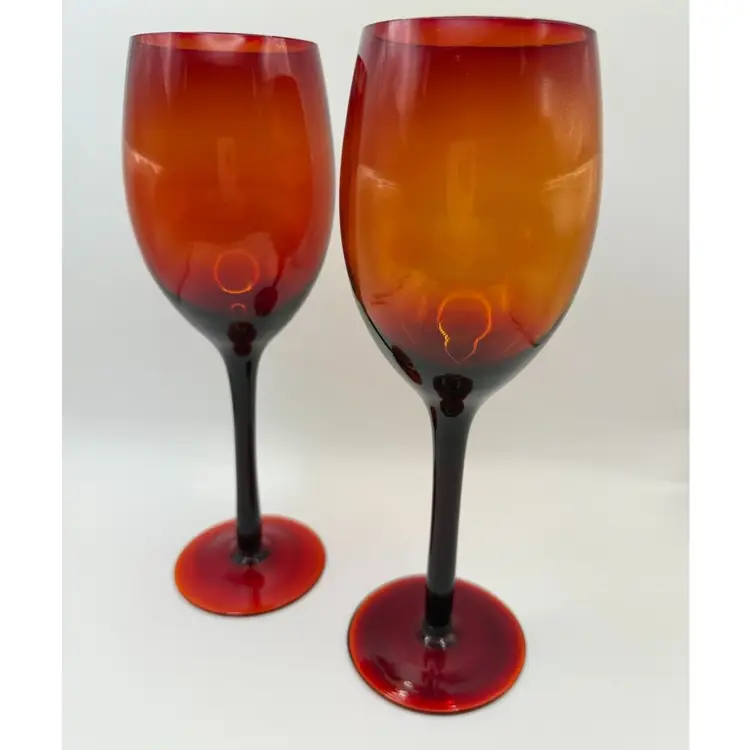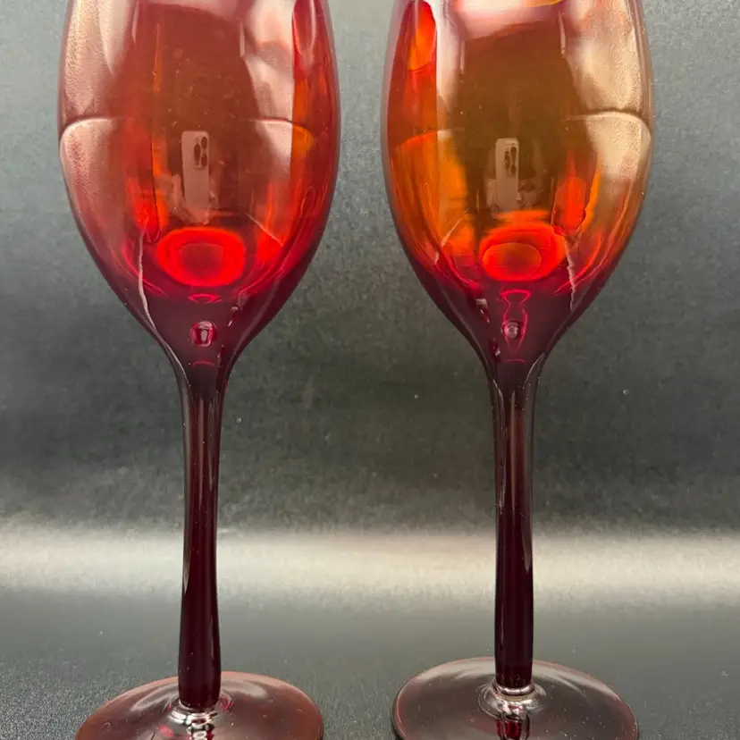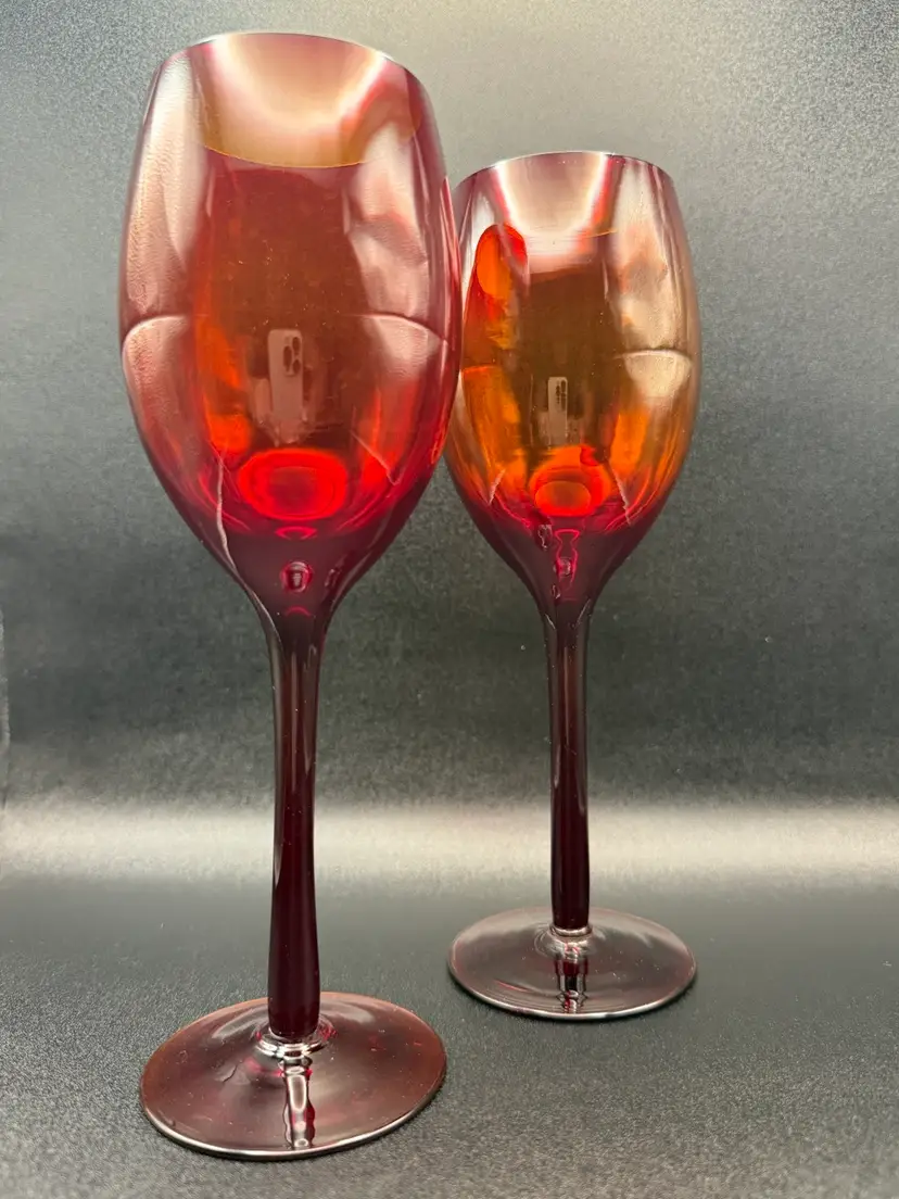 Elegant Amberina wine glassware with a touch of cadmium glow. No chips or cracks 9” tall
