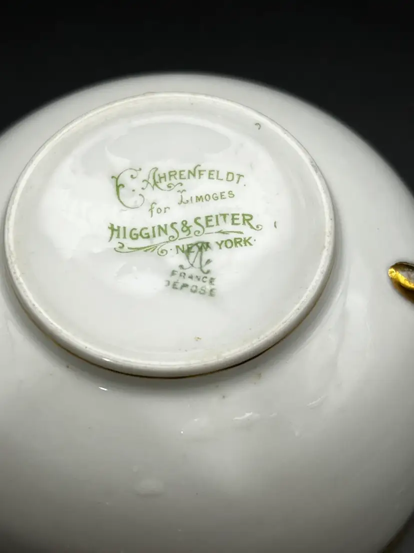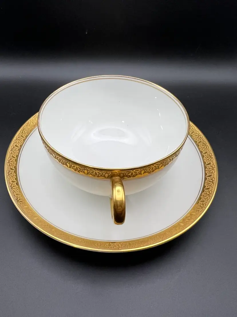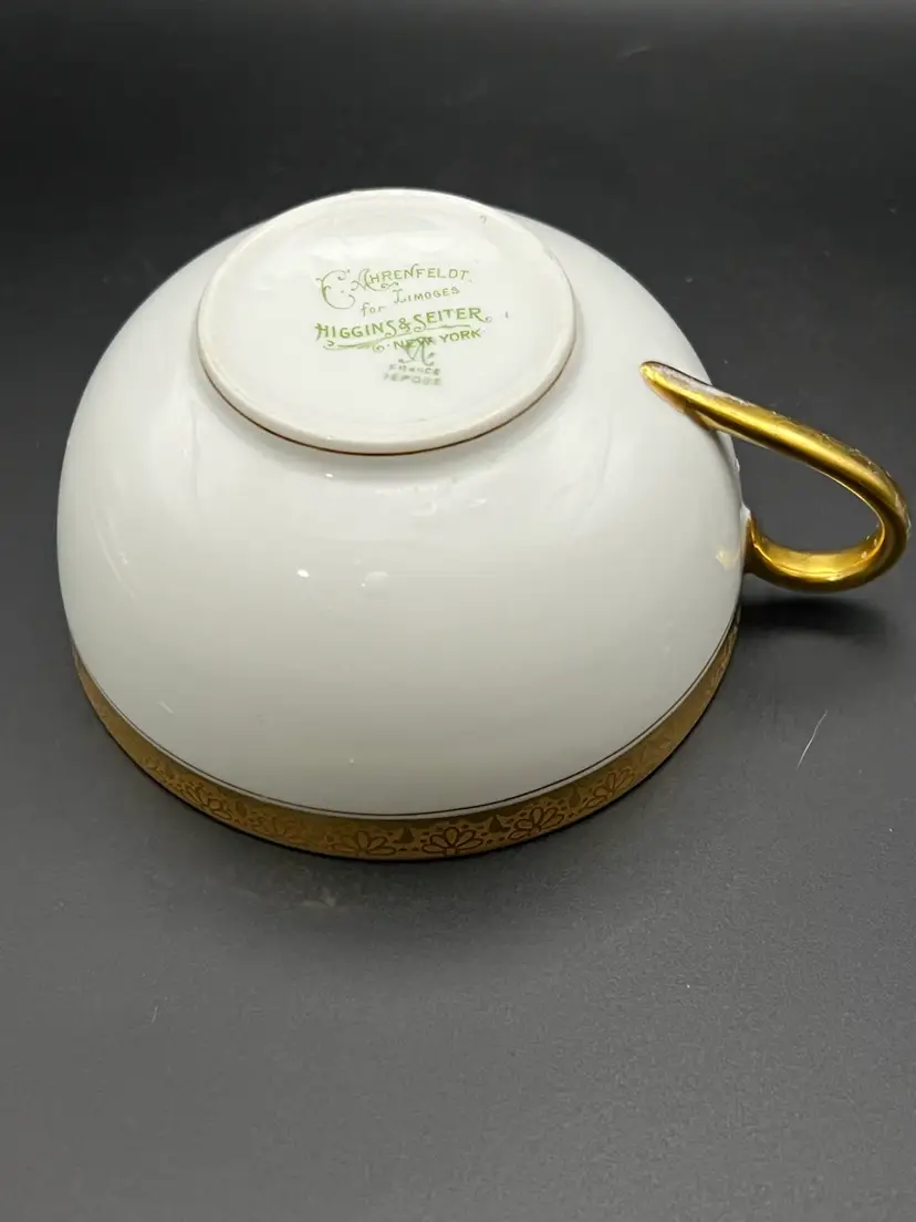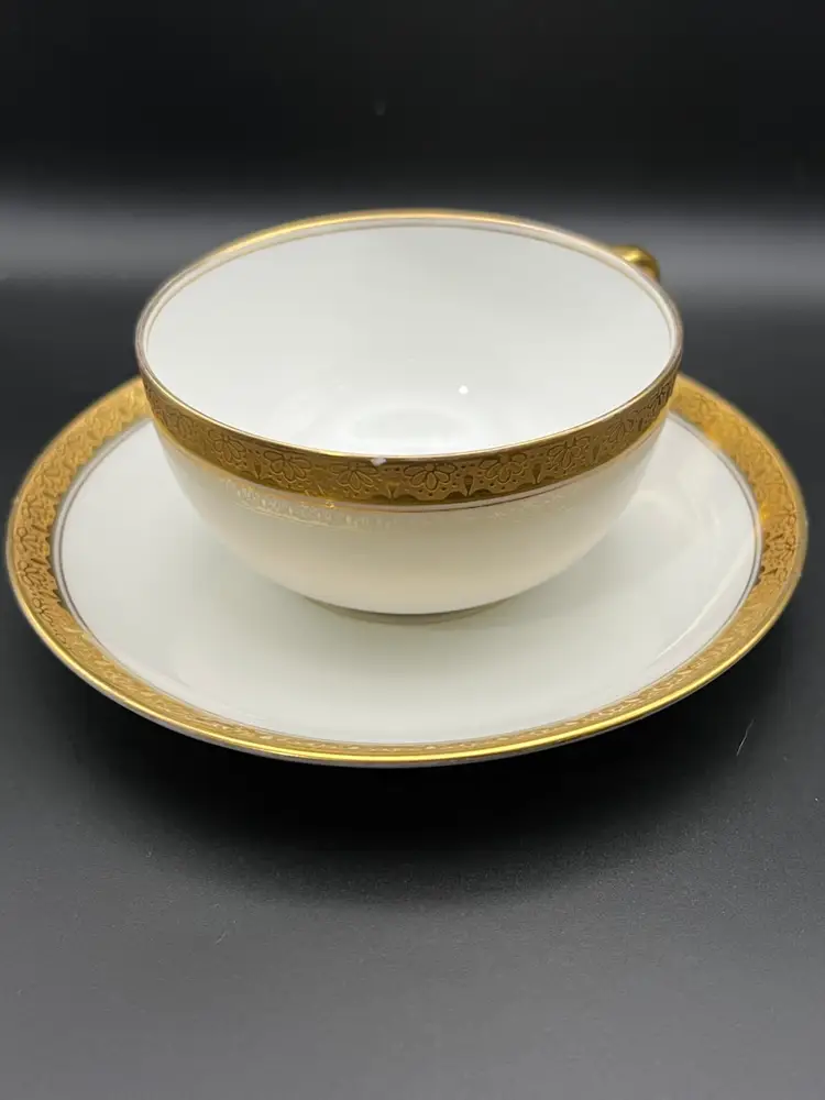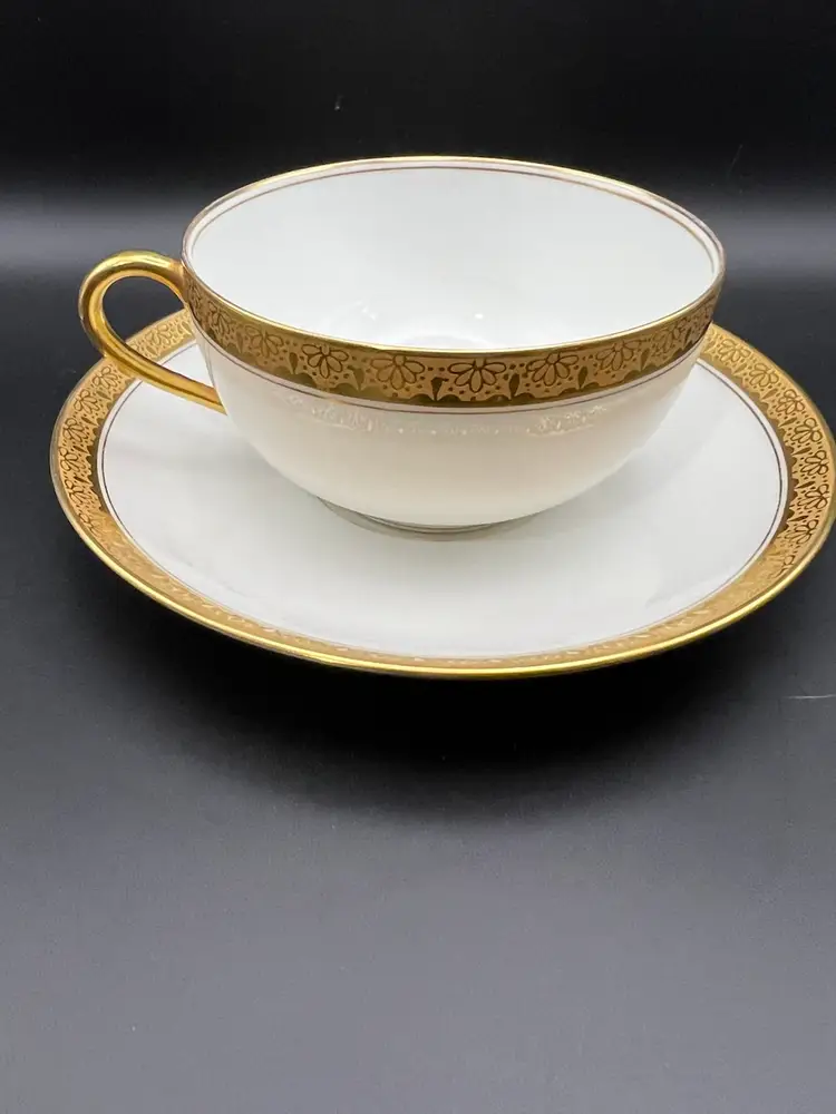 This two-piece tea cup and saucer set from Limoges, France is a vintage item that exudes elegance. The intricate floral pattern in white, painted with gold accents on fine china, makes it a great addition to any collector's kitchen or dining room. Perfect for hot beverages, this original French piece is sure to impress.