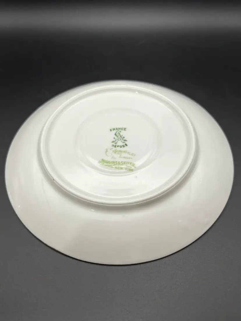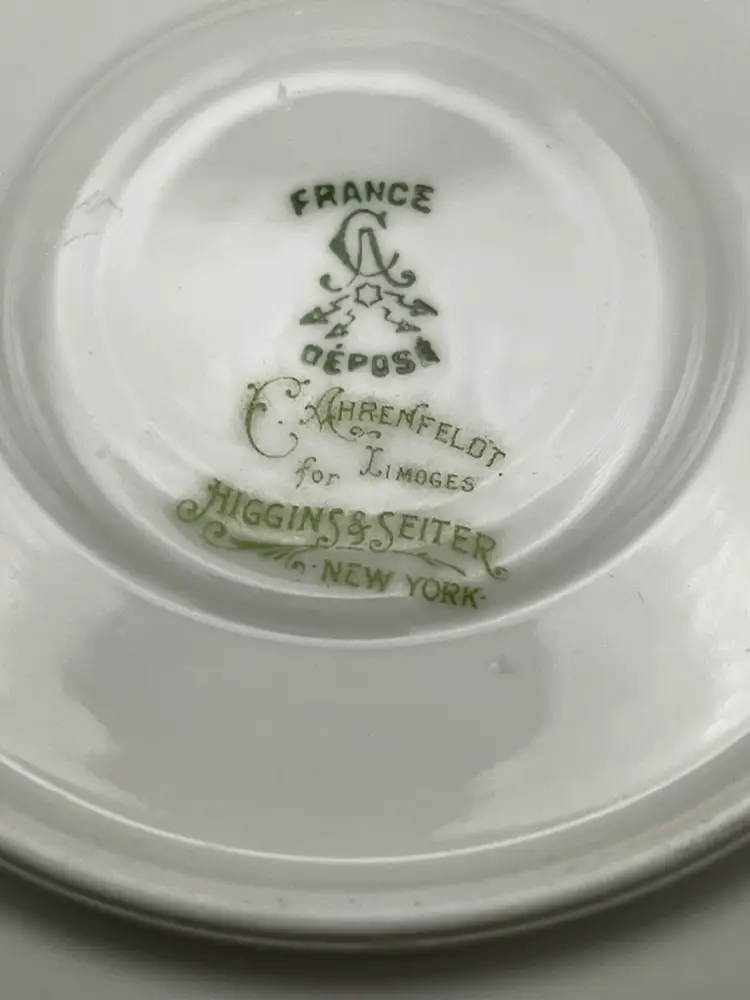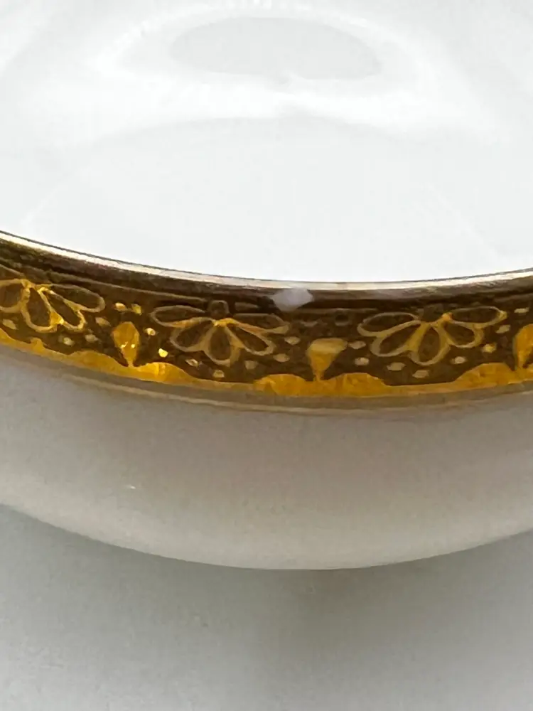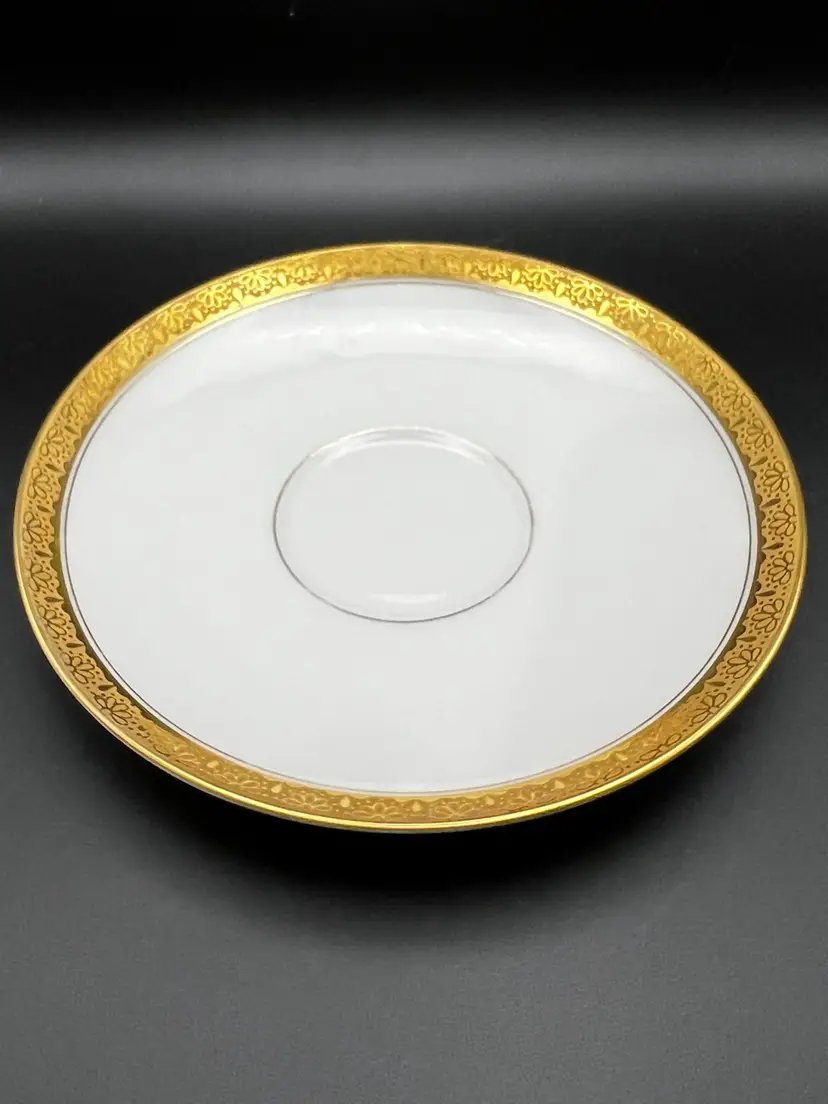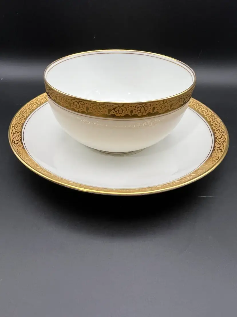 This two-piece tea cup and saucer set from Limoges, France is a vintage item that exudes elegance. The intricate floral pattern in white, painted with gold accents on fine china, makes it a great addition to any collector's kitchen or dining room. Perfect for hot beverages, this original French piece is sure to impress.