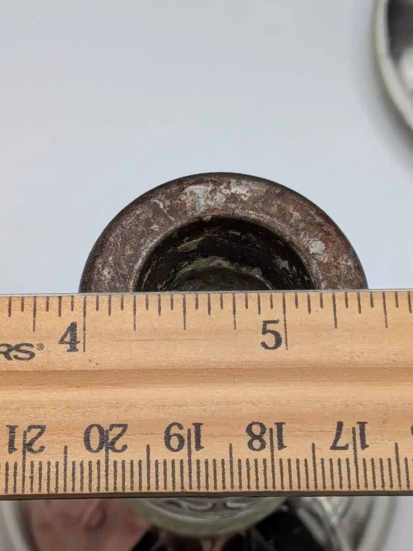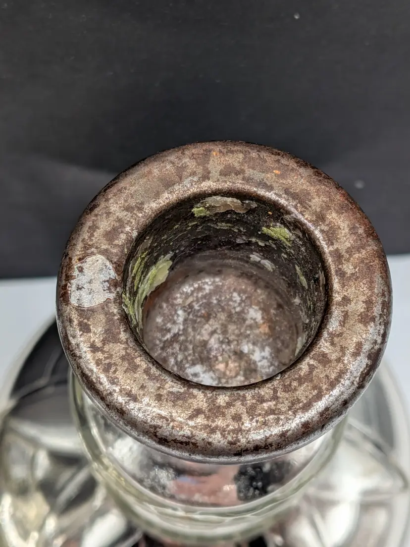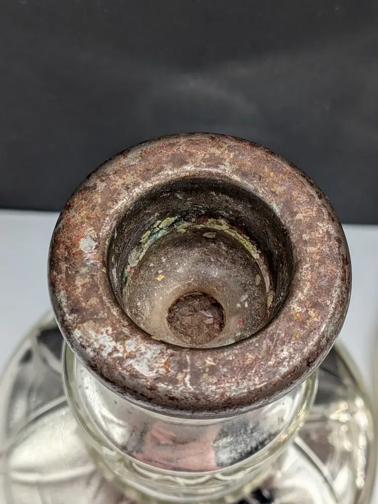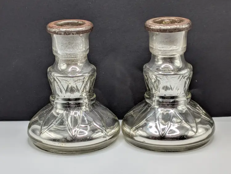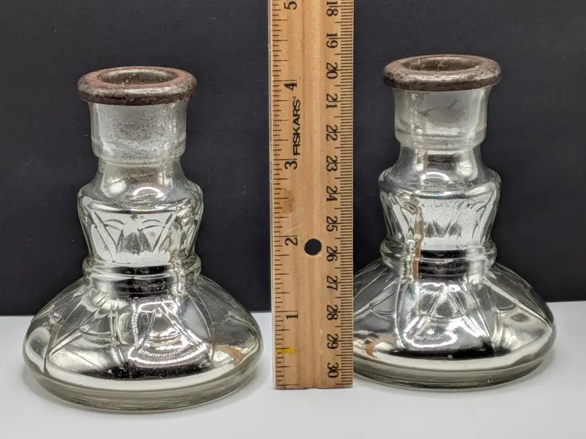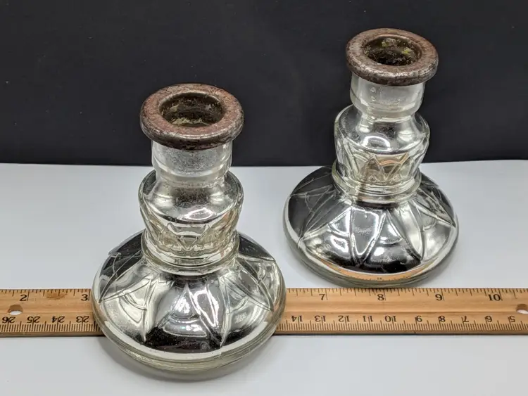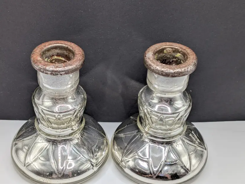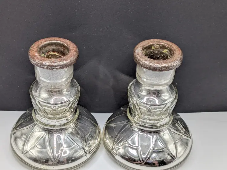 As shown and described in the live auction/listing photos *clear glass over mercury glass *rusty metal inserts for candle sticks *100+ years old *pressed glass design *hollow *Measures roughly 4.25" tall × 3.25" wide
