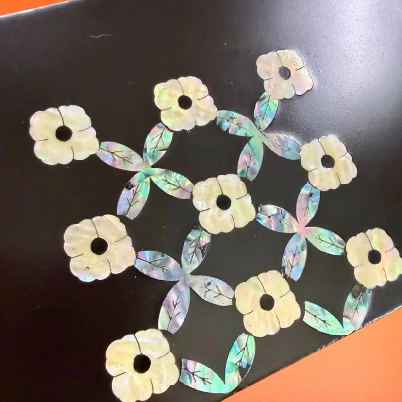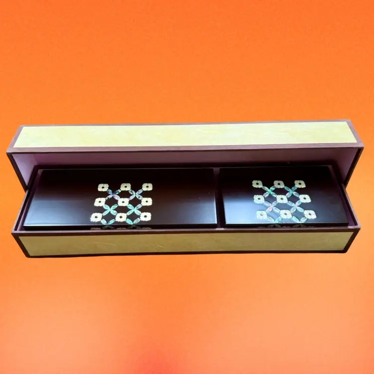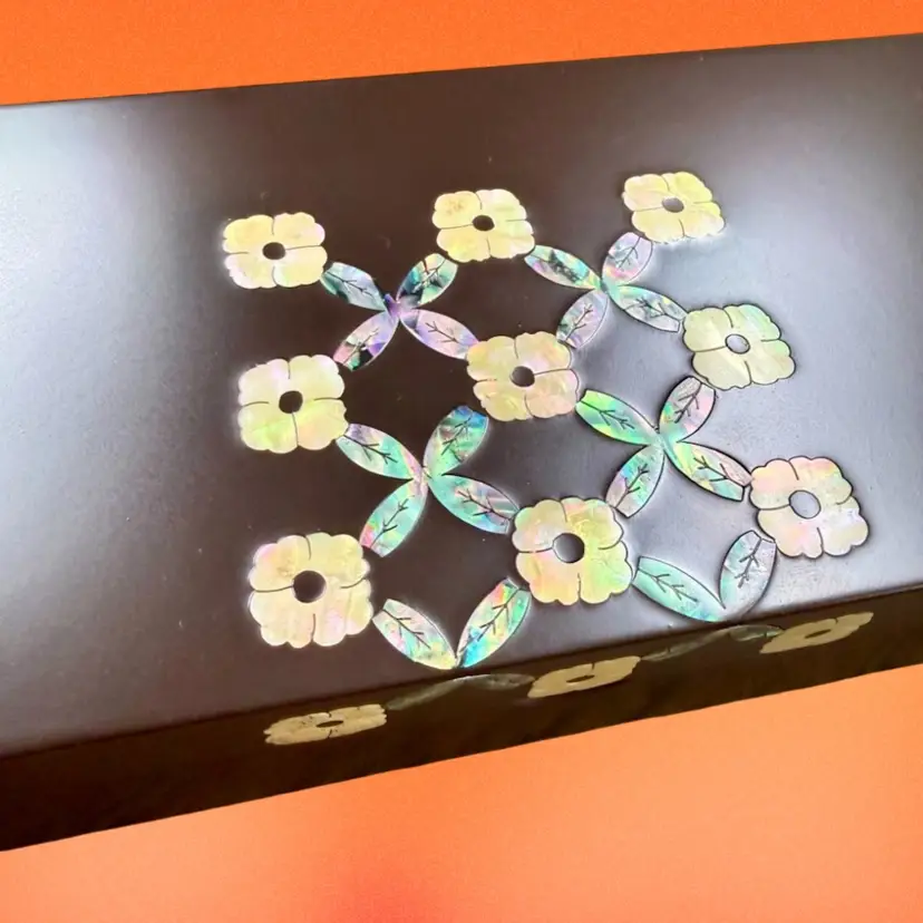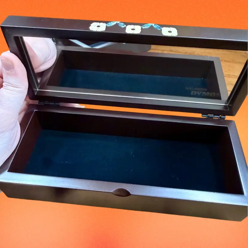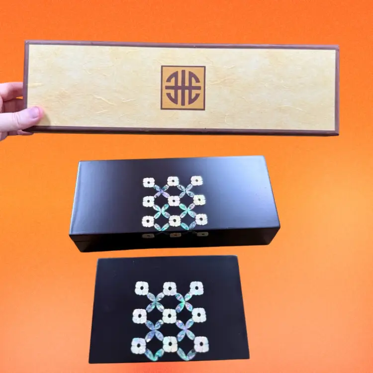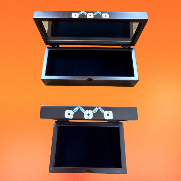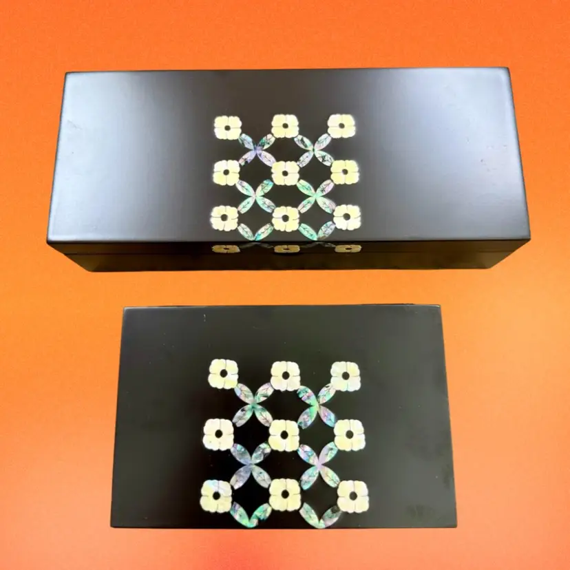 Larger box: 7.5"x2"x3" Smaller box: 4.75"x2"x3" Listing is for TWO beautifully crafted Korean wood lacquer boxes with abalone shell/mother of pearl inlay. The matching designs are a simplistic yet elegant floral design (I believe a traditional Korean design). Each box has a hinged lid, mirror set in the lid, and a soft velvet lining. Boxes would be great for jewelry, watches, etc. mirrors have “Hyundai Dymos” etched in the corner - perhaps they were once a work gift? They are great quality. Come with original box.