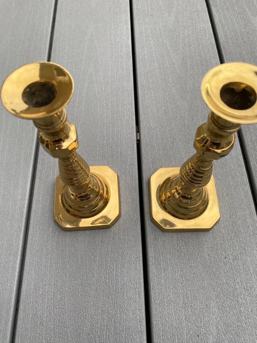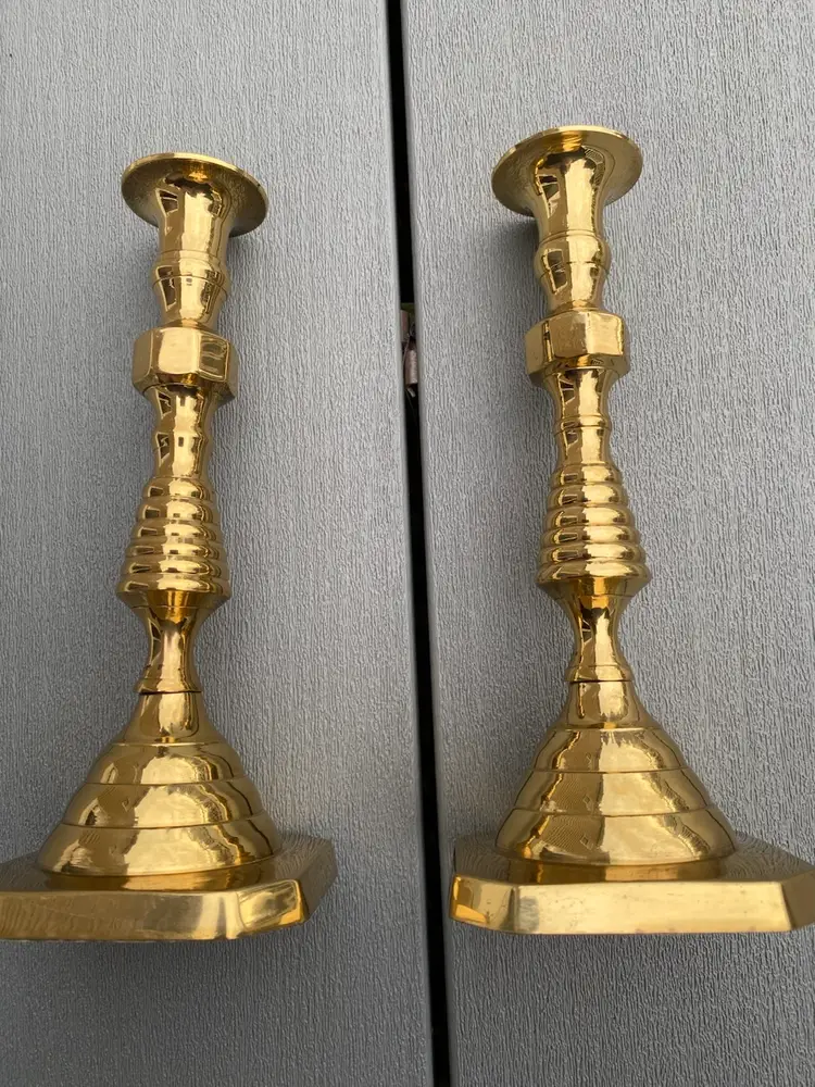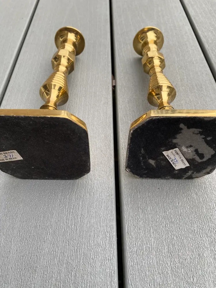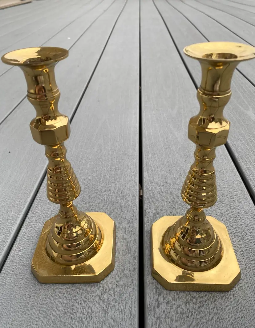 BEAUTIFUL!!! PAIR OF VINTAGE BALDWIN BRASS BEEHIVE CANDLE HOLDERS in great vintage condition. These are solid and extremely heavy. Made in India, these shiny brass candle holders feature the classic beehive pattern and measure approximately 8” high and the base is about 3 1/2” square. These very collectible candle holders will add a lovely touch to any home.