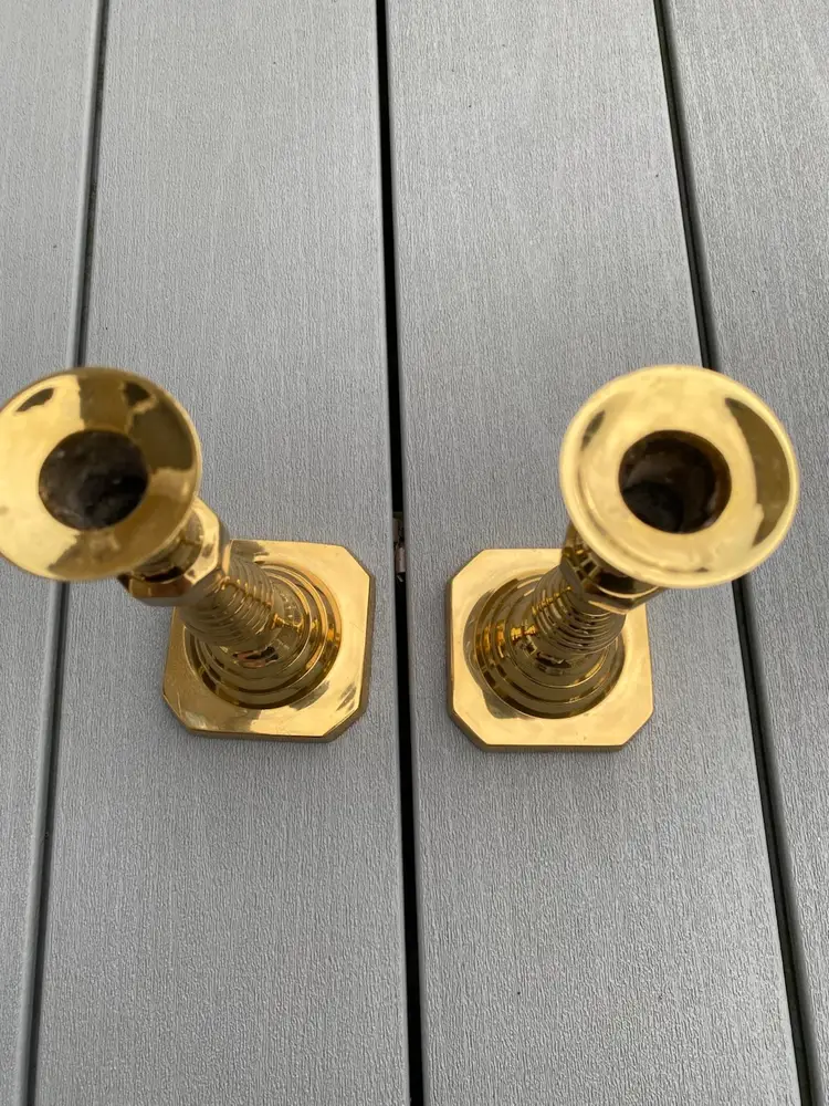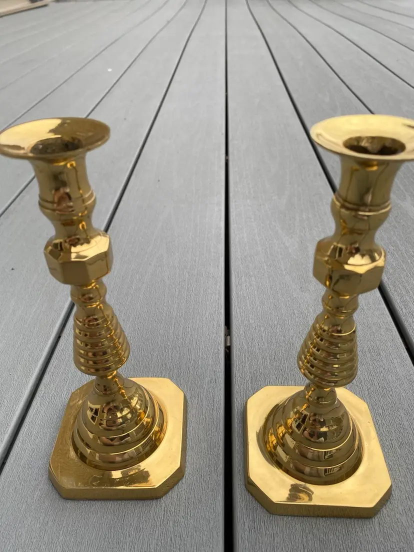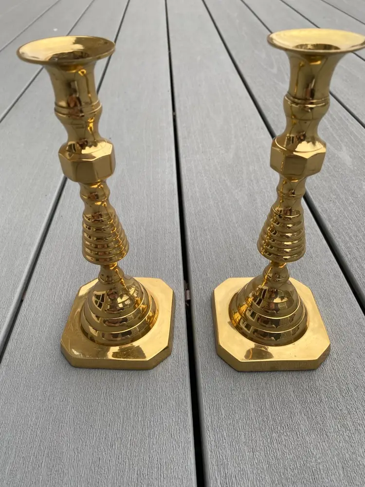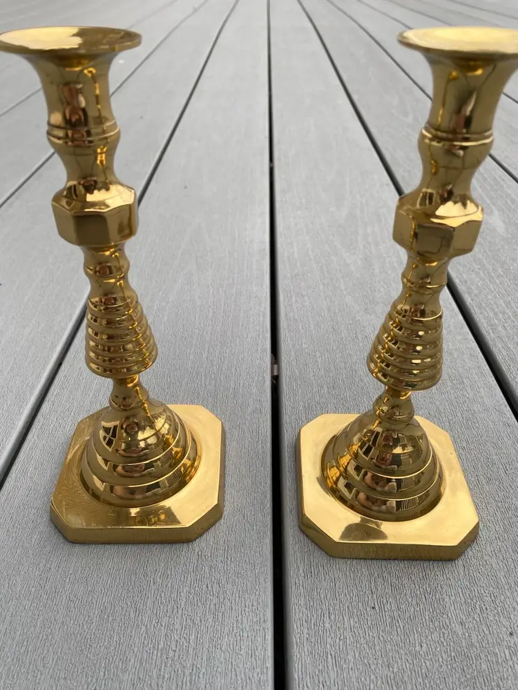 BEAUTIFUL!!! PAIR OF VINTAGE BALDWIN BRASS BEEHIVE CANDLE HOLDERS in great vintage condition. These are solid and extremely heavy. Made in India, these shiny brass candle holders feature the classic beehive pattern and measure approximately 8” high and the base is about 3 1/2” square. These very collectible candle holders will add a lovely touch to any home.