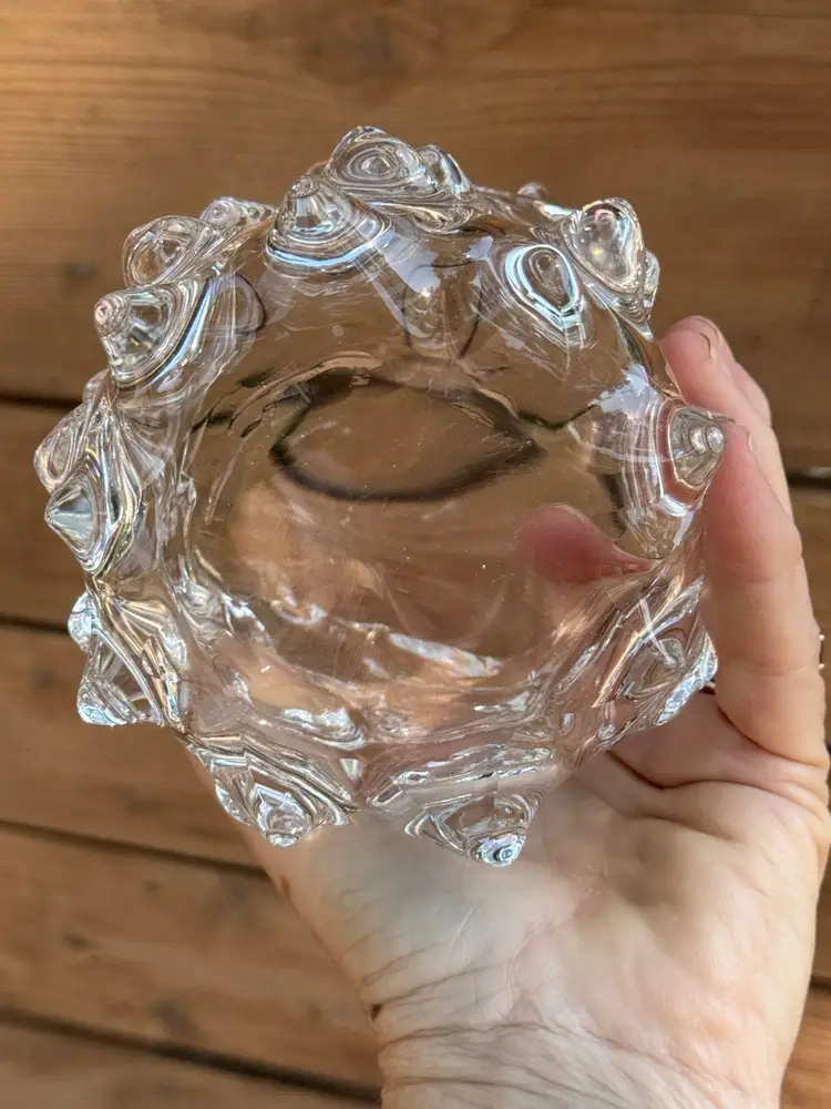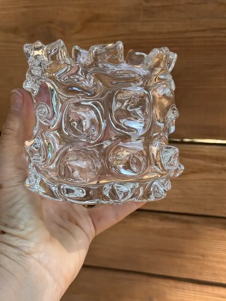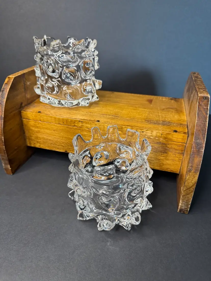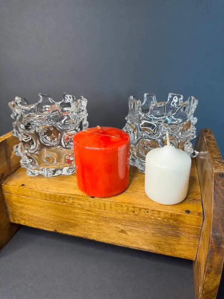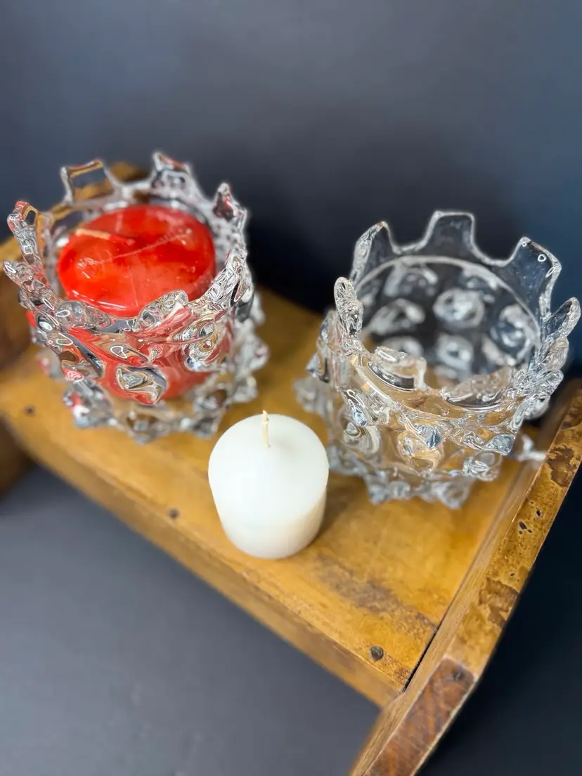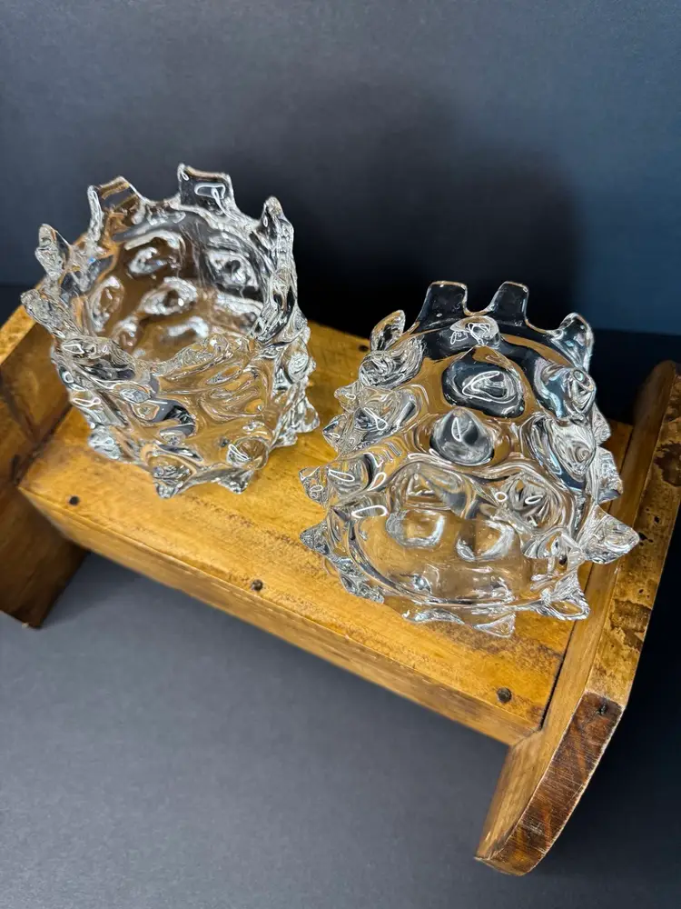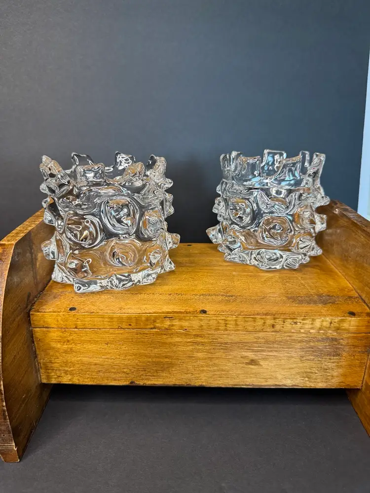 These are abstract/brutalist in Italian design and crystal clear glass with a beautifully polished bottom. In excellent condition with no chips/bruises, etc. Substantial in weight and clarity measuring 4"x4". Candles are not included but added for identification of size and use. Research identifies these two pieces very specifically and would be an eclectic addition to a glass collection.
