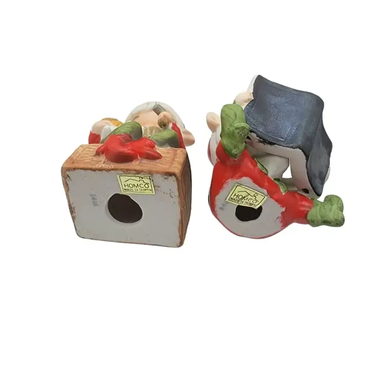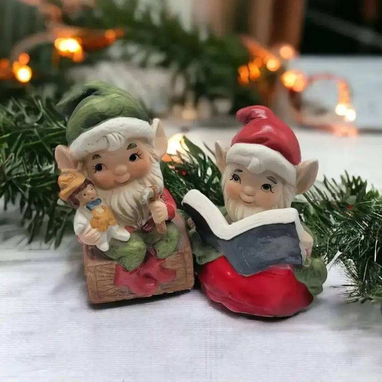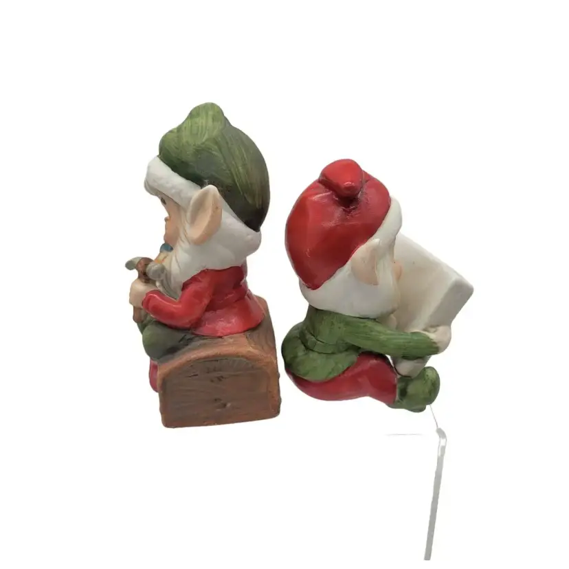 This is set of bisque HOMCO Christmas elves. One is reading a book, the other is holding a hammer and a doll.