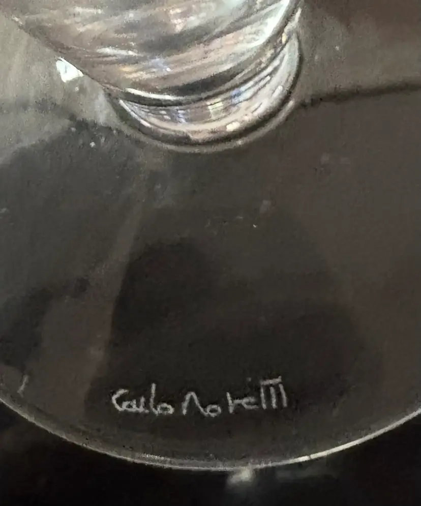 Named after its paper-cone shape ("cartoccio" in Italian), this pair of wine glasses was designed by Carlo Moretti in 1983. These mouth-blown Murano glasses feature geometric etchings made by hand using a diamond grind and entirely finished by hand. They measure approximately 5.25” high and 2.75” wide across the top. They are both signed and are in excellent condition with no signs of use, no chips or scratches. There is an air bubble in the base of one of the glasses as shown in the second photo. The glasses were handcrafted in Italy.