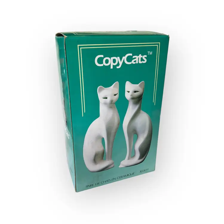 Pair of Ceramic Siamese Cat Statues. Copy Cats- 1990- in Original Box. Kitsch Figurines Retro Decor. MCM Style 12.5" tall