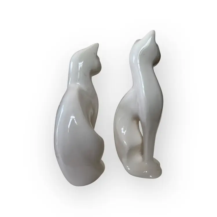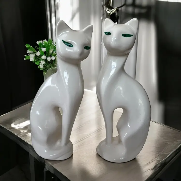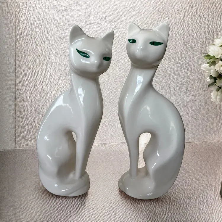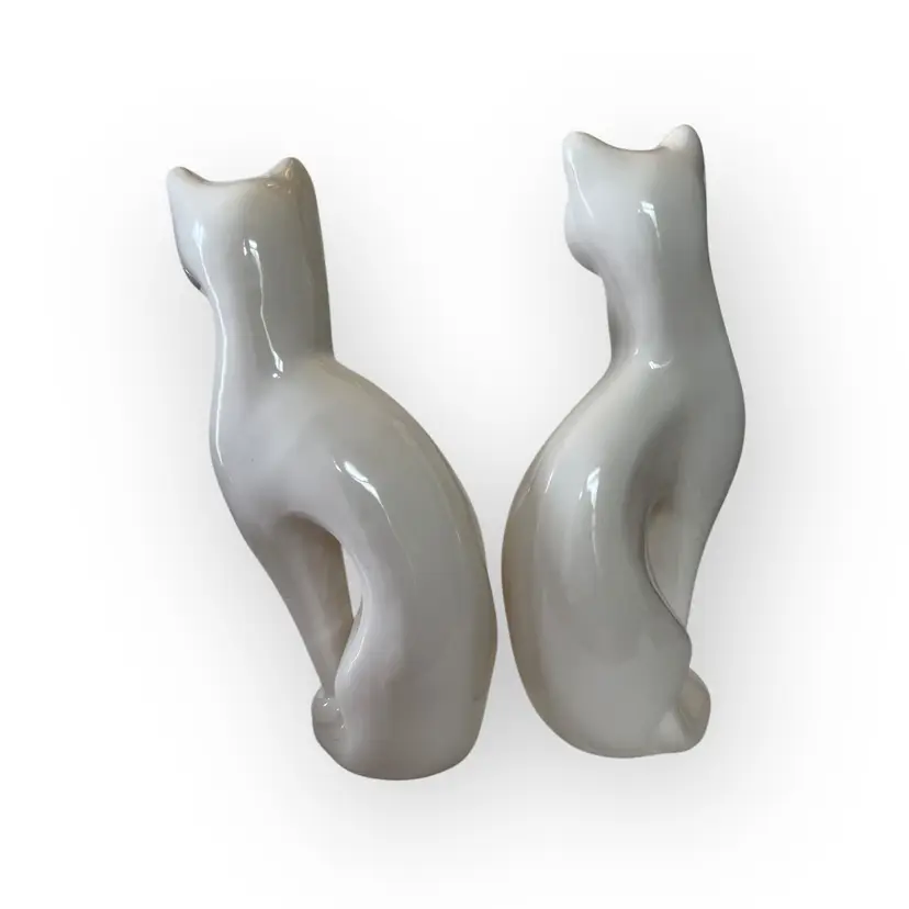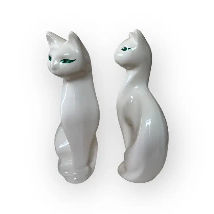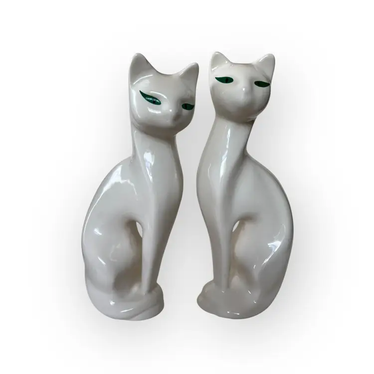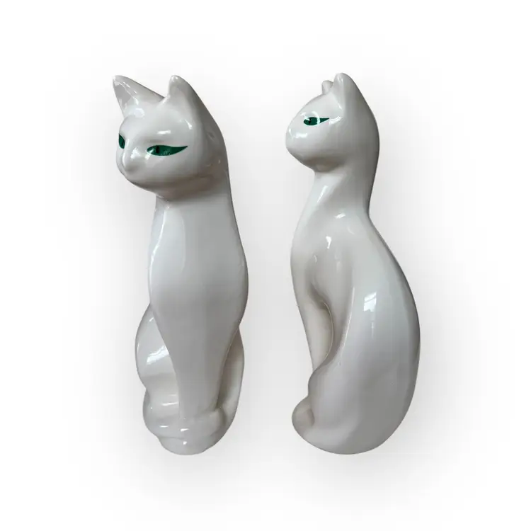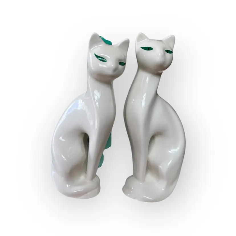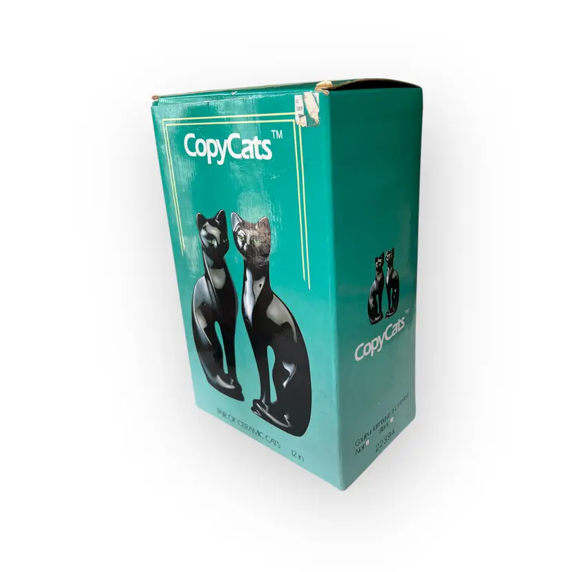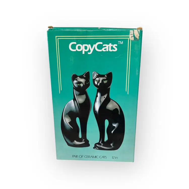 Pair of vintage ceramic cats from 1990 Copy Cats- Action industries. Comes with original box. The green eyes and sleek design give these an amazing retro MCM vibe! Approximately 12.5" tall Good vintage condition