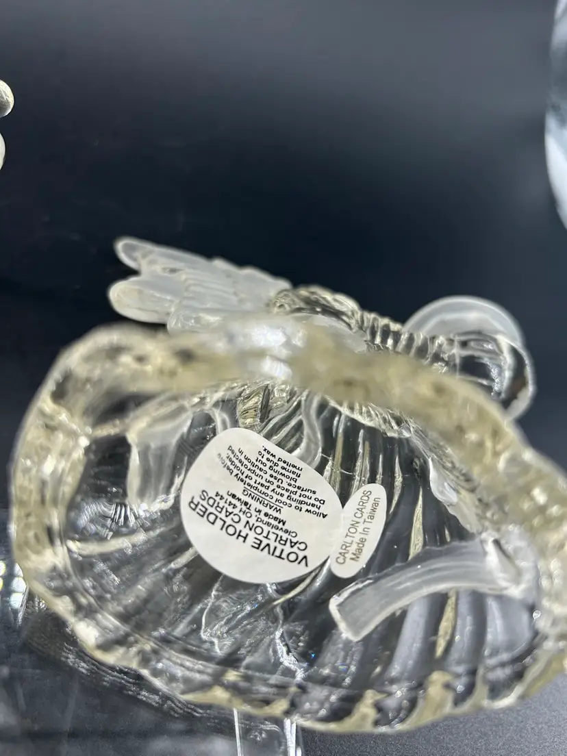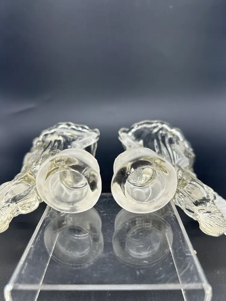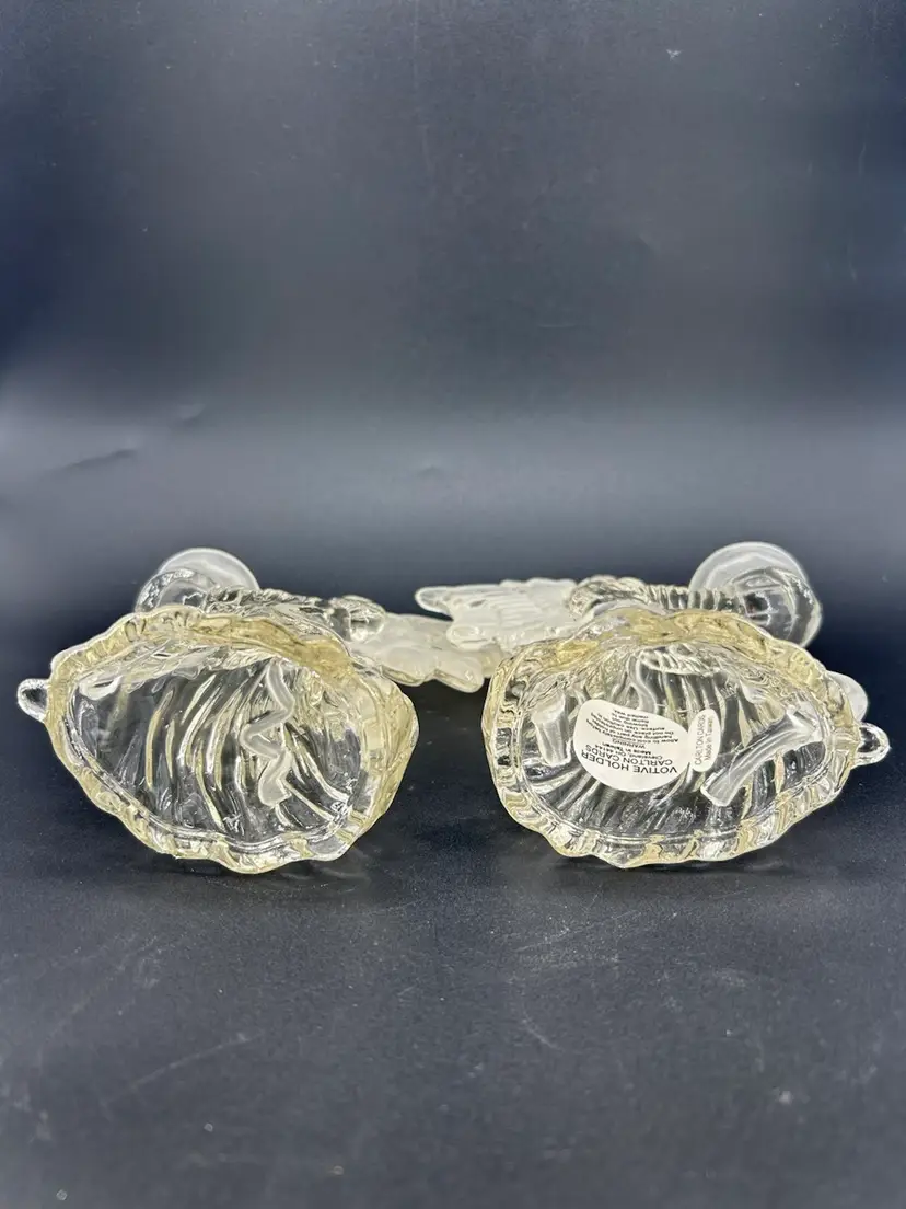 This is a pair of candle holders. They are made of clear glass with frosted accents on the wings and candle holders. They depict an angel holding up light. They stand 5 inches tall and 4 inches across the widest point.
