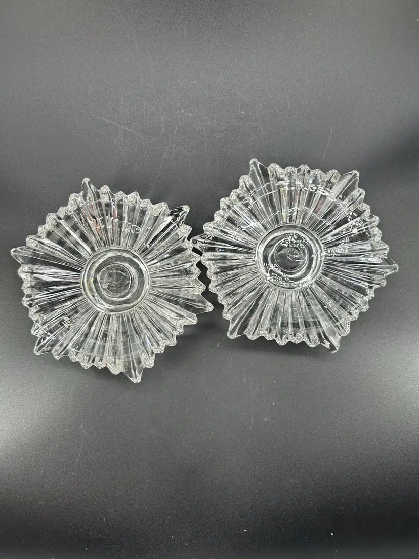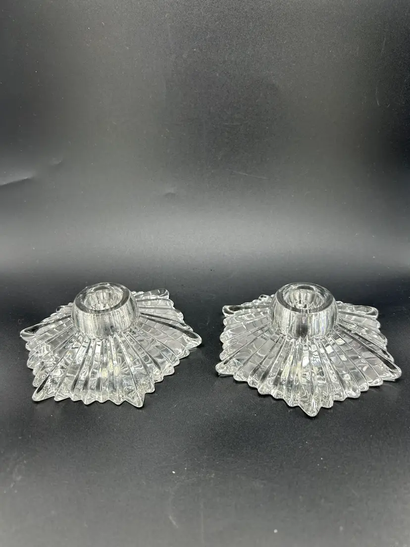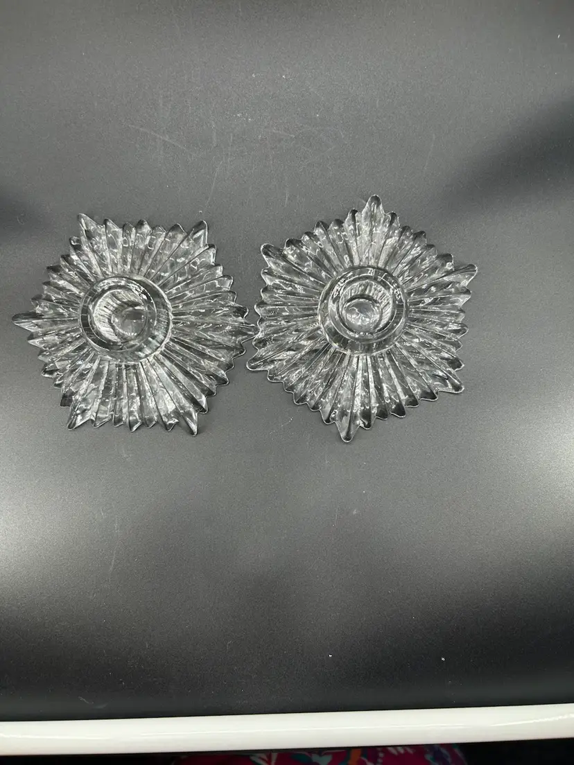 This a pair of pressed glass candleholders in a starburst motif. They are not attributed to any particular glass maker. There are no chips or cracks. They measure 4.5 inches in diameter.