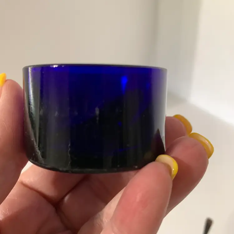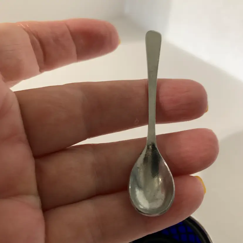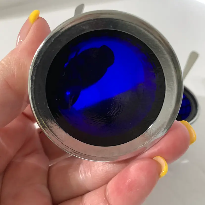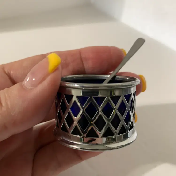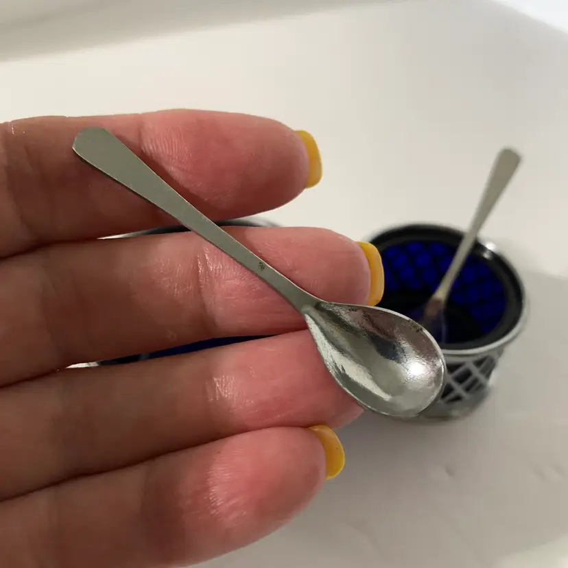 Both include a spoon. No chips or cracks. The larger one measures 2 1/8 inches wide and 1 1/4 inches tall. The smaller one measures 1 5/8 inches wide and 1 inch tall. Weighs 4 ounces. If the actual postage ends up being less than what you paid, you will be refunded for anything over one dollar.