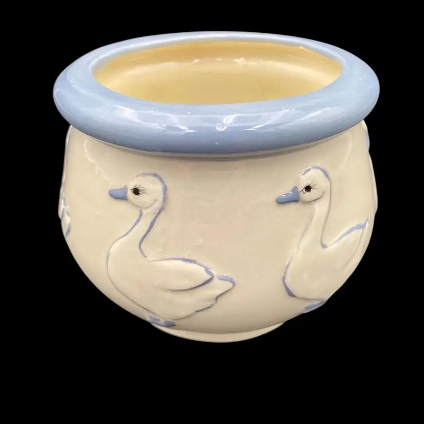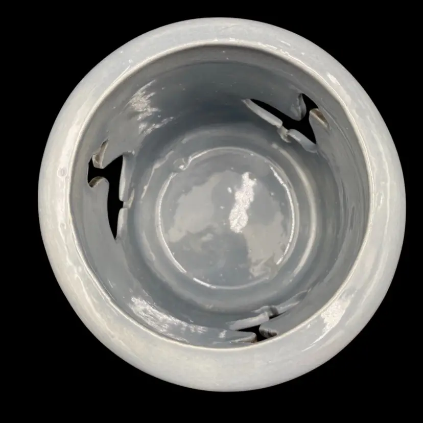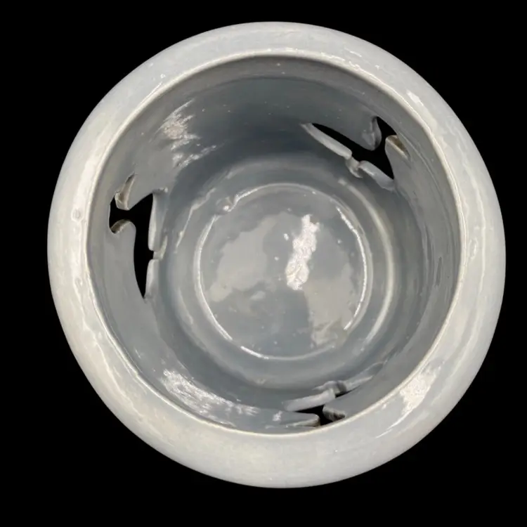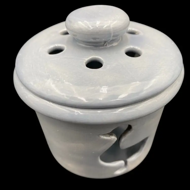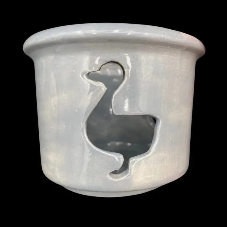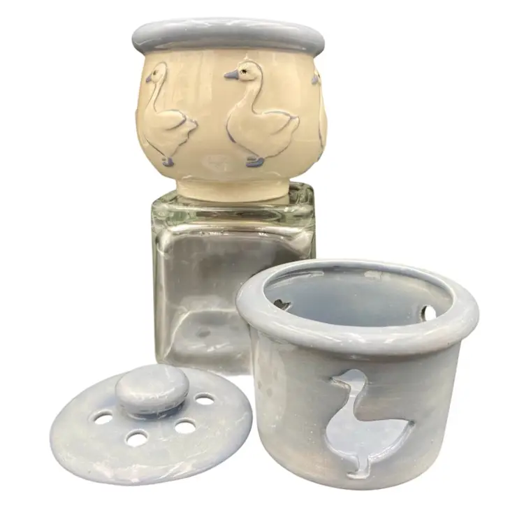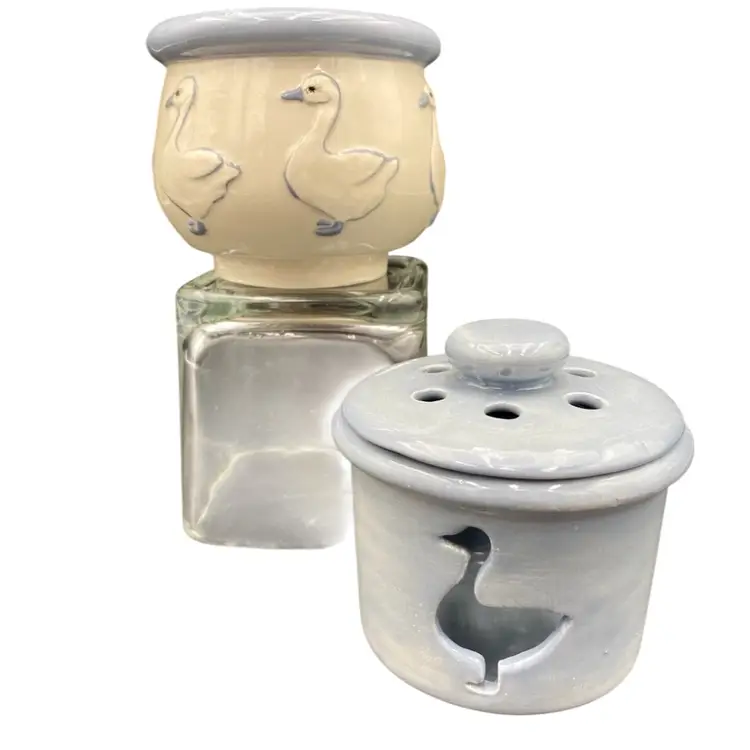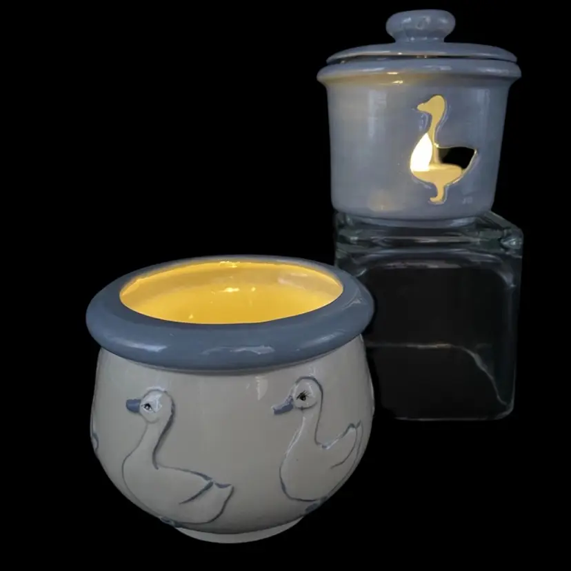 Add a whimsical touch to your home decor with this charming pair of duck ceramic candle holders. The soft blue color and embossed and reticulated features make them a perfect addition for all occasions. The first holder has embossed ducks all the way around with a solid blue lip. The second is a solid blue, has 3 cut-out ducks circling the holder, and has a lid with holes as well.
