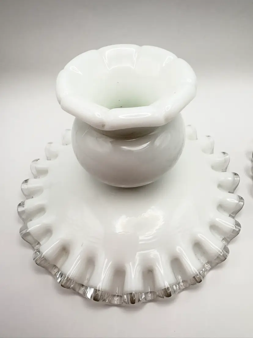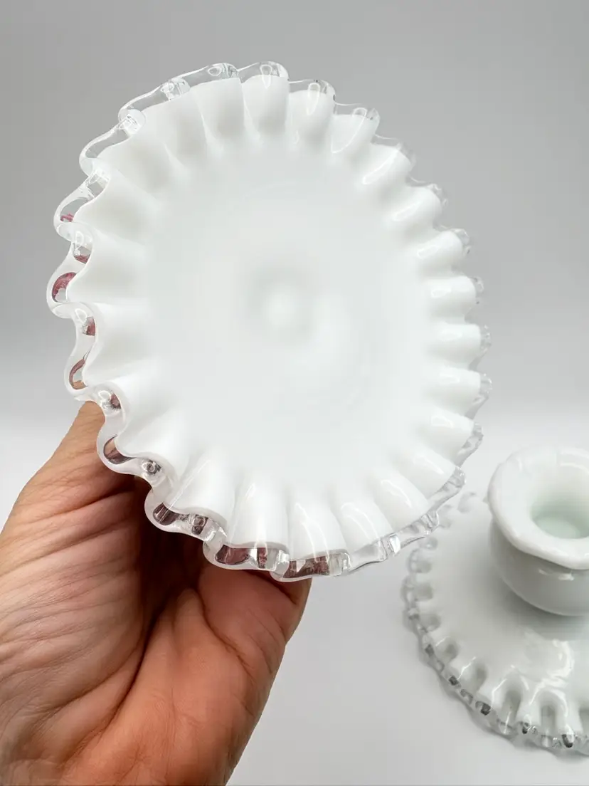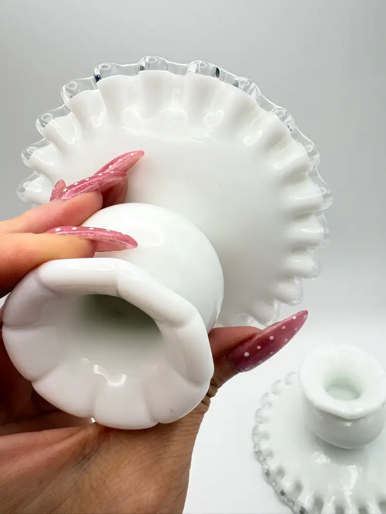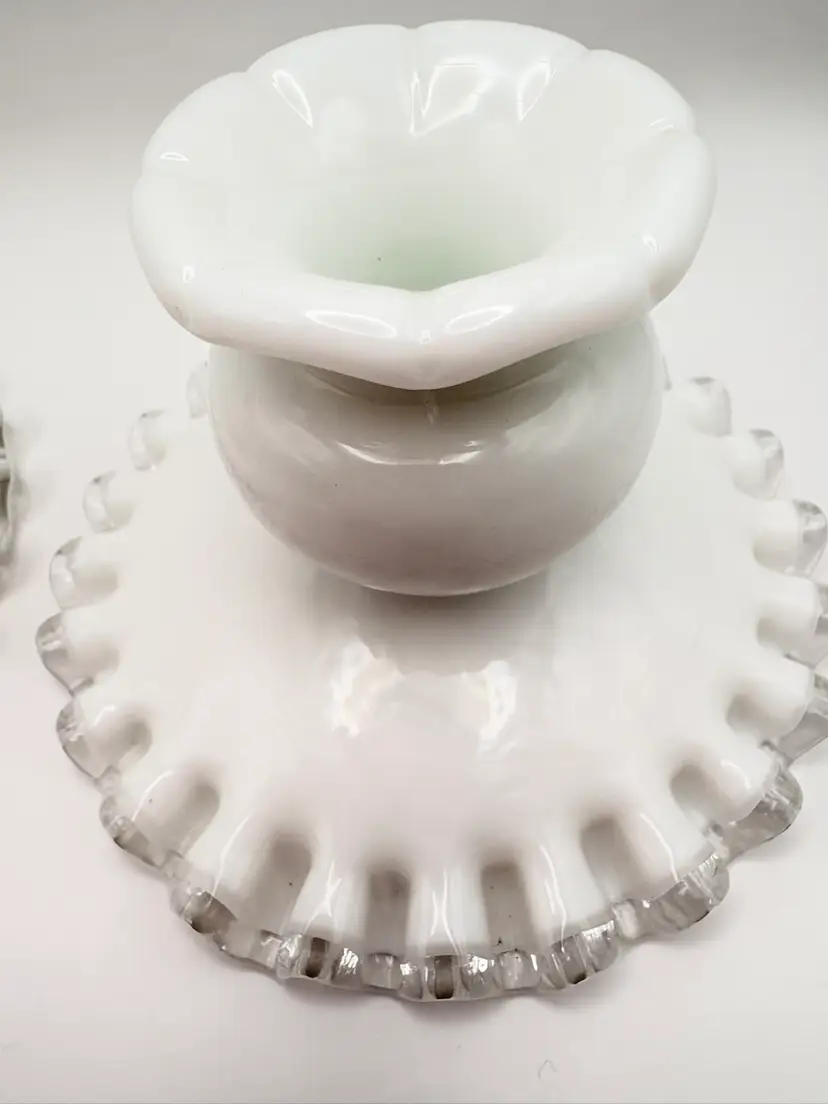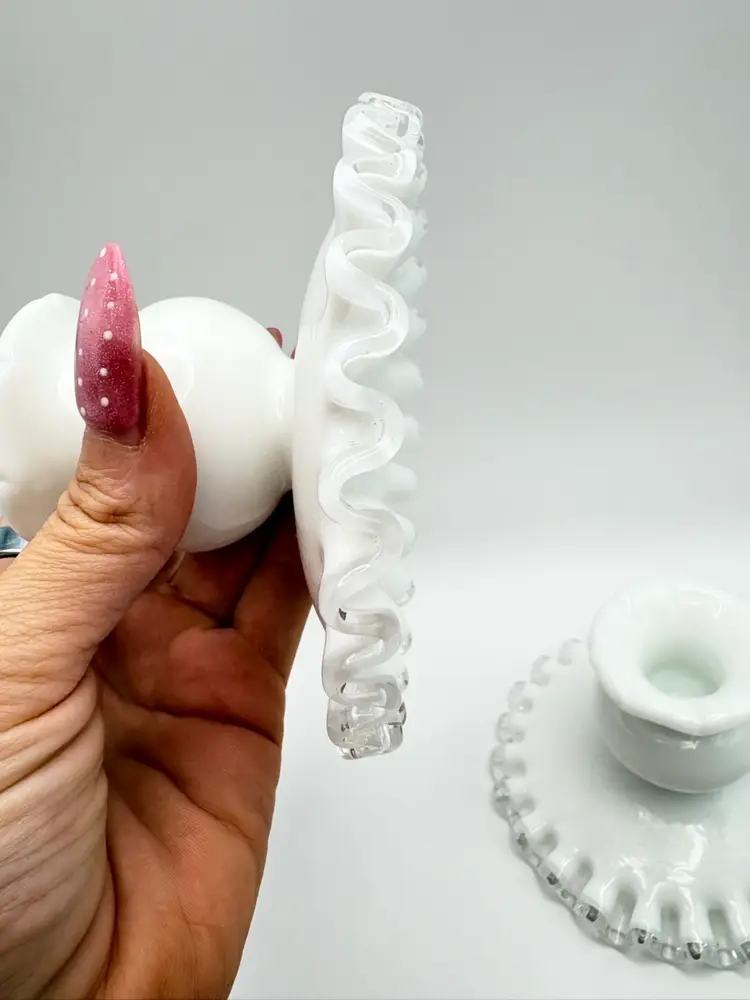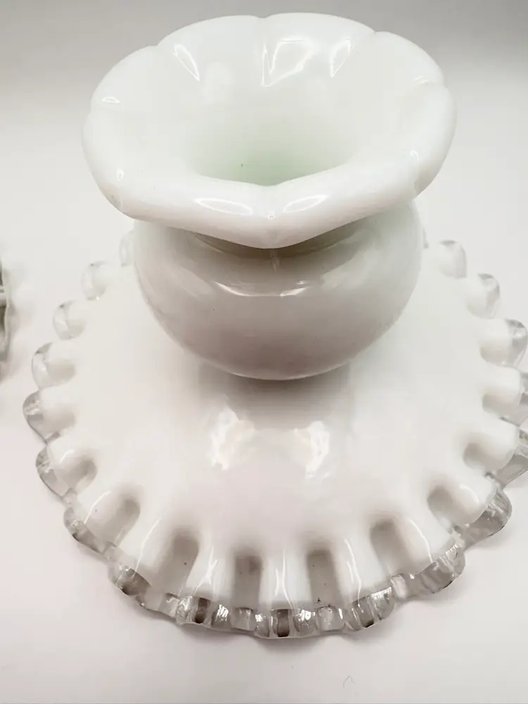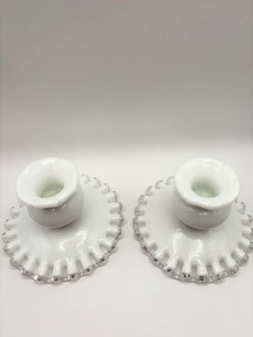 Pair Of Fenton Silver Crest Milk Glass Candlestick Holders Ribbon Detail Vintage