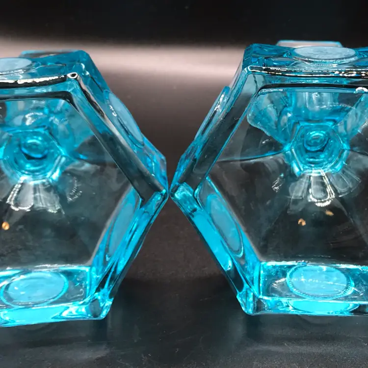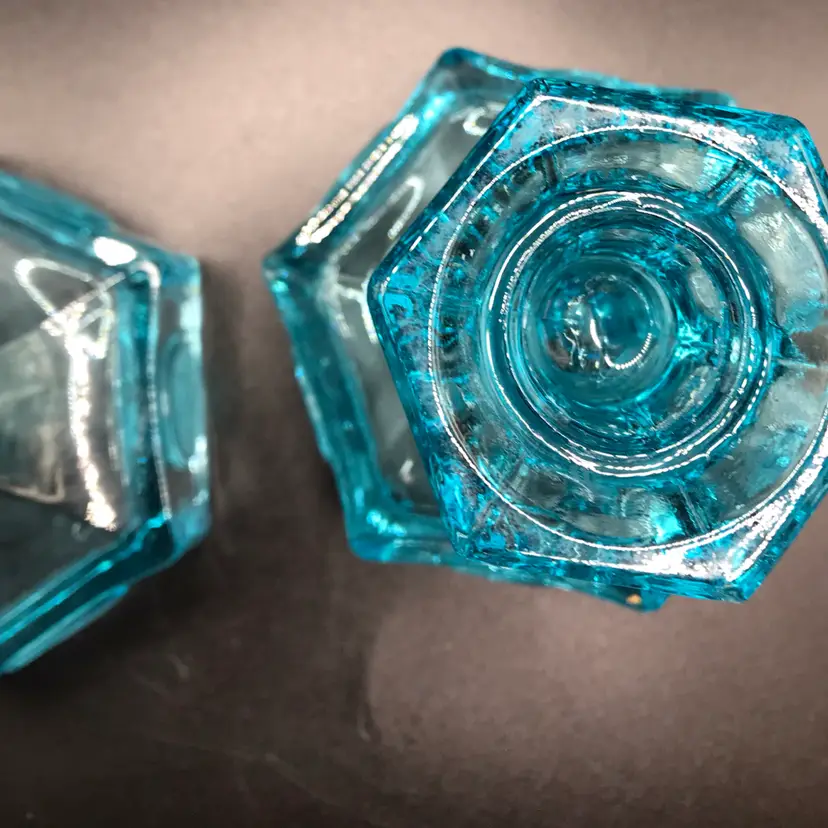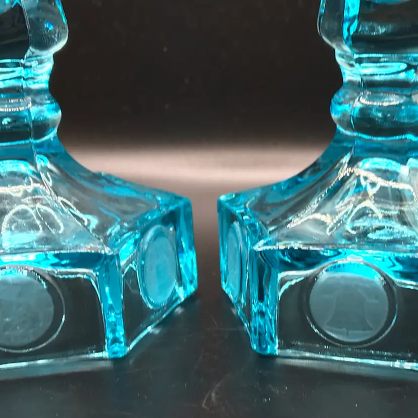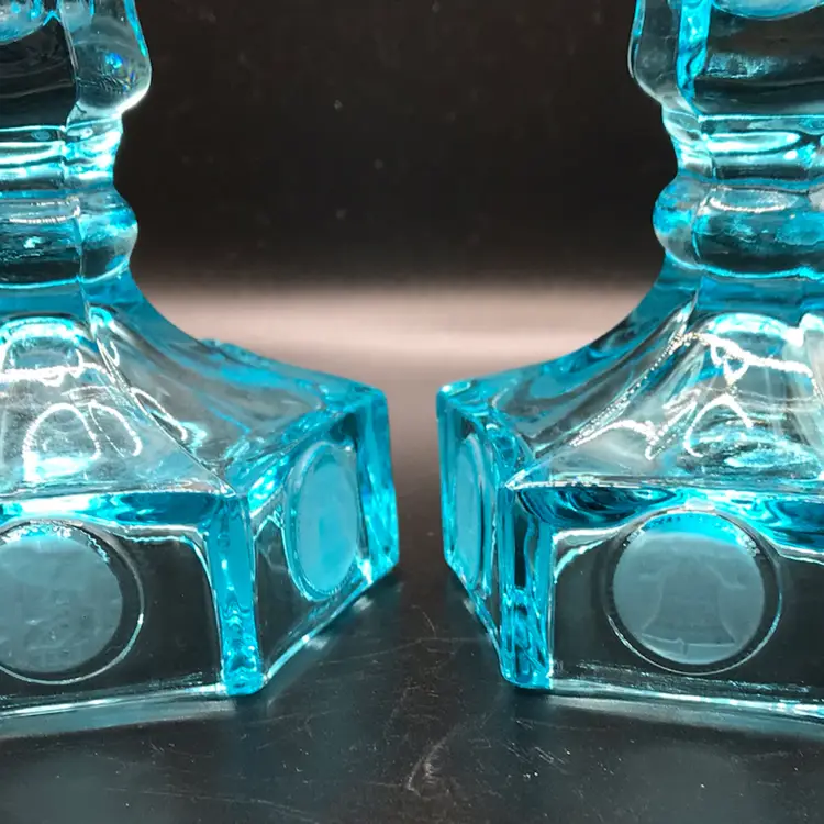 This product is a pair of Fostoria beautiful blue coin taper candle holders, made of glass with a glossy finish. The medium-sized candle holders are perfect for any occasion and can be used in any room of the house. With a colonial style, these candle holders add a touch of elegance and sophistication to your decor. Each unit includes two candle holders, making them a great addition to any collection of decorative items. No chips or cracks.