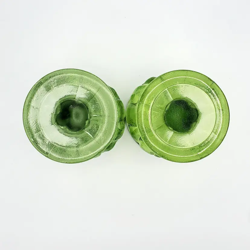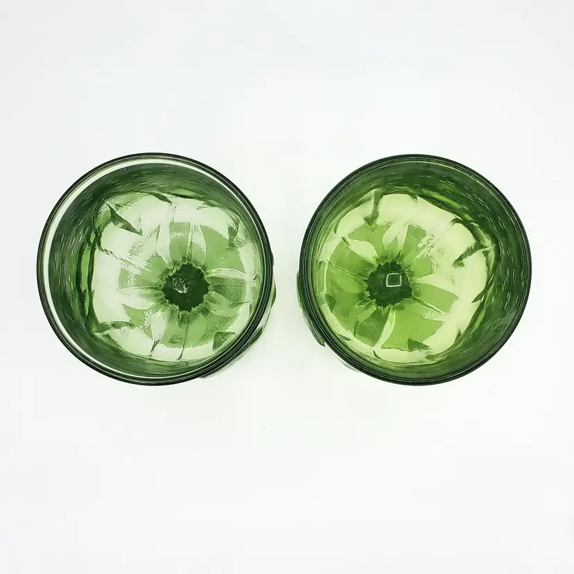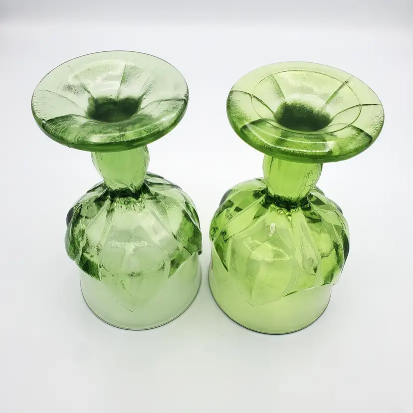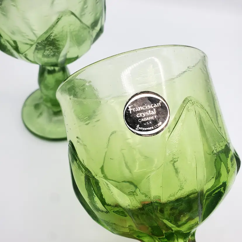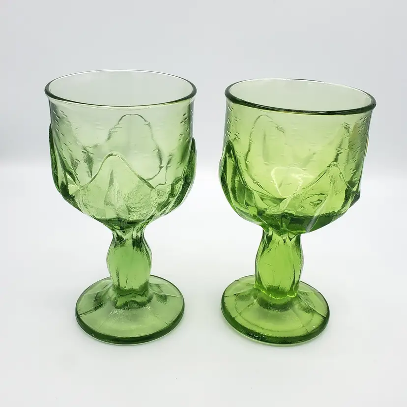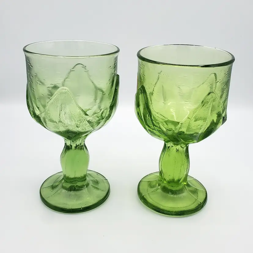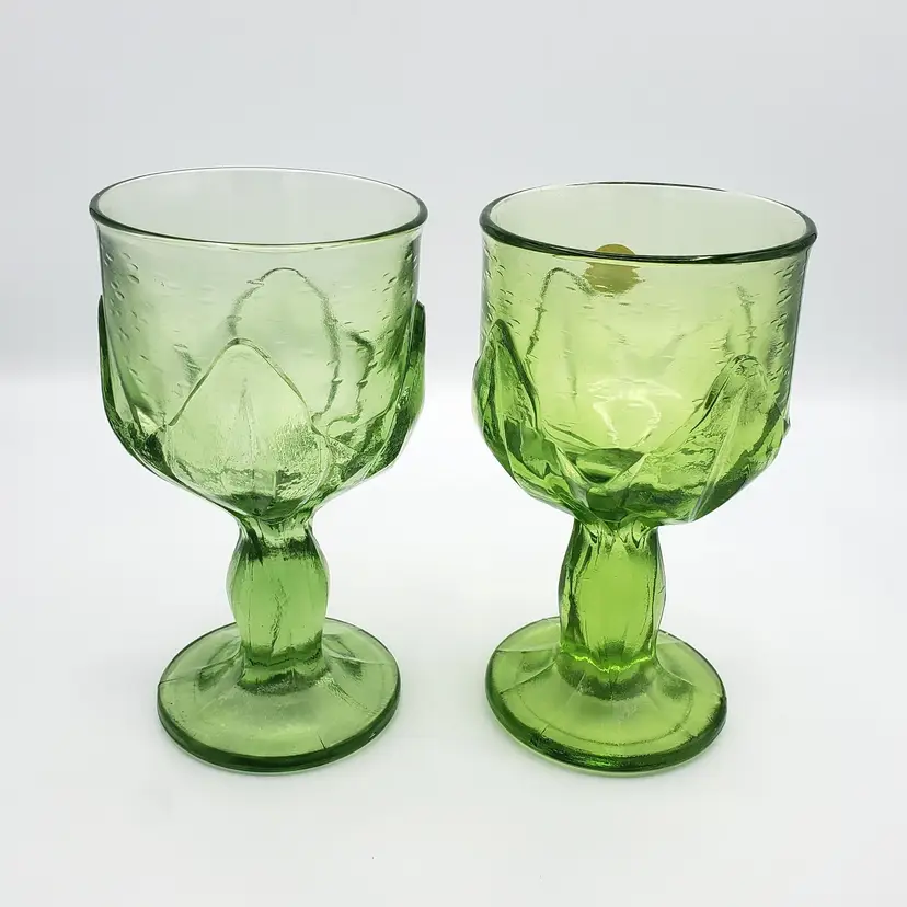 Beautiful vintage stemware with a bold leaf relief around the cup. One of the pair of these goblets still has the manufacturer label. Somehow, the two glasses have slightly different color, the one with the label is a bit more intense. There is no damage to either glass and they are heavy and durable. Thanks for looking!