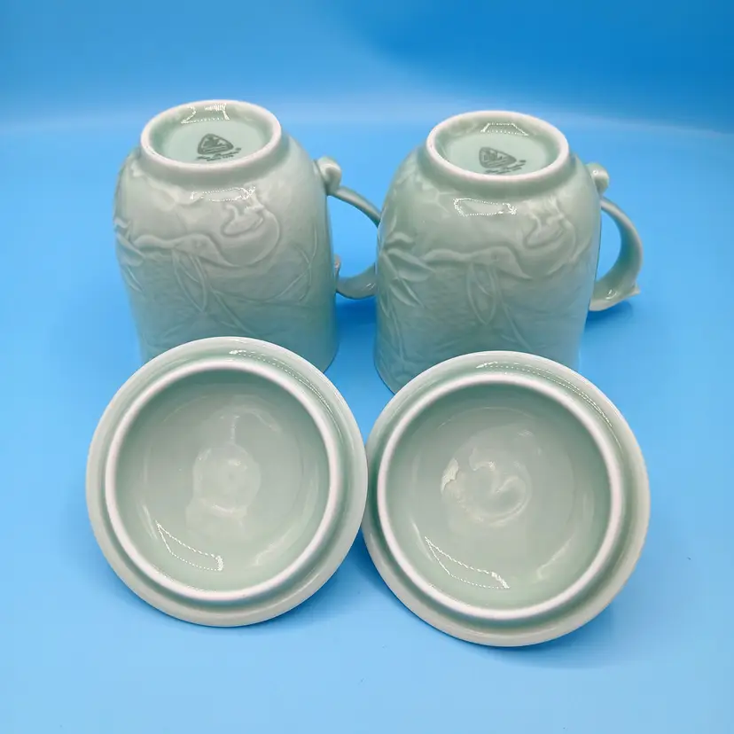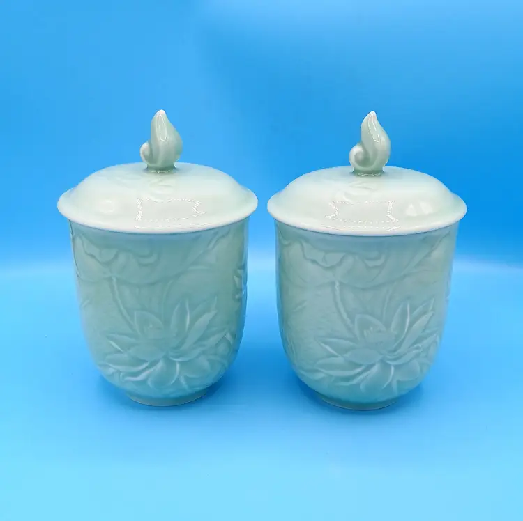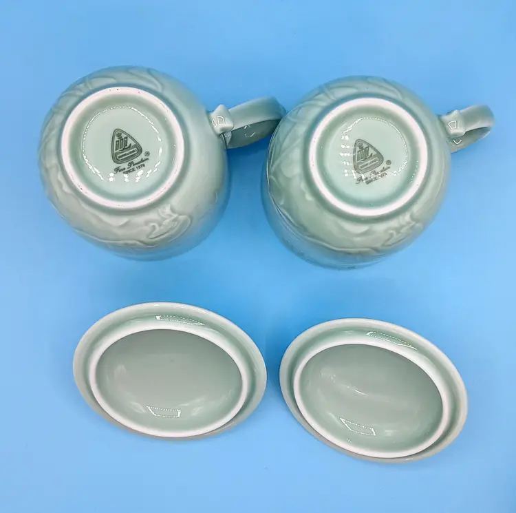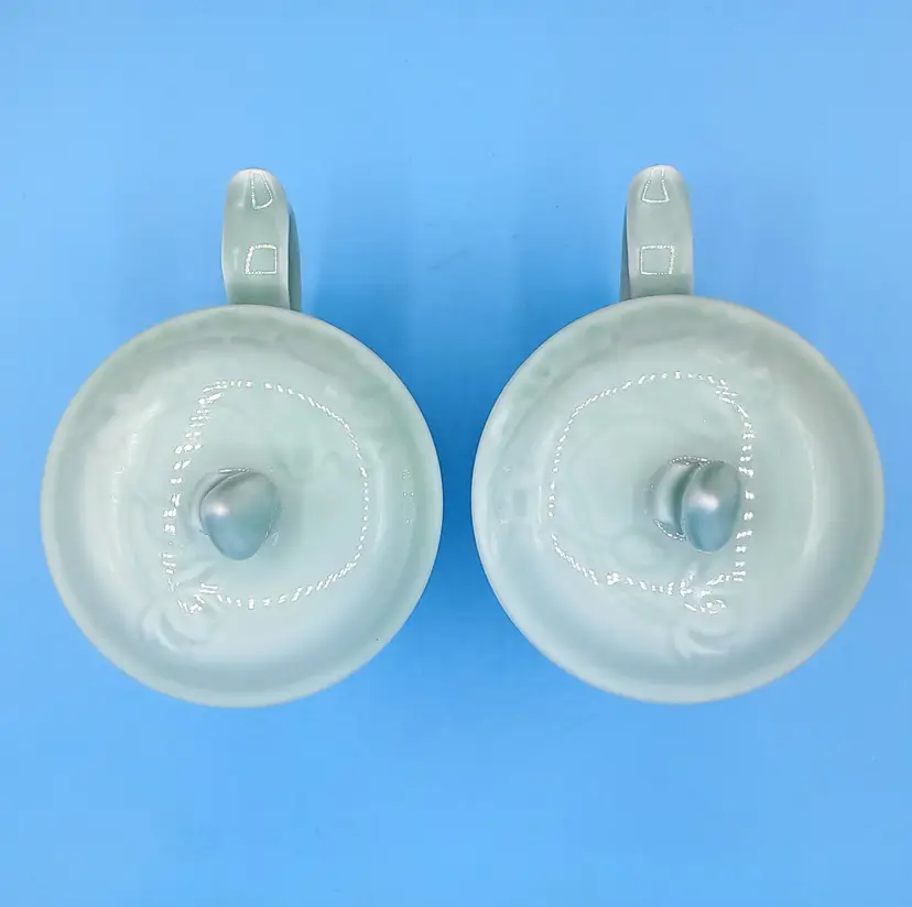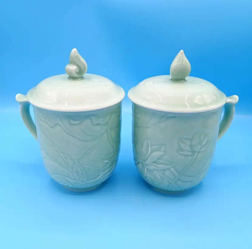 There is no damage to this pair of covered tea mugs, produced by Minn Long. The porcelain texture on these mugs is more beautiful the closer you observe it. Beautiful florals evoke a serene water scene and oop!, I even found a little frog at the bottom. Nevermind. Sale canceled! Just kidding. He is cute though. Thanks for looking!