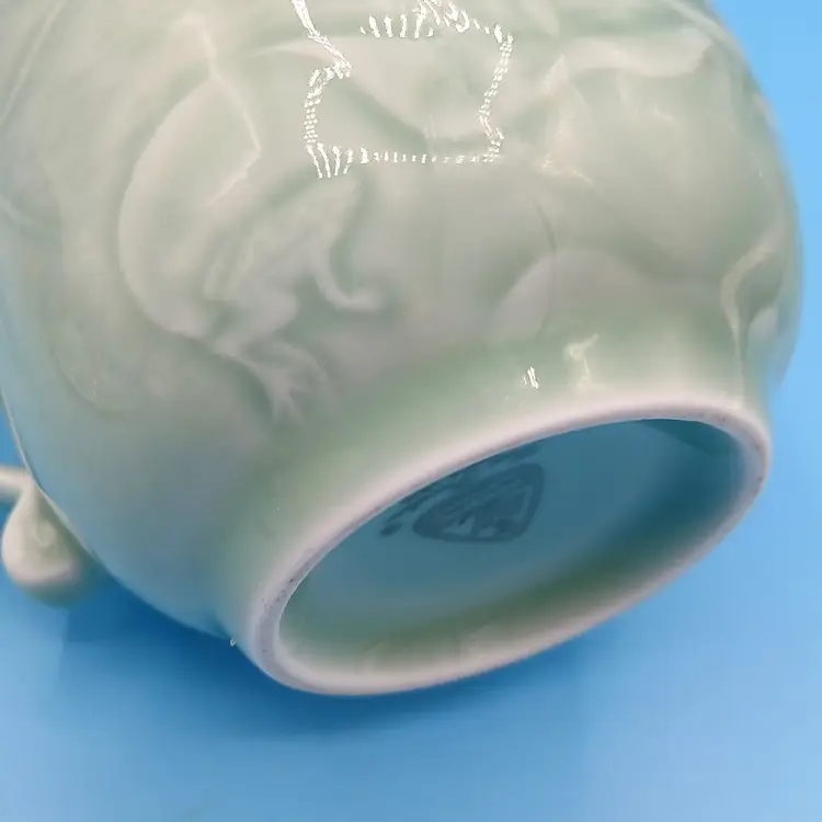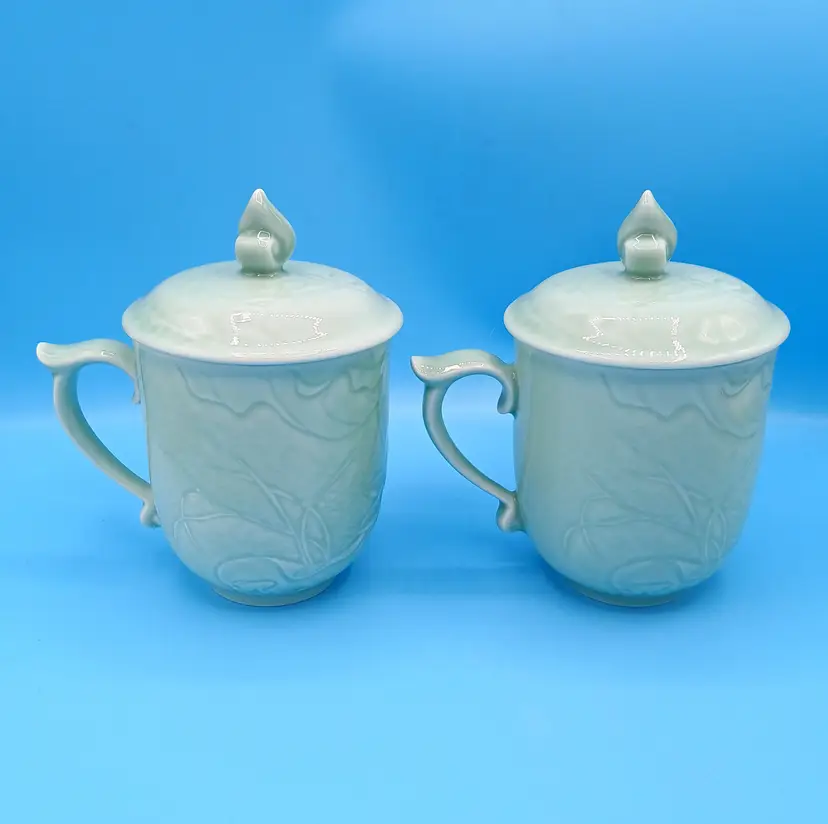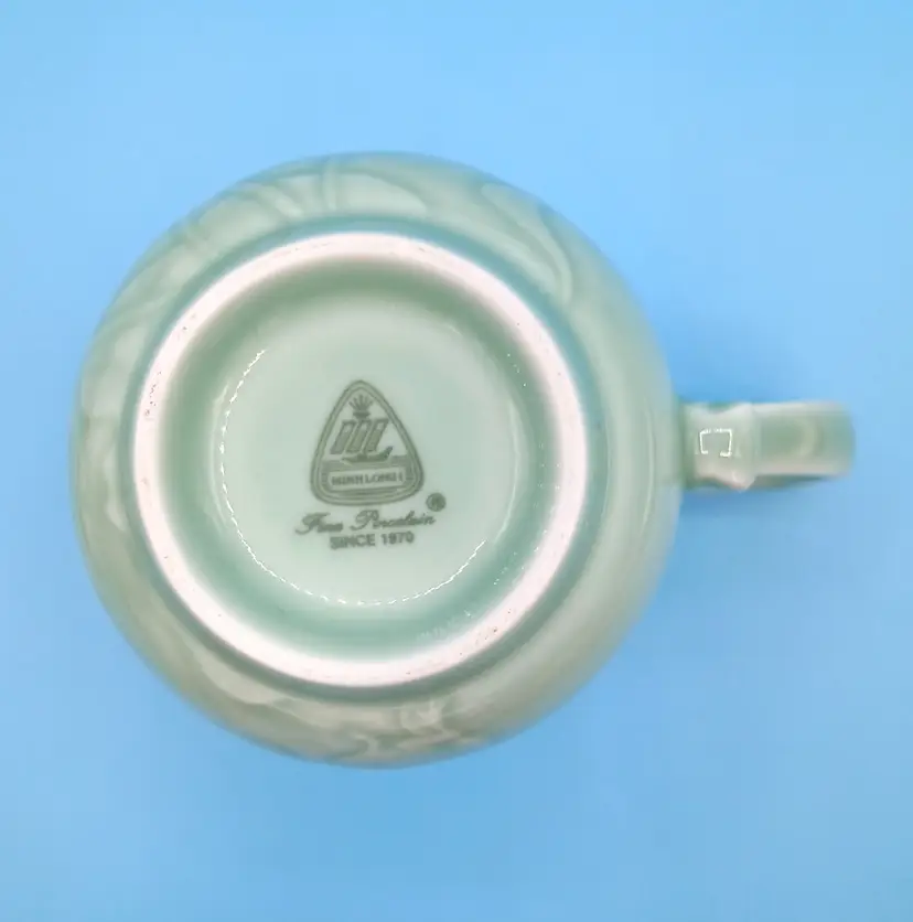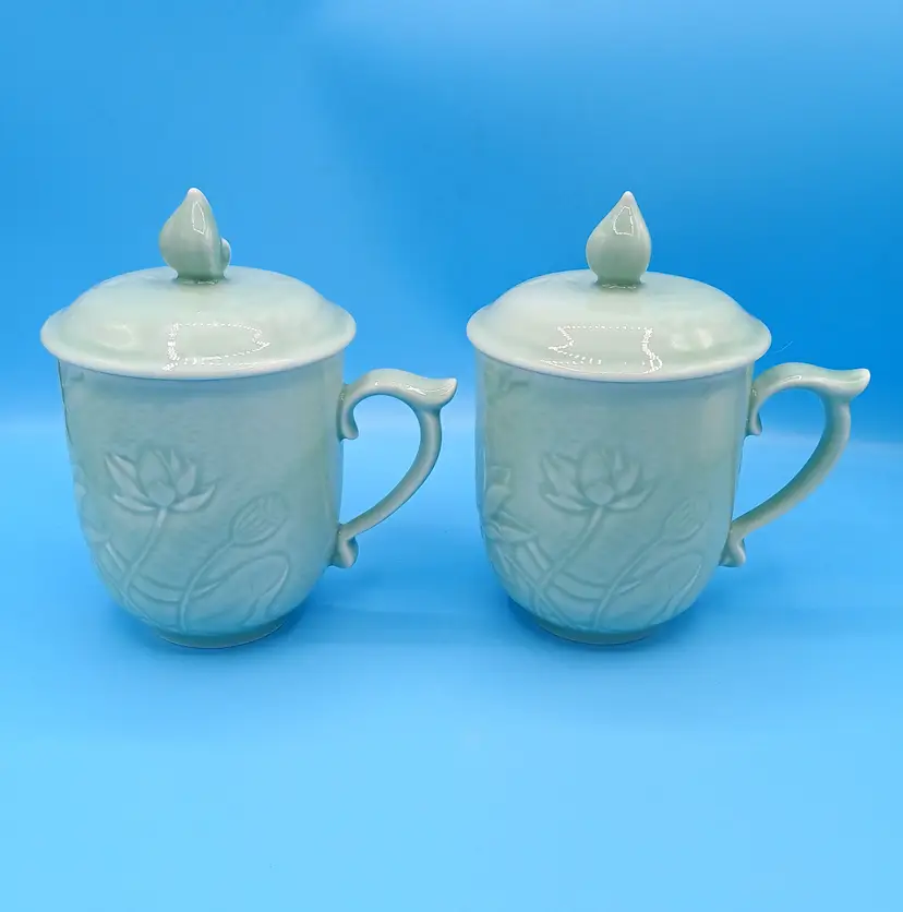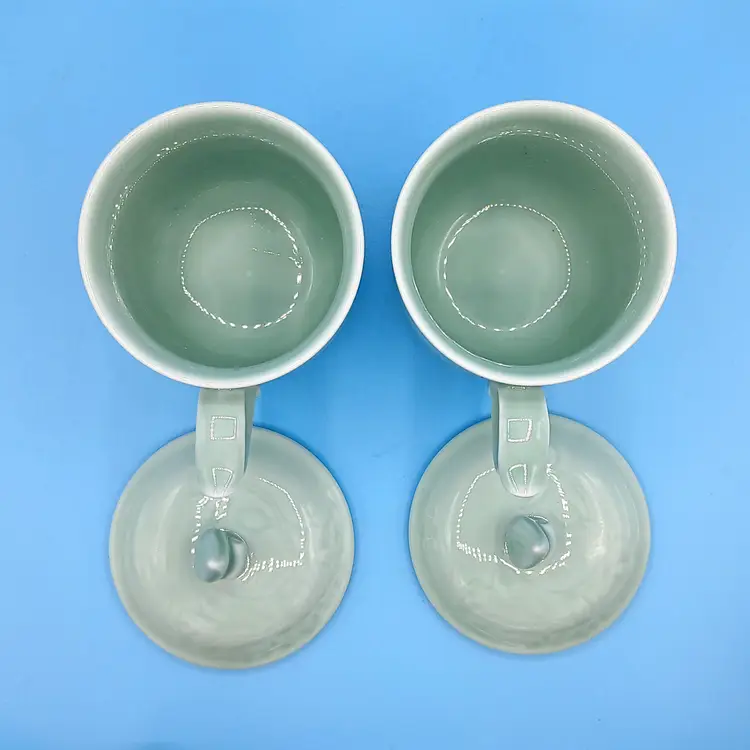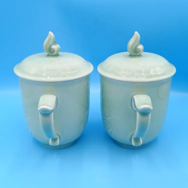 There is no damage to this pair of covered tea mugs, produced by Minn Long. The porcelain texture on these mugs is more beautiful the closer you observe it. Beautiful florals evoke a serene water scene and oop!, I even found a little frog at the bottom. Nevermind. Sale canceled! Just kidding. He is cute though. Thanks for looking!