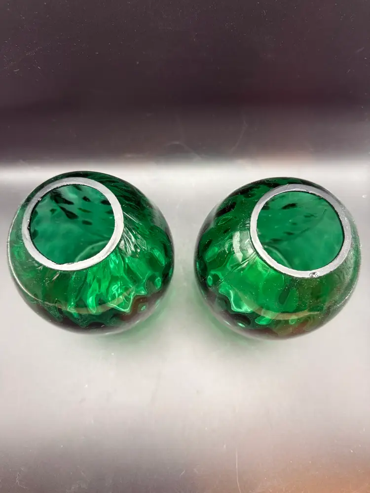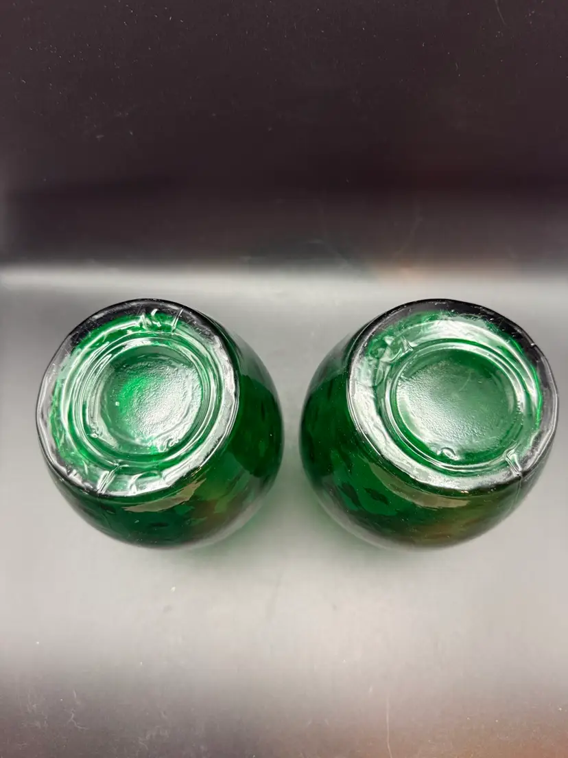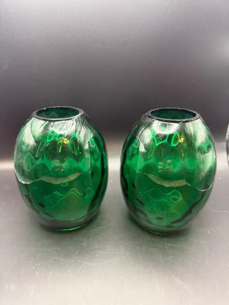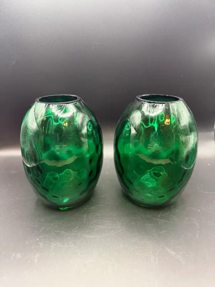 Mid-century modern (MCM) design, popular from the 1940s to the 1960s, often featured organic shapes, vibrant colors, and a blend of traditional craftsmanship with modern aesthetics. Glassware from this period frequently incorporated bold colors like emerald green and unique textures, reflecting the era's optimistic and forward-looking spirit. These vases, with their dimpled texture and rich color, align with the decorative trends of the MCM period.