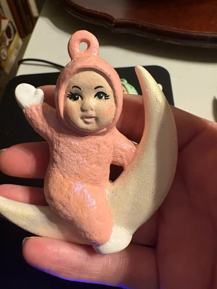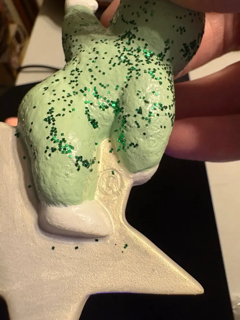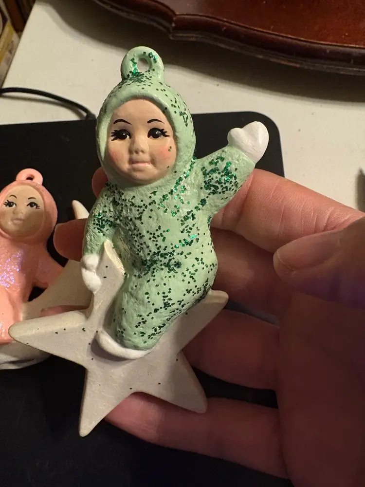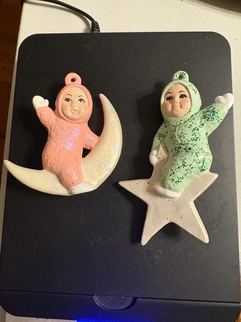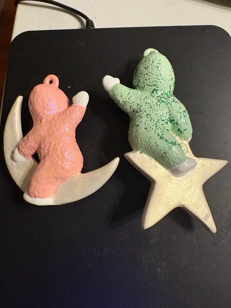Green is 4.25” tall, pink is 3.5” tall, both stamped with a “c” on back