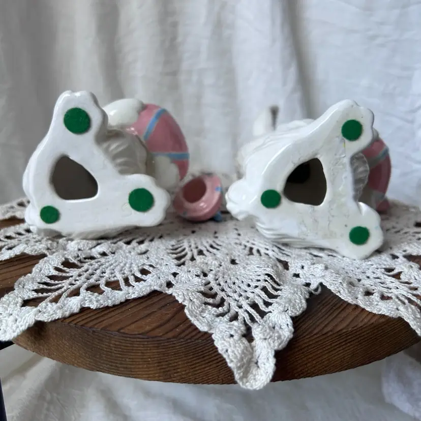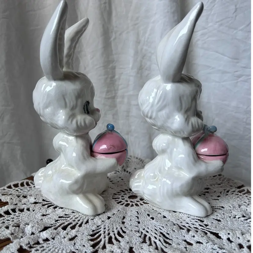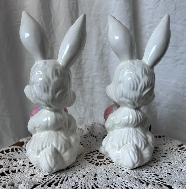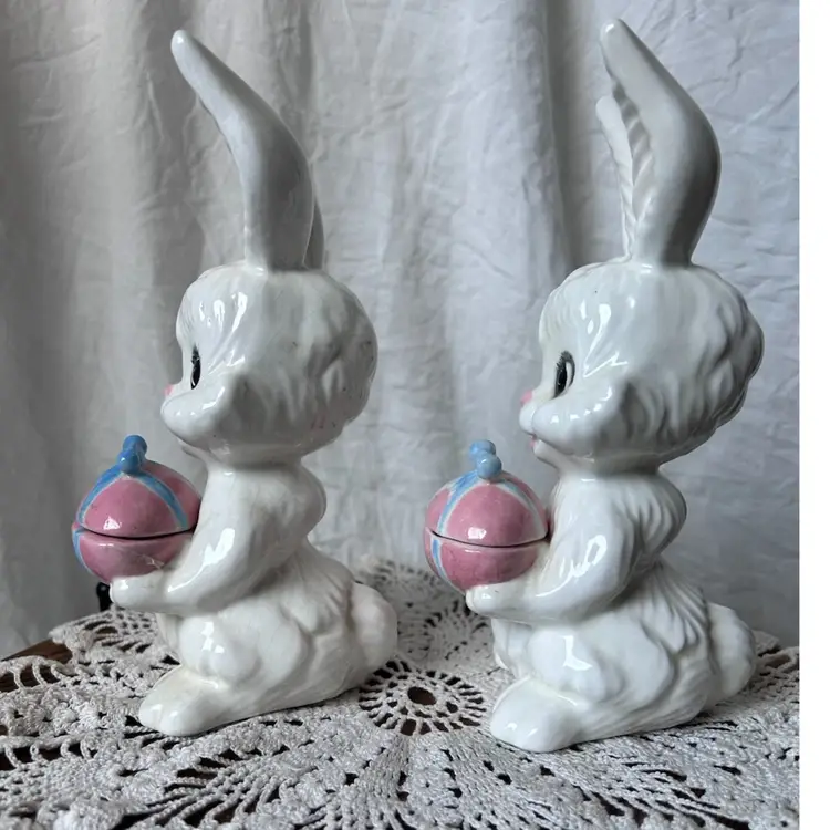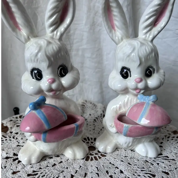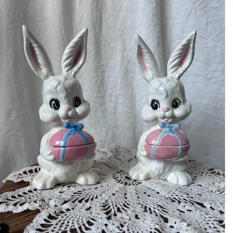 Adorable set of hobbyists made ceramic Easter rabbits that are holding Easter egg trinket boxes. Probably made in the 1980s by the colors. They measure 7” tall by 3.25” long and I see no flaws