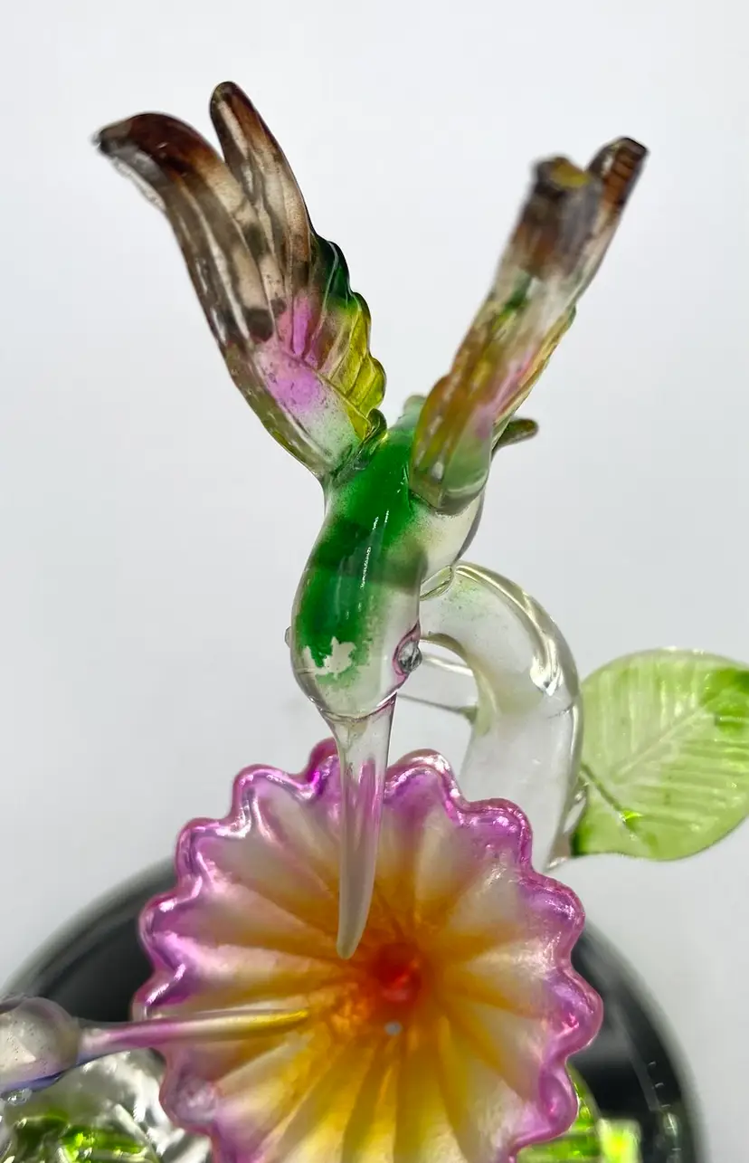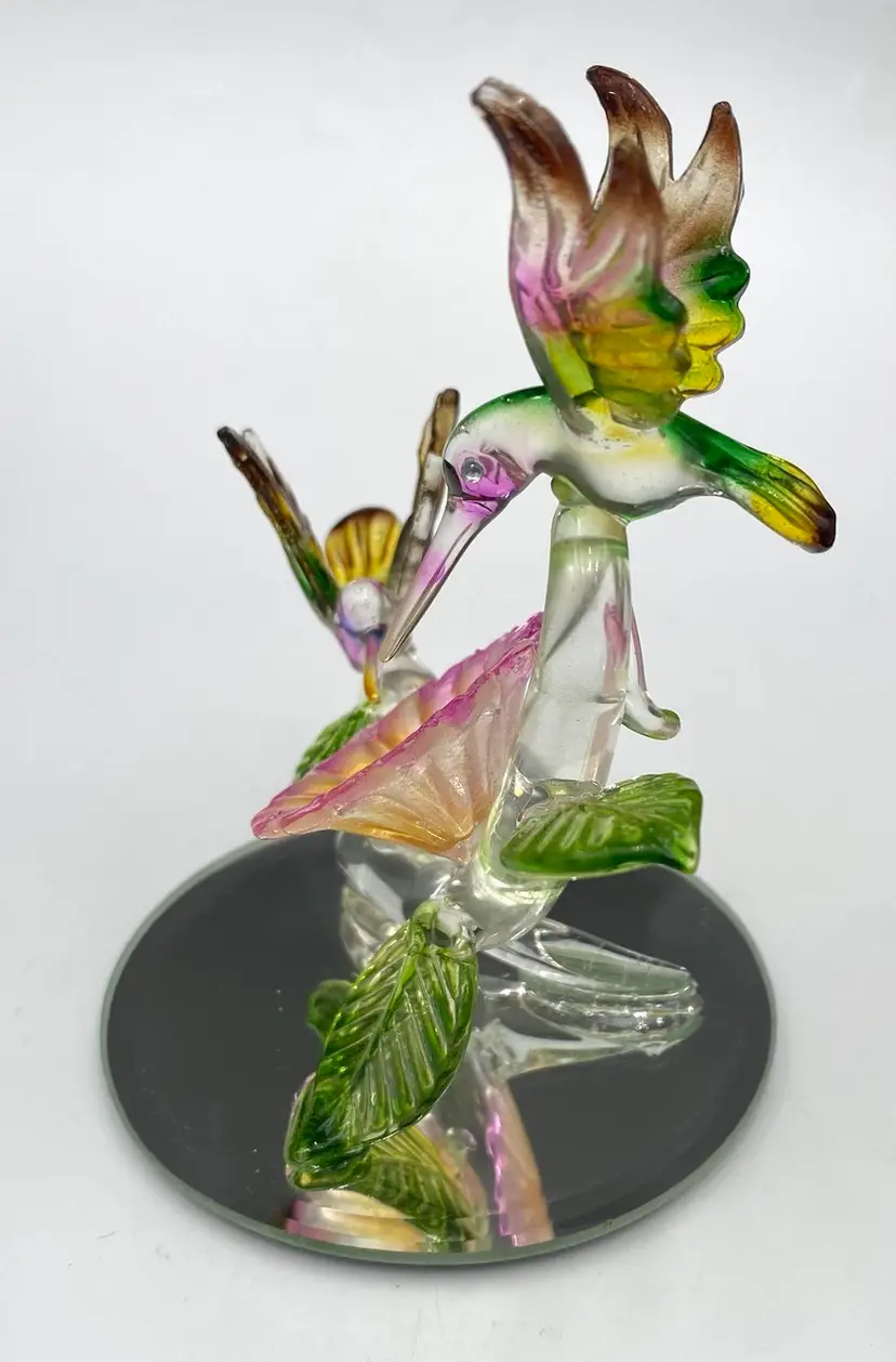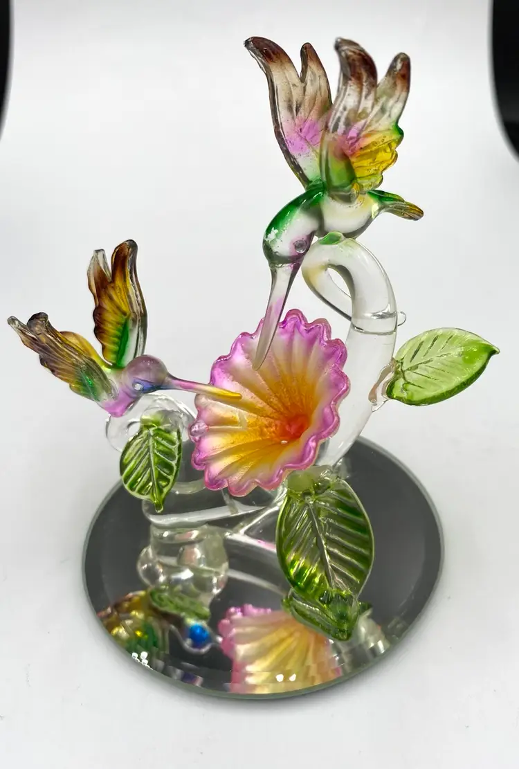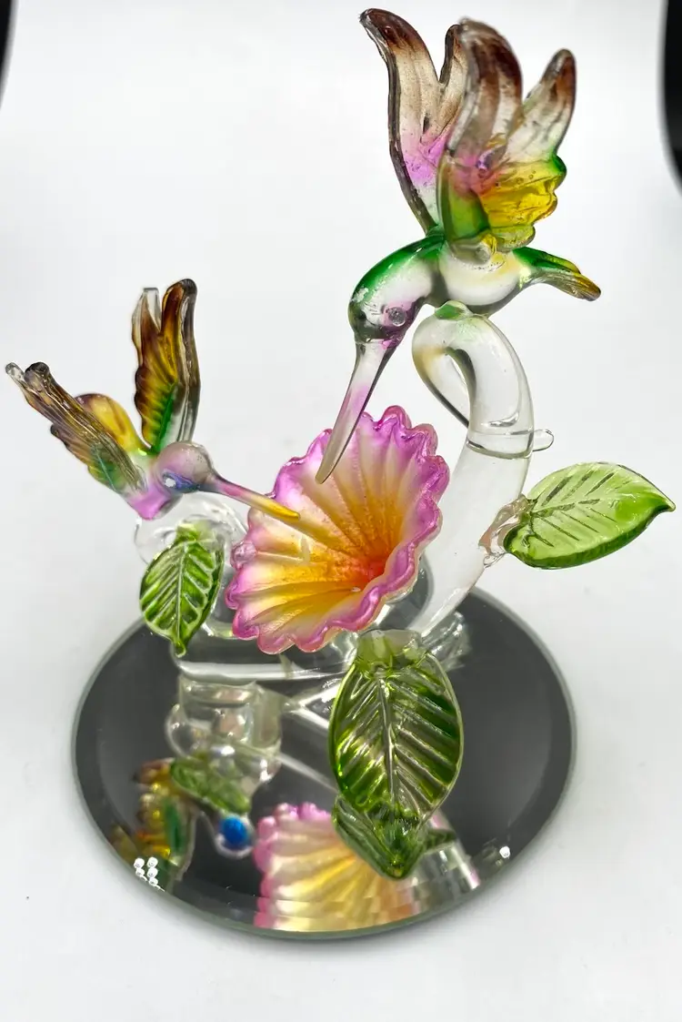 This figurine features a pair of handmade spun glass hummingbirds feeding from a beautiful flower. Crafted in China, these delicate glass birds feature intricate details. The figurine stands approximately 4.3 inches tall, 3.9 inches long, and 3.2 inches wide and weighs 2.9 ounces. The glass figurine is attached to a mirror. reflecting the lovely colors.