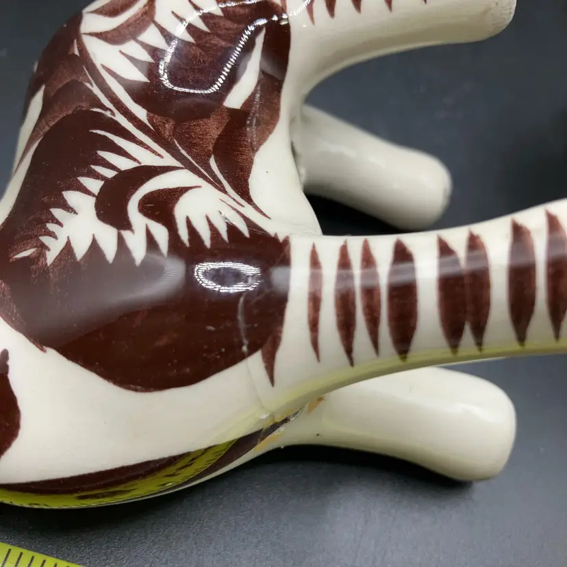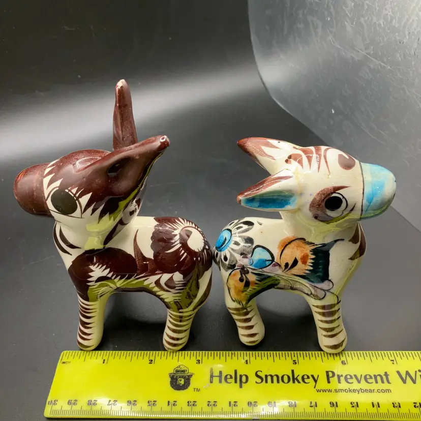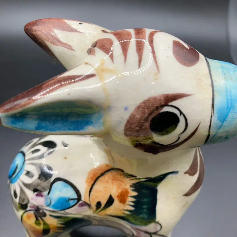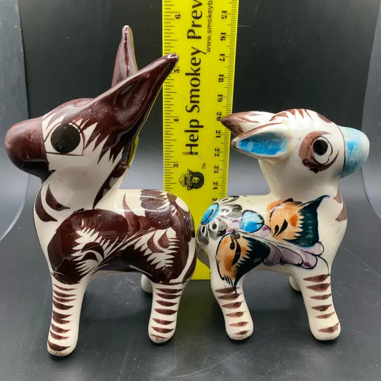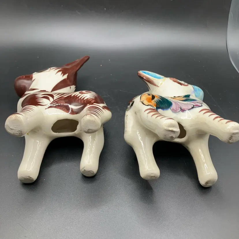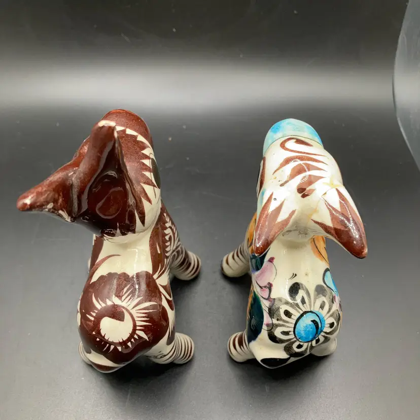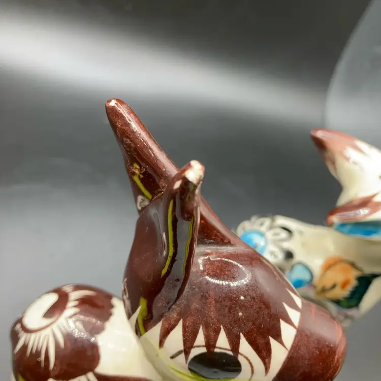 One with blue nose has repaired ear and brown one has repaired leg. Both are still adorable examples of Mexican Tonala pottery and display well. See pics.