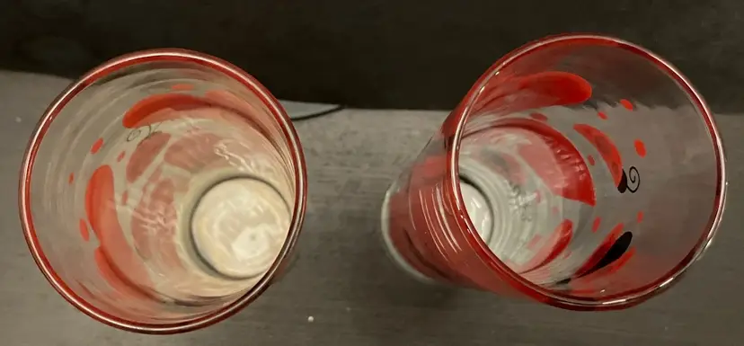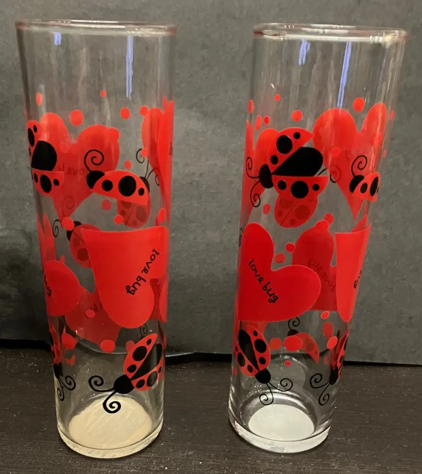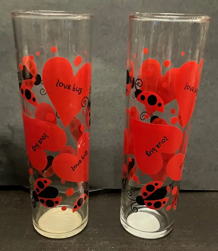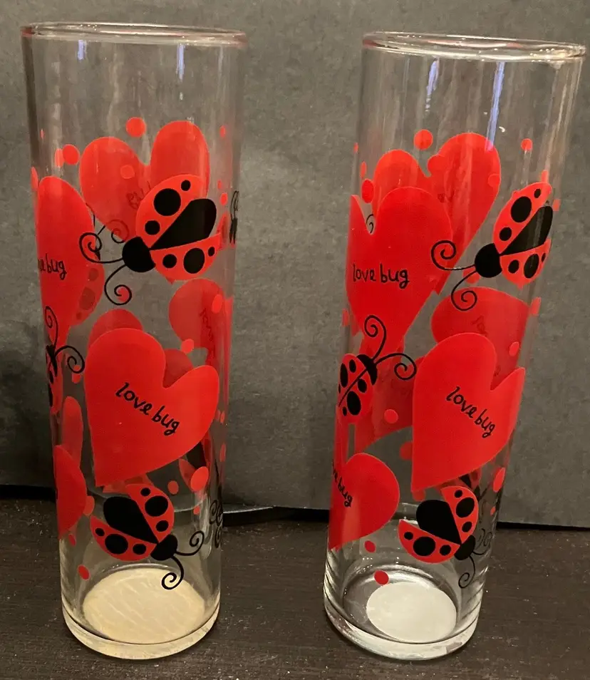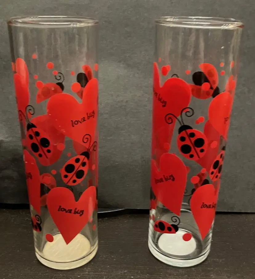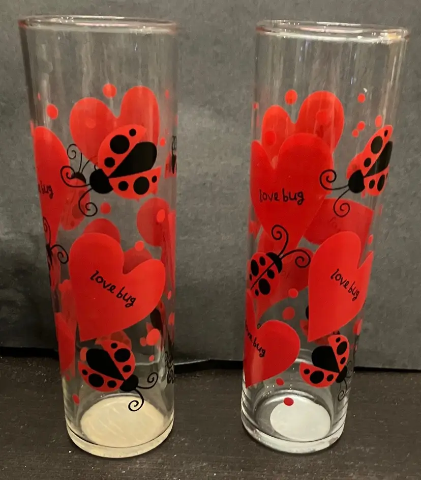 Can be used for cocktails, ice tea, Tom Collins drink, or even a vase! No chips or cracks. They still have the label on the bottom! Measures 6 3/4" tall and 2" diameter. No damage/fading to the ladybugs and hearts.