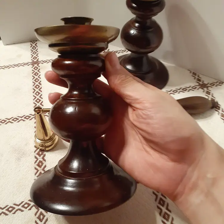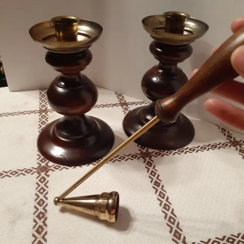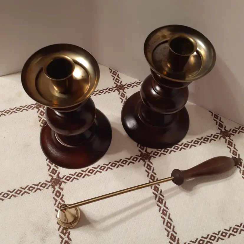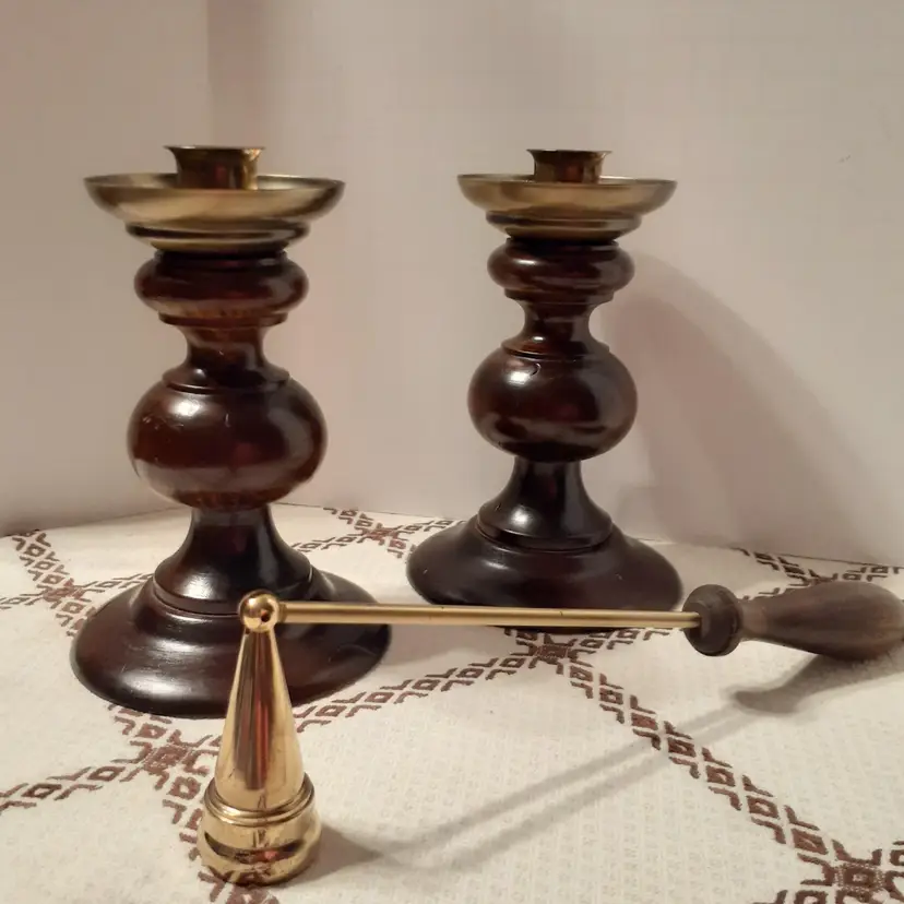 Made in USA, candle holders are 6.25" tall and 4 5" wide. Snuffer is by a different manufacturer but matches well.