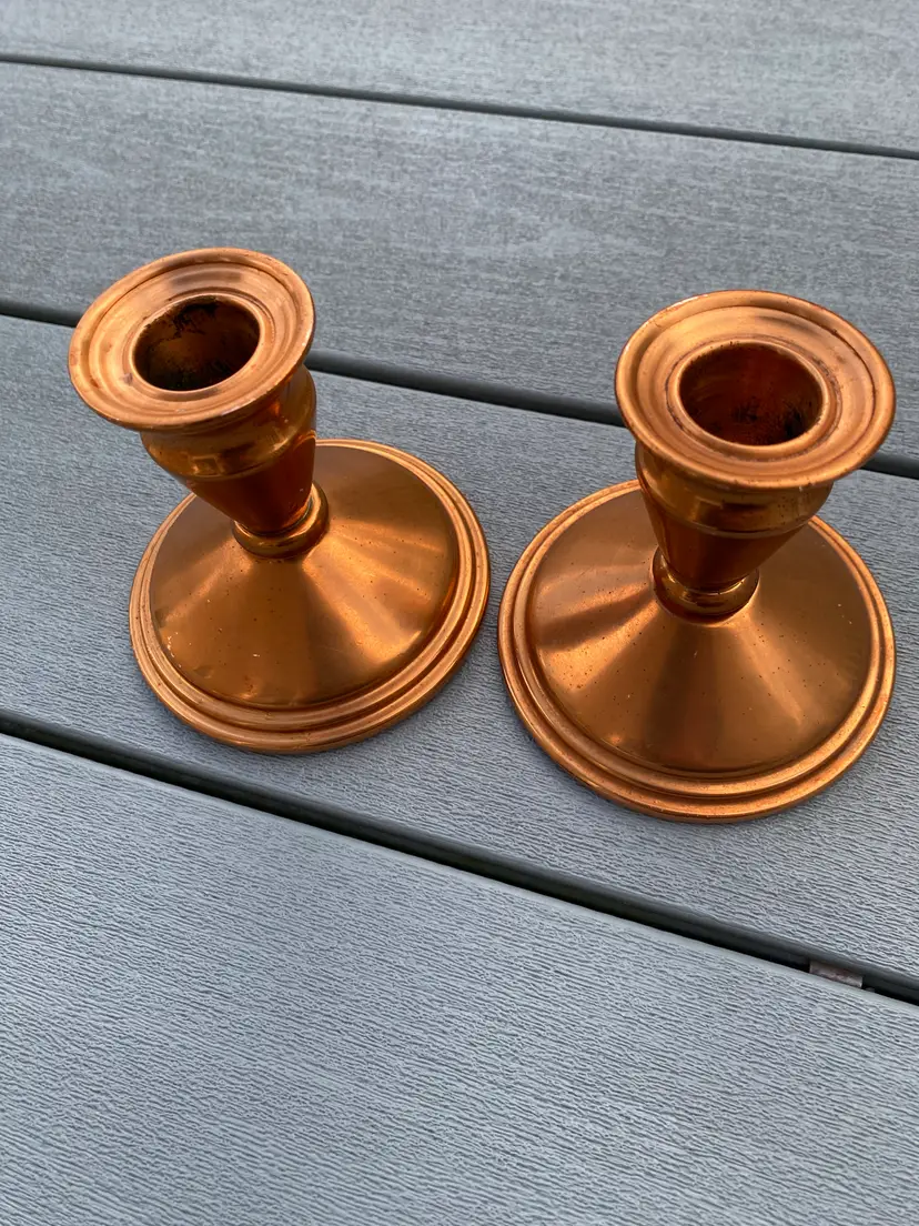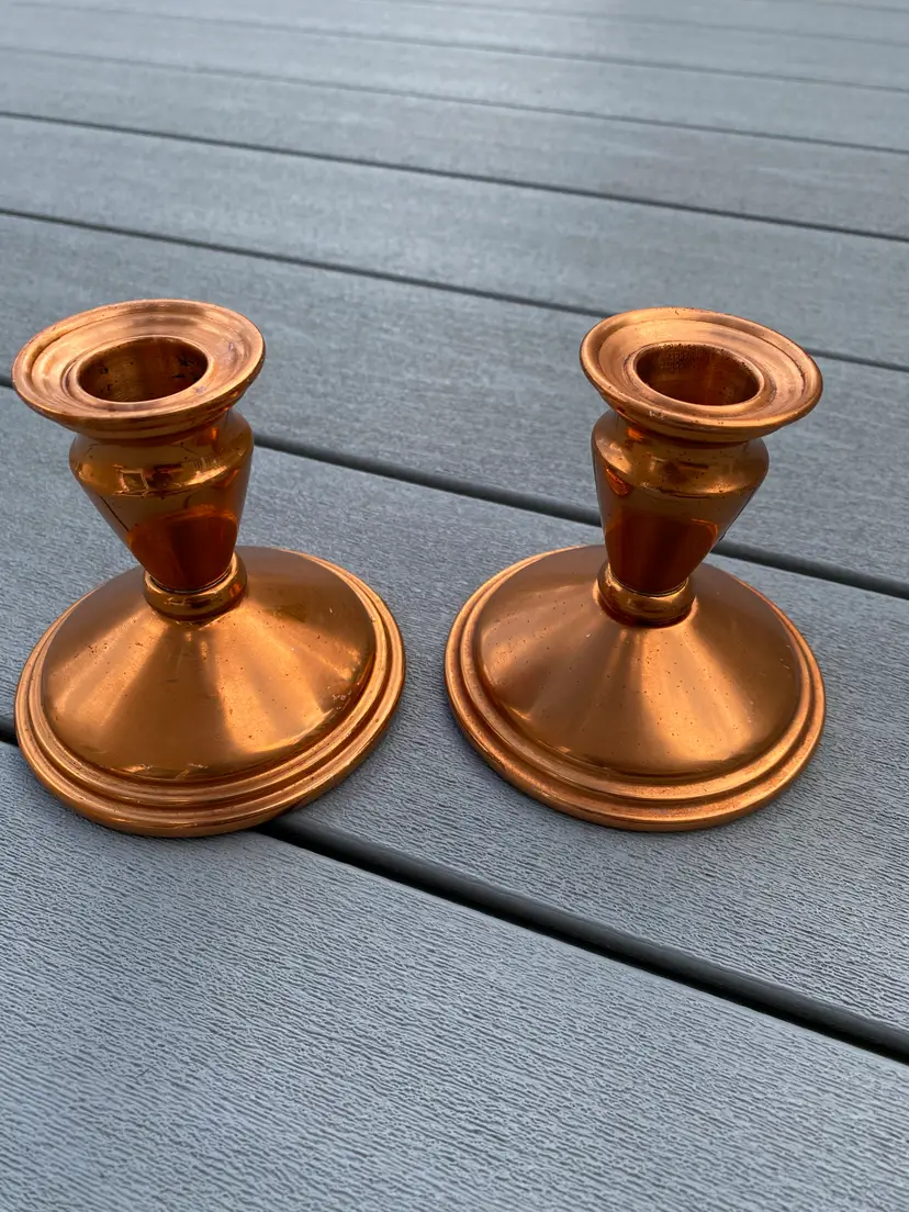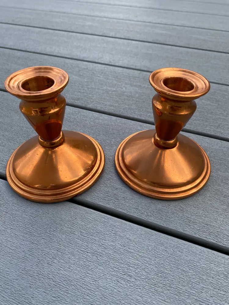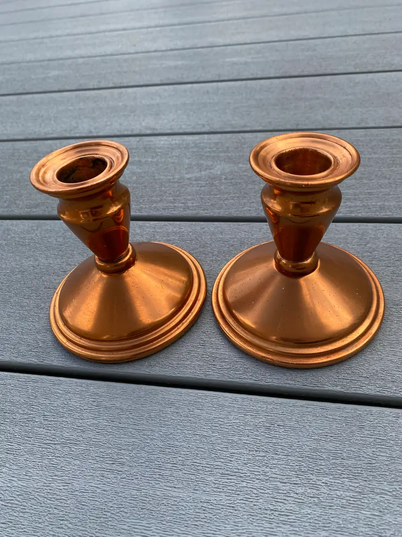 This is a stunning pair of MCM COPPER CRAFT GUILD unmarked copper candlesticks in excellent vintage condition. While there are some expected marks and patina that reflect its age, these candlesticks are otherwise extremely shiny and beautiful. These candlesticks measure approximately 3 3/4” at the base and are approximately 4” tall. Based in Taunton, Massachusetts, Copper Craft Guild was known for producing decorative copper items for the home, particularly during the mid-20th century. These candlesticks are intended for taper candles, and would be a wonderful addition to your table or shelf.
