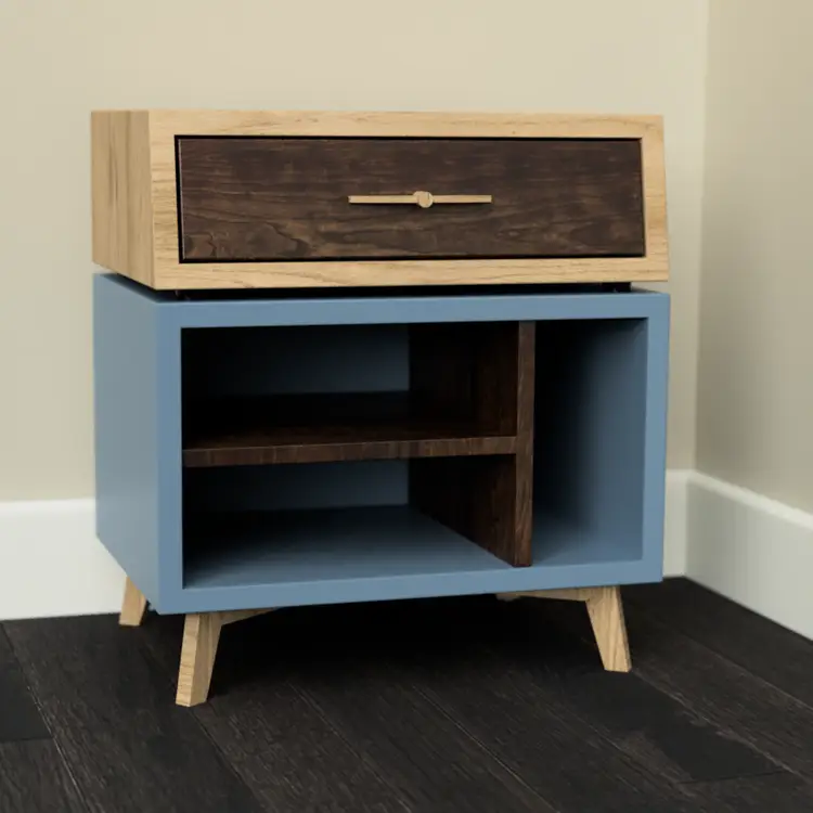 This pair of nightstands feature the following options: -Solid Poplar base with a custom tinted lacquer finish of [TBD] -Solid White Oak top, legs, and handle -Solid Walnut shelves and drawer box -Soft close undermount drawer slides -Black aluminum standoffs connecting the boxes
