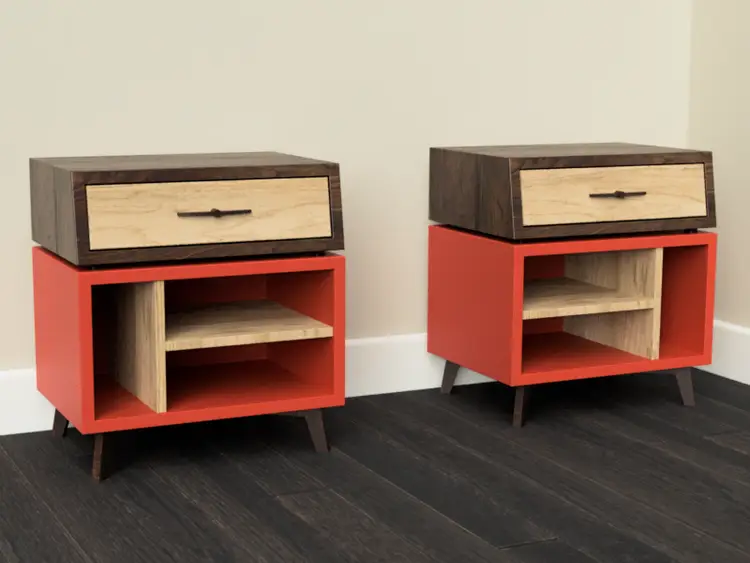 This pair of nightstands feature the following options: -Solid Poplar base with a custom tinted lacquer finish of RAL 2002 (Vermilion) -Solid Walnut top, legs, and handle -Solid White Oak shelves and drawer box -Soft close undermount drawer slides -Black aluminum standoffs connecting the boxes