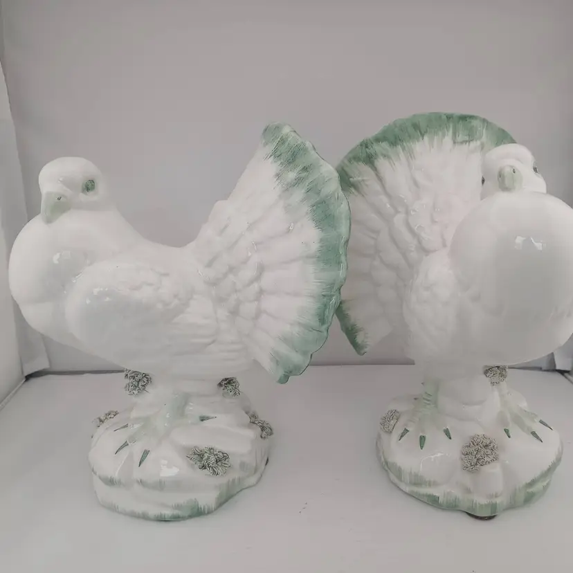 This is a gorgeous pair of midcentury (1960s) Italian ceramic doves. They are in fantastic condition with no noted flaws--even the little grass tufts are fully intact. They are almost 9" tall and about 7" long.