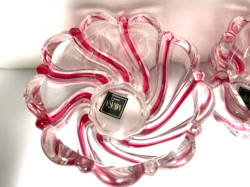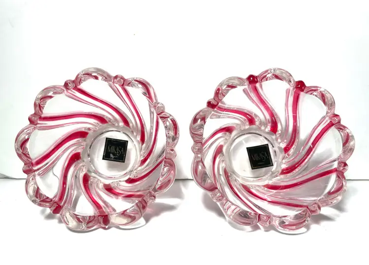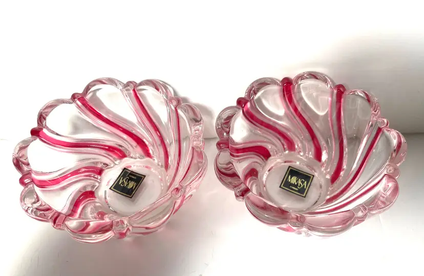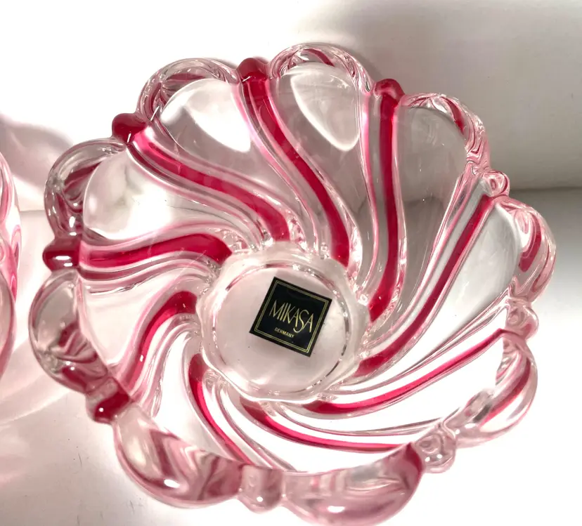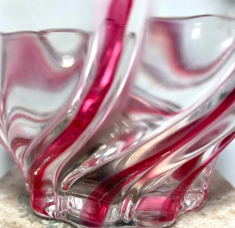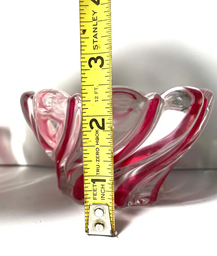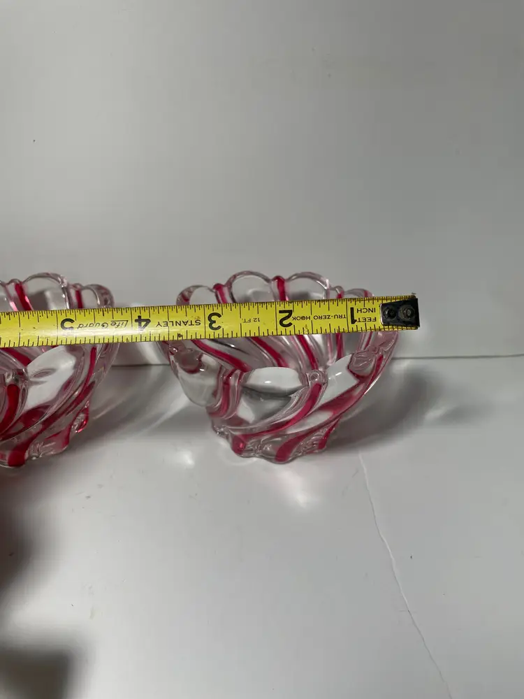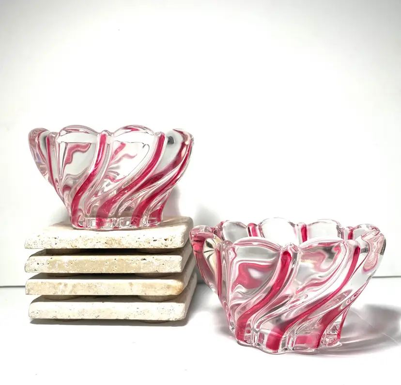 Beatiful red swirl bowls. Use for votive candles, candy dishes, or even trinket dishes. There are a few places where the applies red color is worn off. I zoomed in on some photos so you can see what I’m referring to. Please view all pictures as they are part of this description. Thank you for visiting my store!