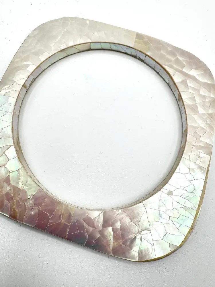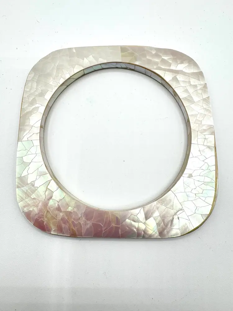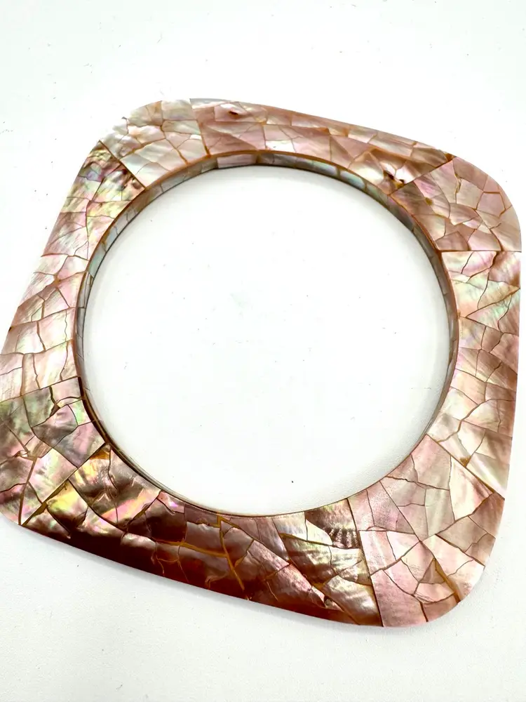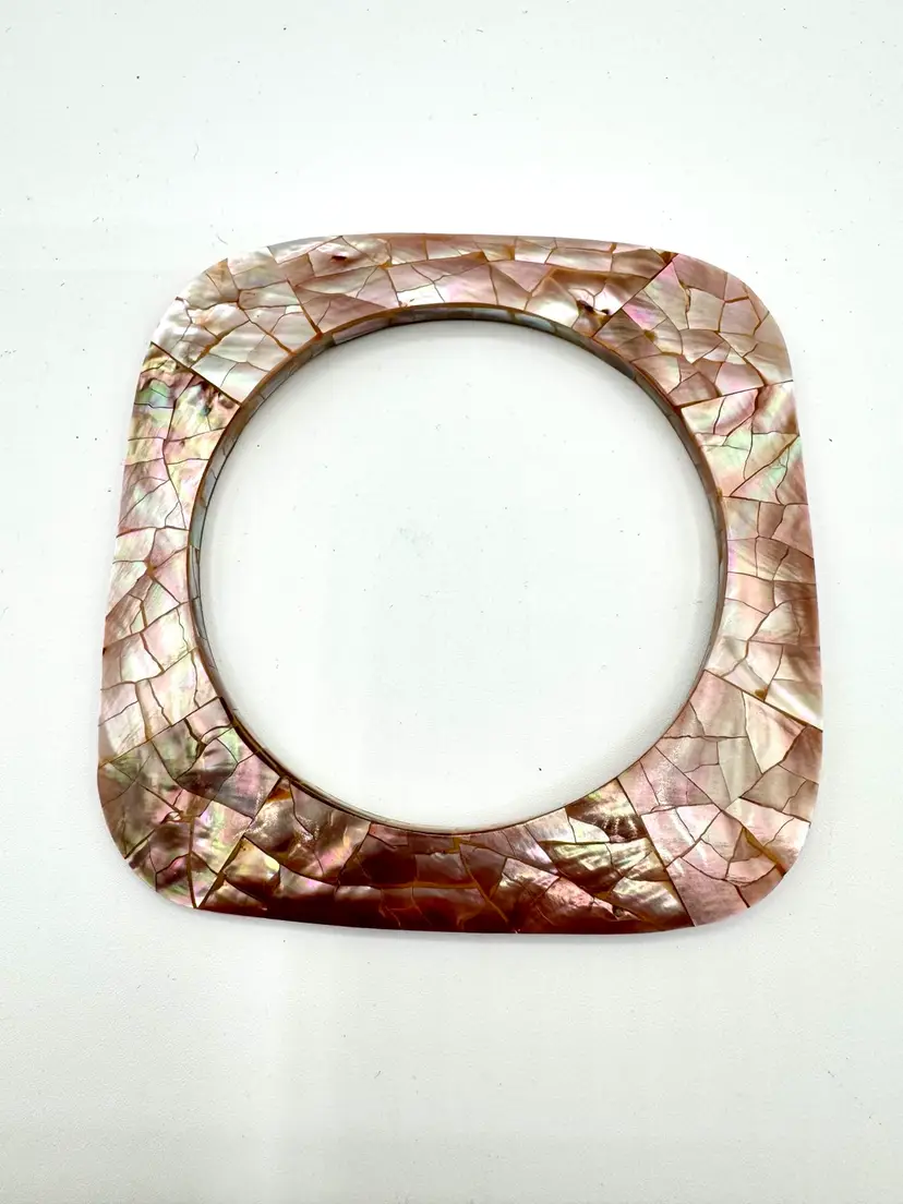 Add a touch of elegance to your outfit with these stunning pink mother of pearl mosaic flat square bangle bracelets. The delicate pink shade of the shells used in the design complements any skin tone, making it a perfect accessory for any occasion. The bracelets are pre-owned but have been well-maintained and are in excellent condition.