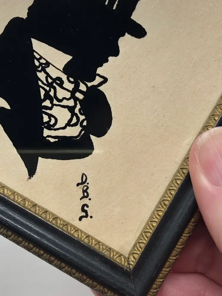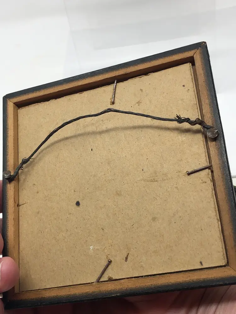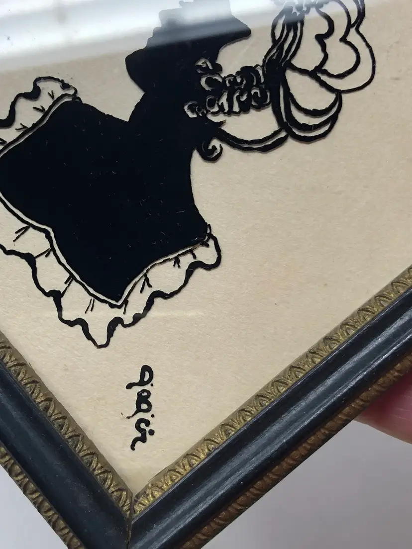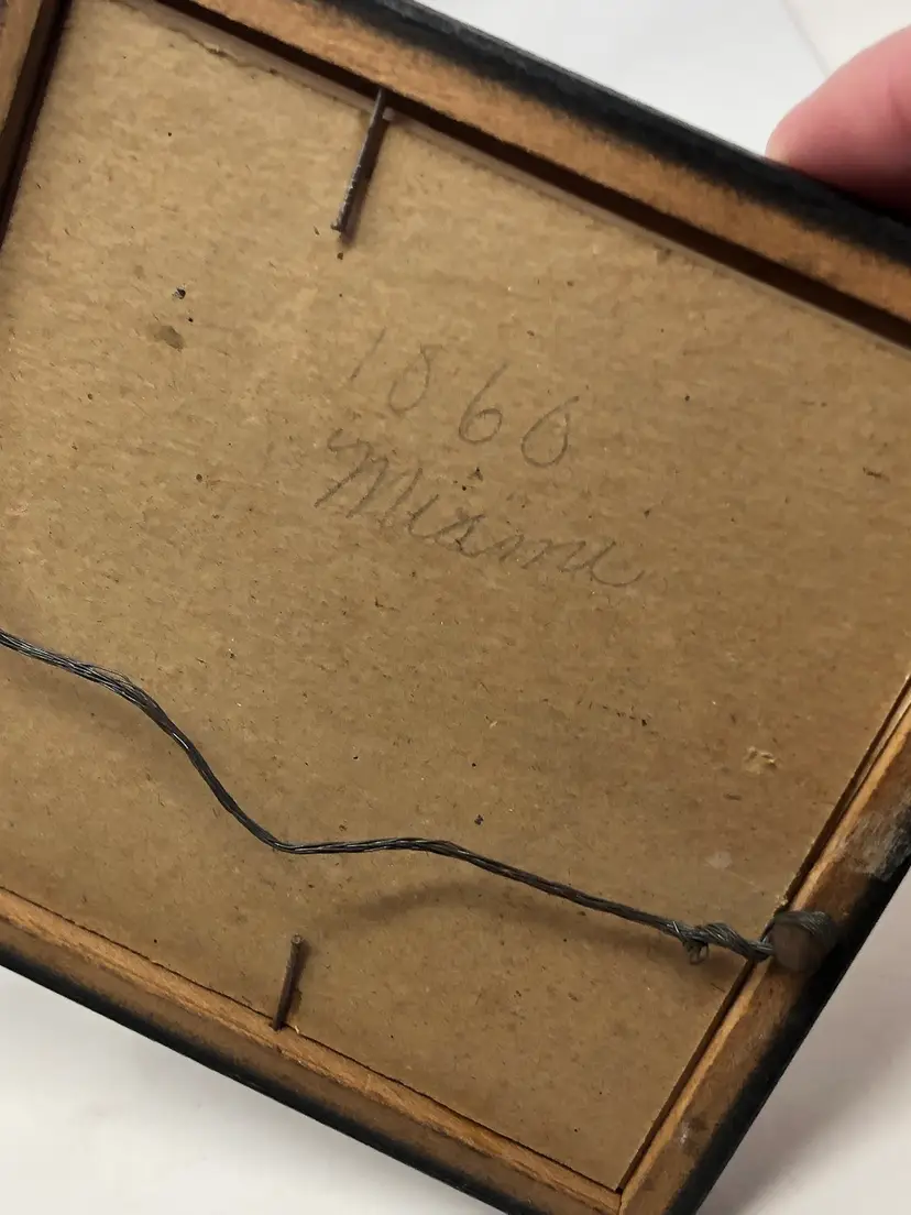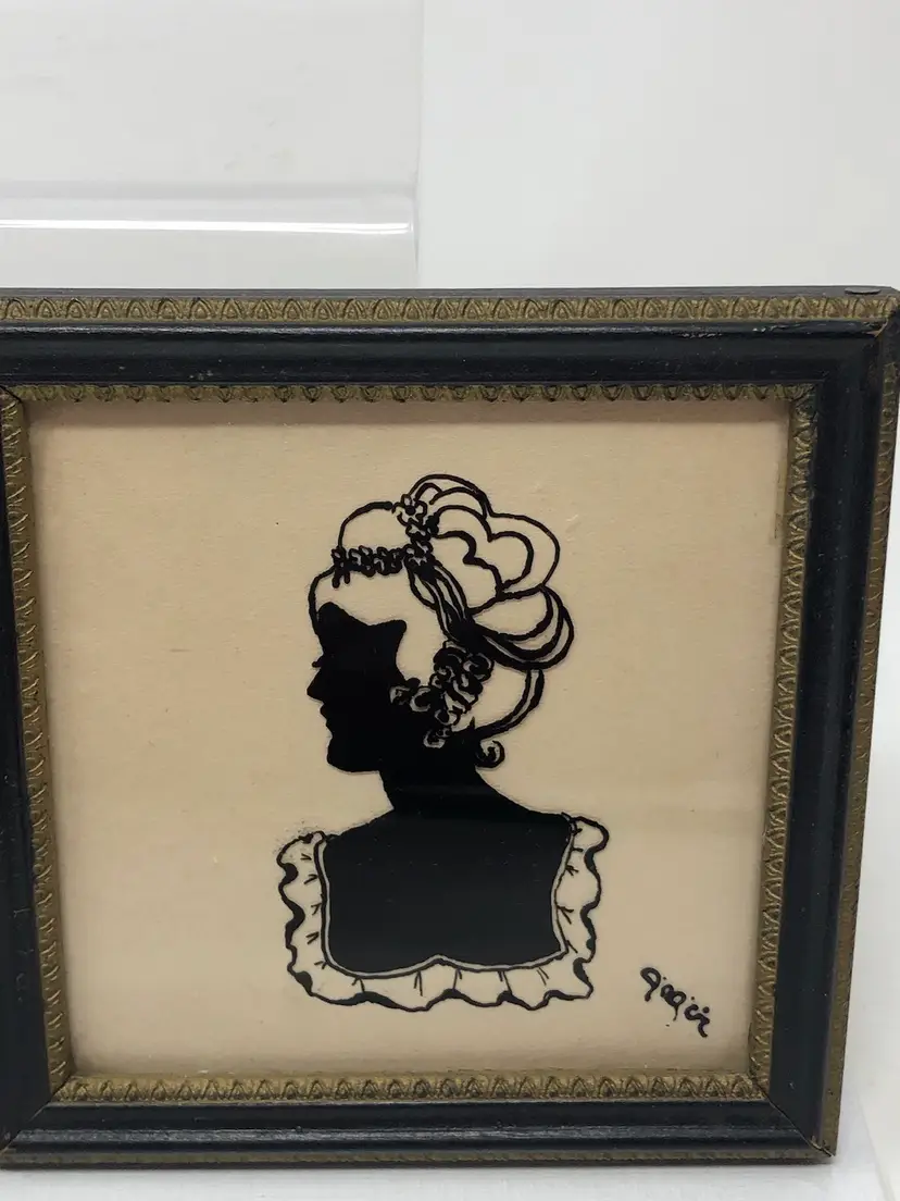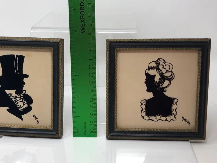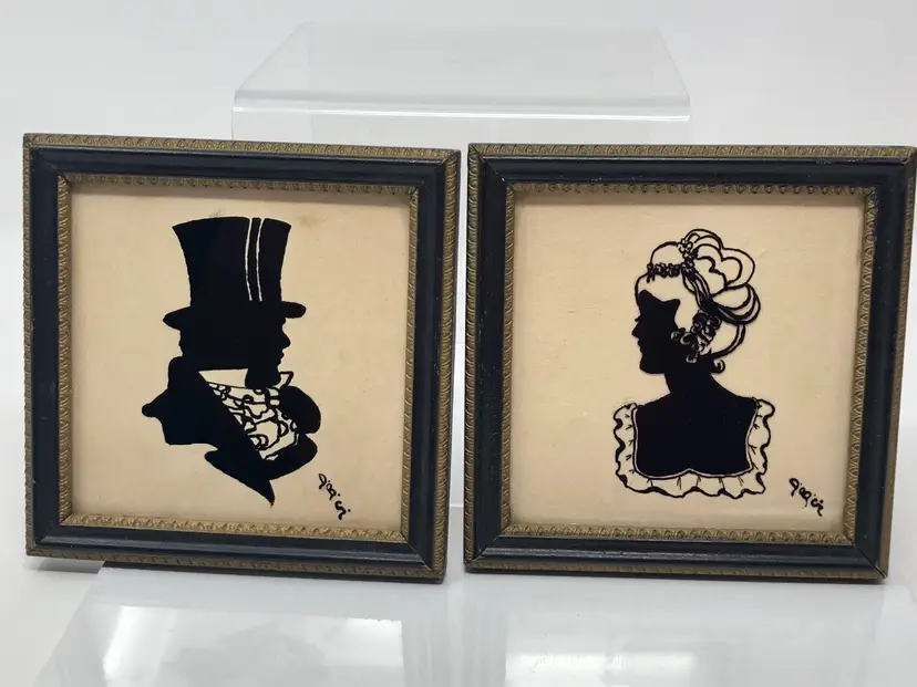 Pair of 4 1/2" square framed reverse painted portraits of a man and woman in vintage dress. Both have wire for hanging display. Wood frames with glass