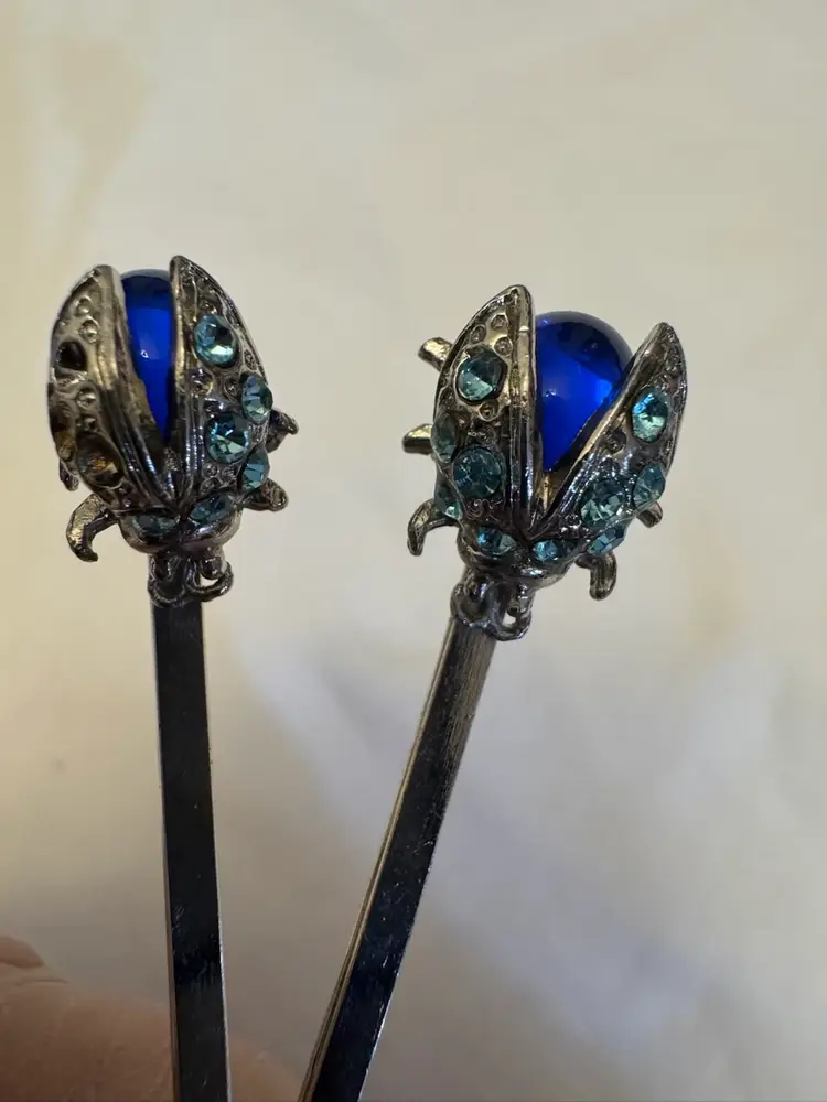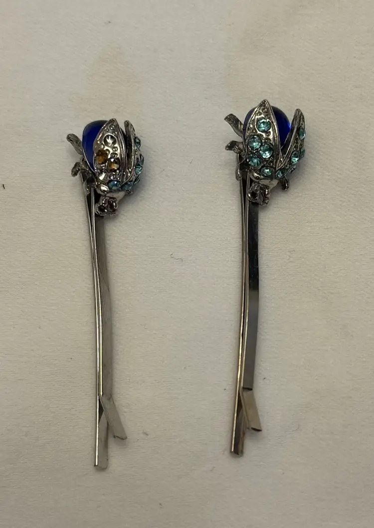 Pair Of Rhinestone Blue Ladybug Hair Clips 1.5”
