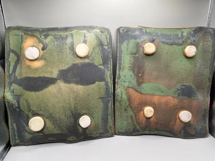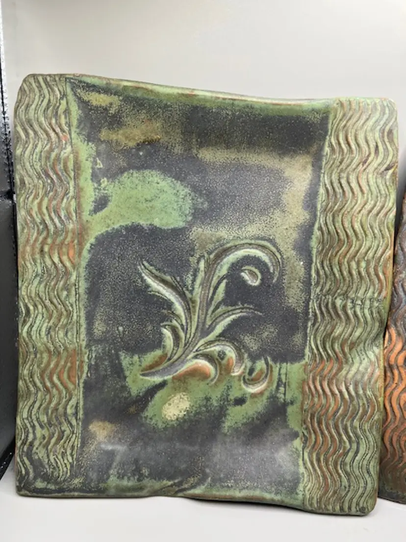 These stylish pieces feature raised wavy borders and a stylized leaf design with a distinctive green, bronze and copper tone. Each piece measures 8 inches tall and 6.75 inches wide.
