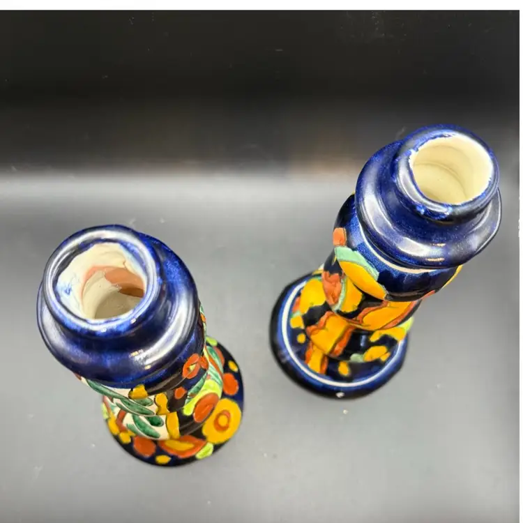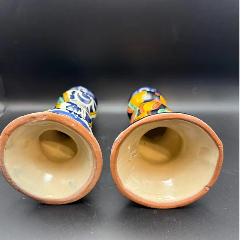 These are handcrafted and hand-painted Mexican ceramic candle holders. They stand 8 in high. These candle holders are typically made with a clay base and feature vibrant, intricate patterns. They are designed to hold standard-sized taper candles. Talavera pottery is a traditional Mexican art form, with some pieces being made in the Puebla region of Mexico.