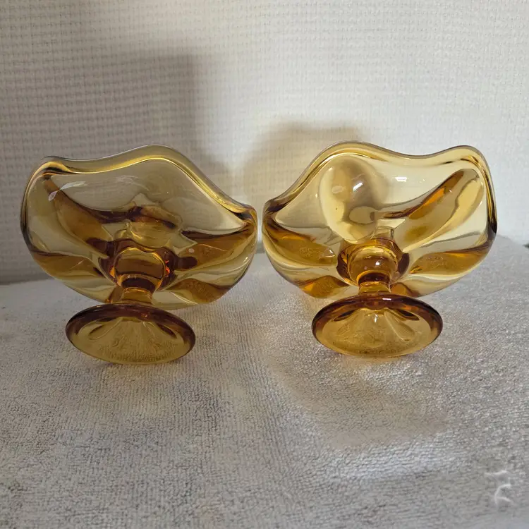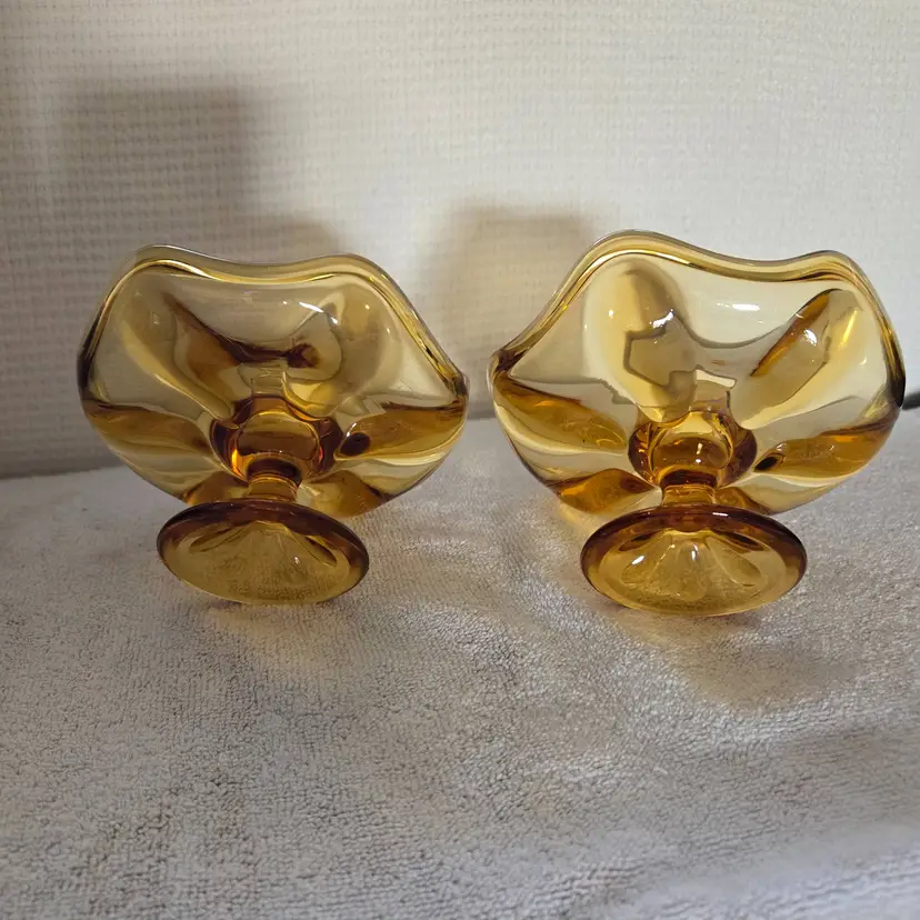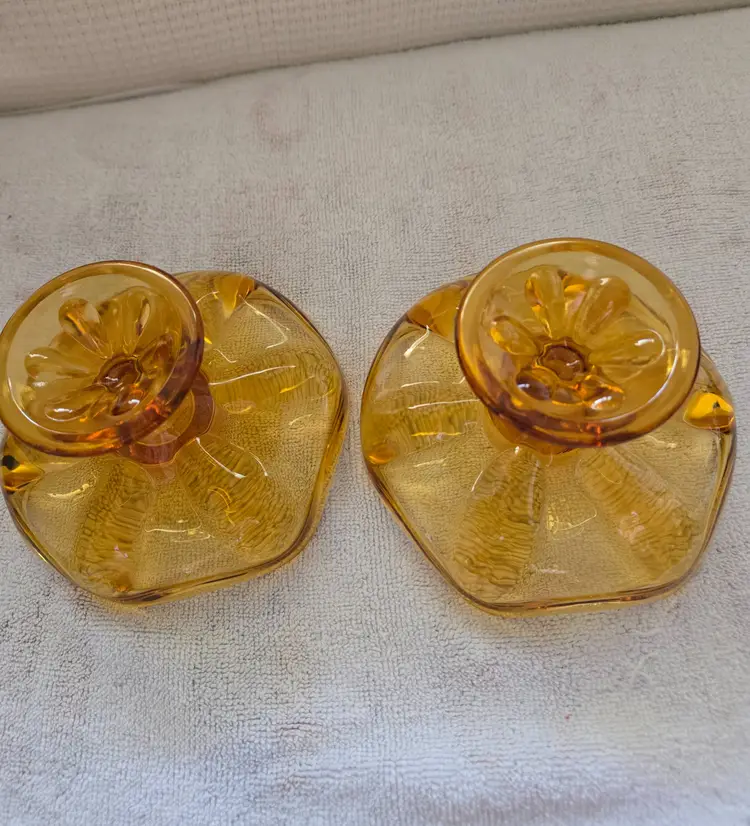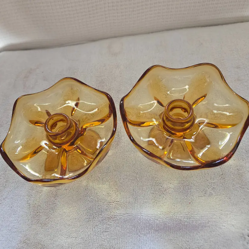 Designed to hold taper candles. They are mid-century modern pieces. Likely from the 60's to the 70's. They are a beautiful amber color. They measure 5" across the top, 3" tall, and 2 1/2" across the base. Made of pressed glass. In excellent condition. No chips, cracks, or repairs. No scratches.