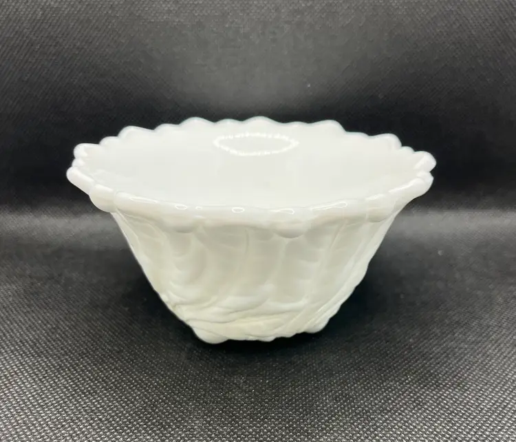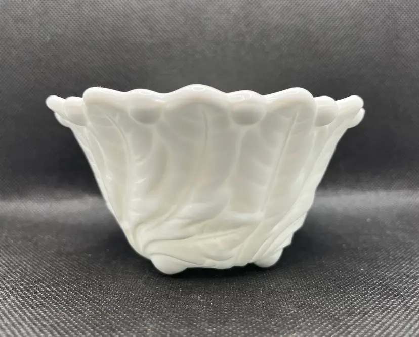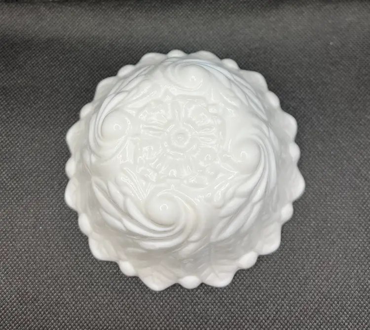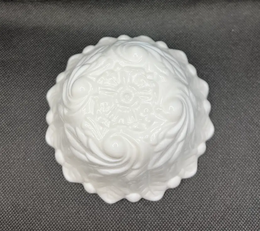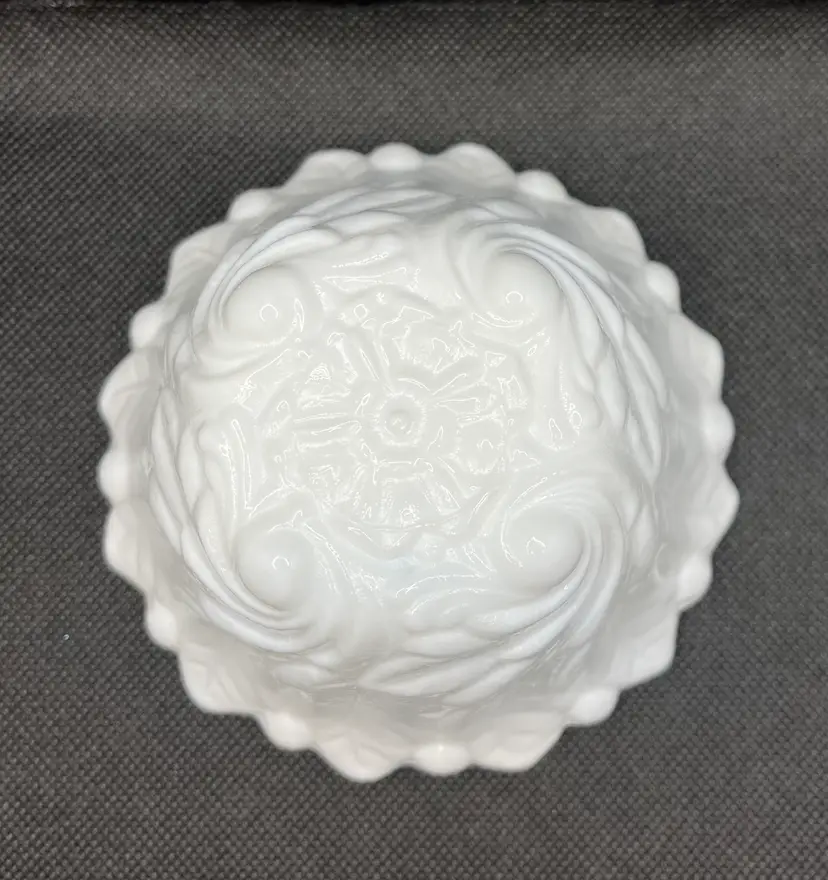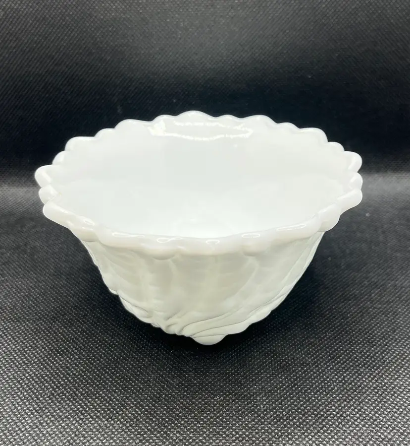 It was made by the Indiana Glass Company in the 1960s featuring the Wild Rose pattern. The surface is adorned with large wide cabbage-like leaves and a single flower in the center on the bottom.