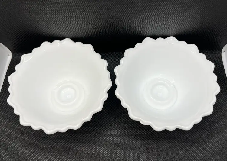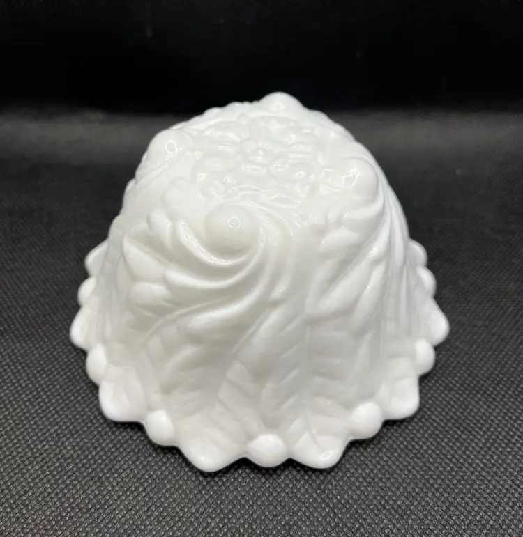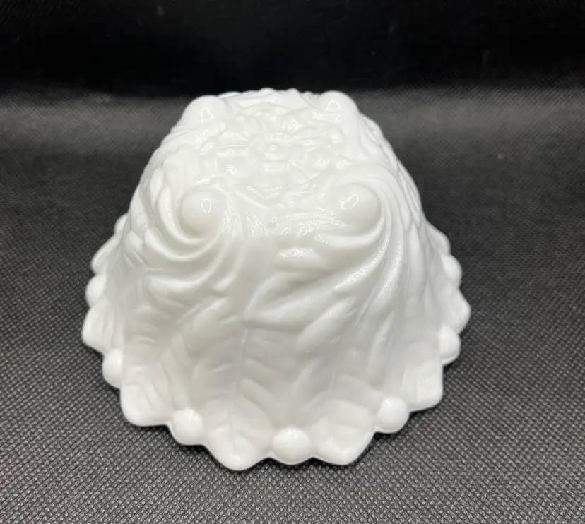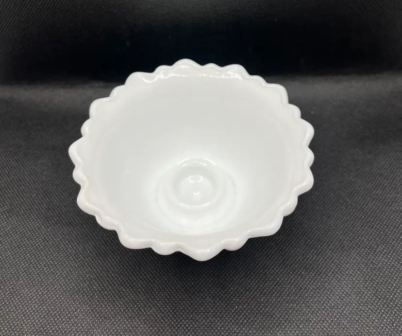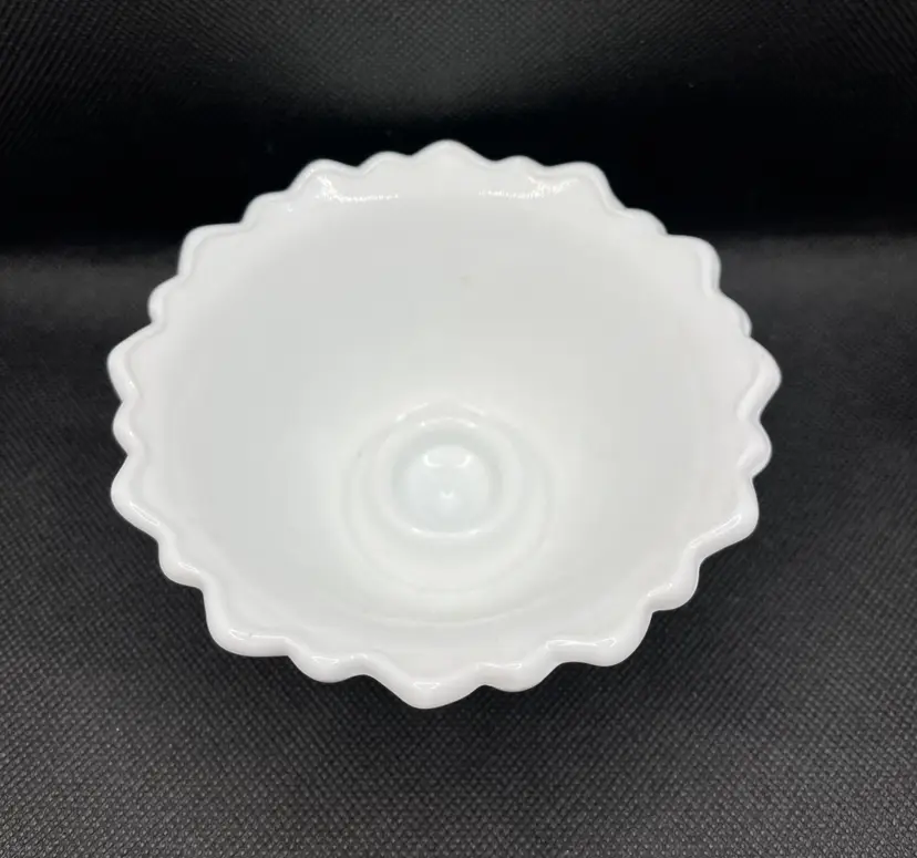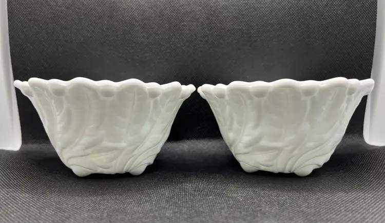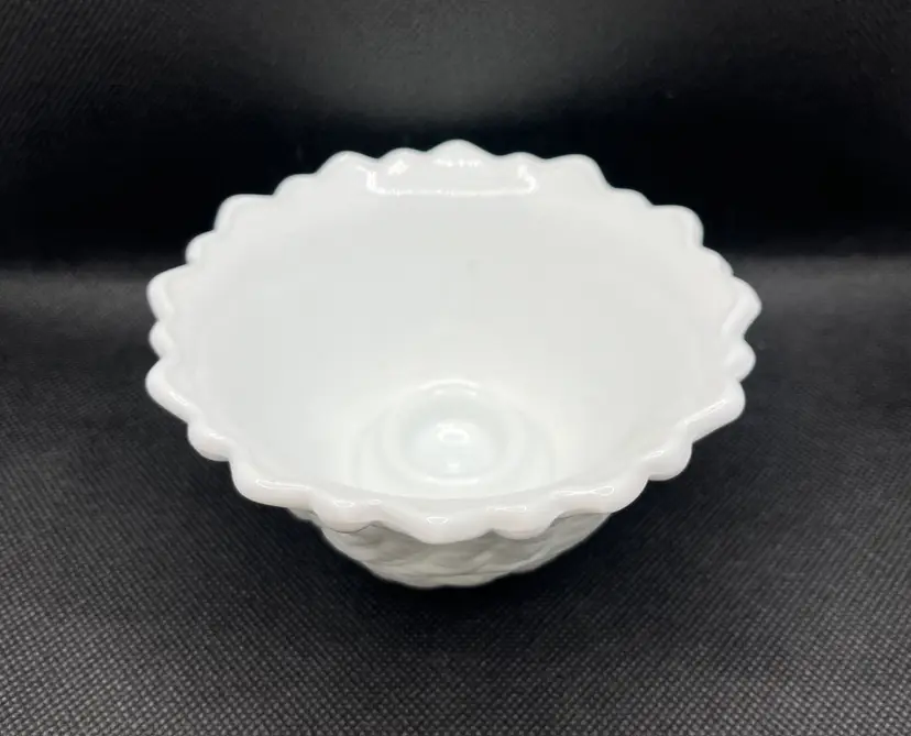 It was made by the Indiana Glass Company in the 1960s featuring the Wild Rose pattern. The surface is adorned with large wide cabbage-like leaves and a single flower in the center on the bottom.