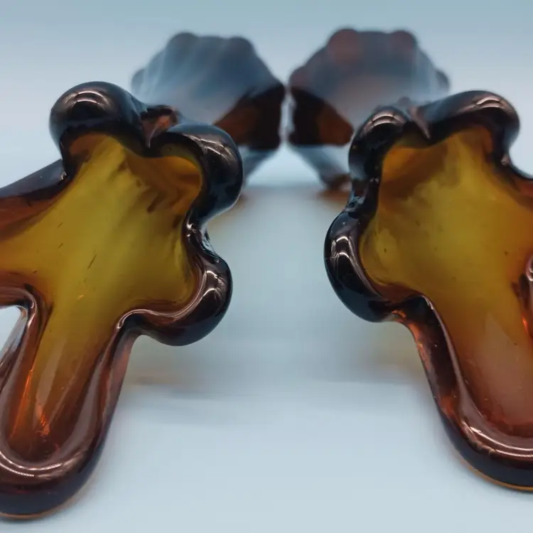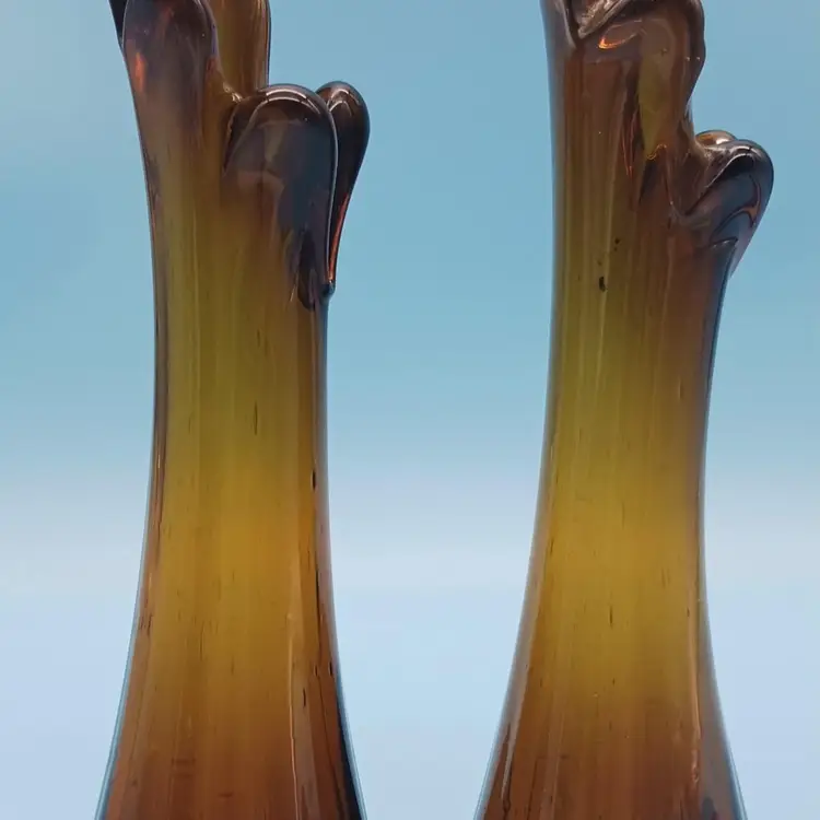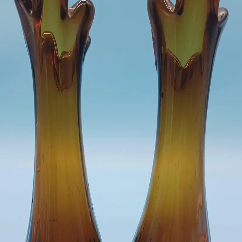 Look, a pair of vintage amber color , L.E.Smith five finger swung vases? Yes, It's unusual to find a pair of swung vases nowadays but here's a pair just for you.The vase measure approximately 9 inches tall by 3 inches wide and are waiting to be added to your swung vases collection.