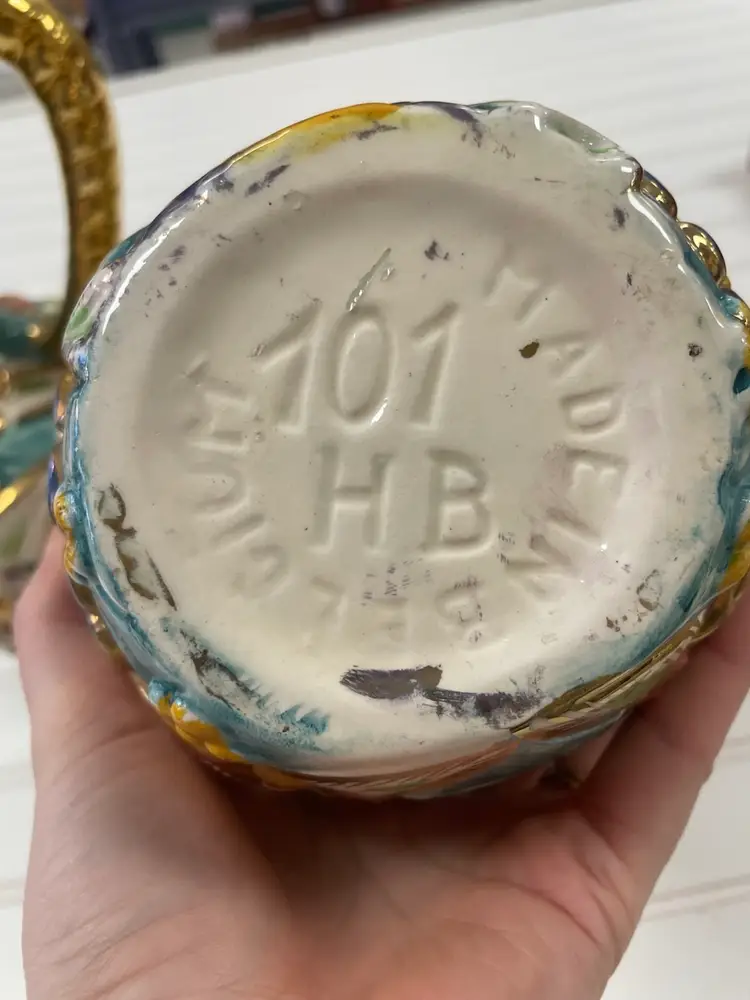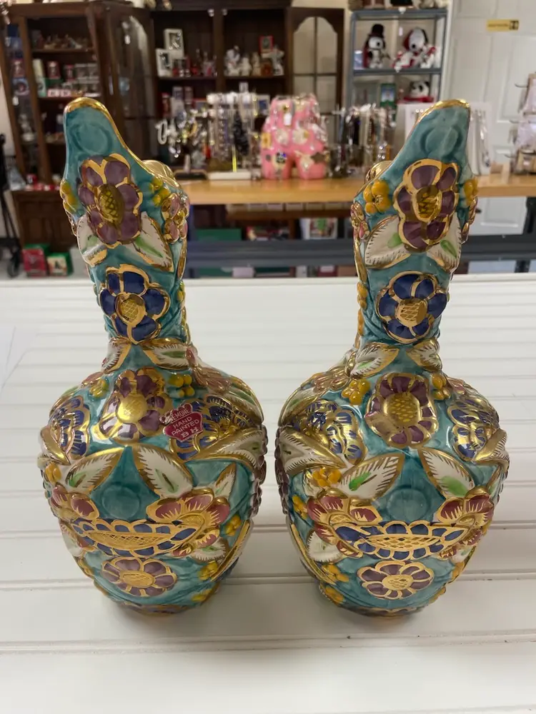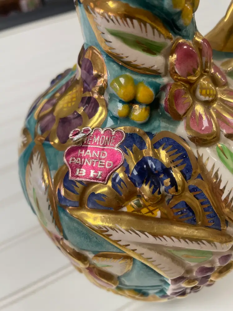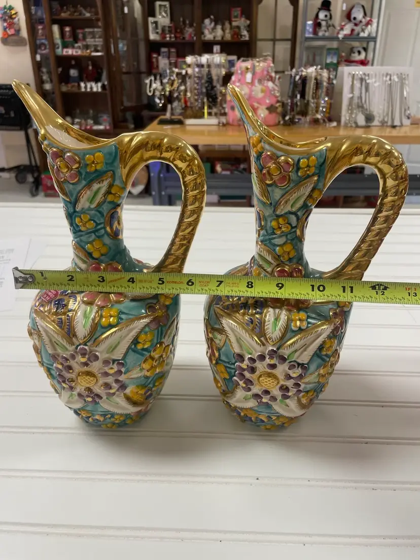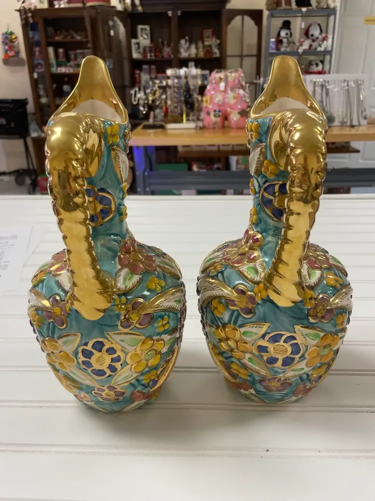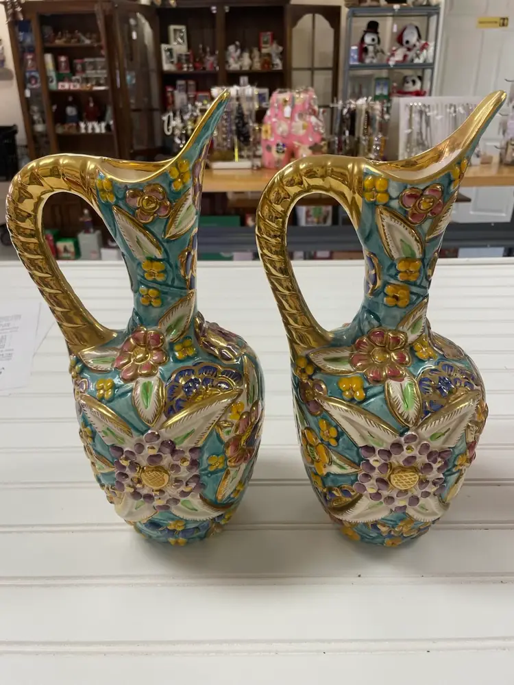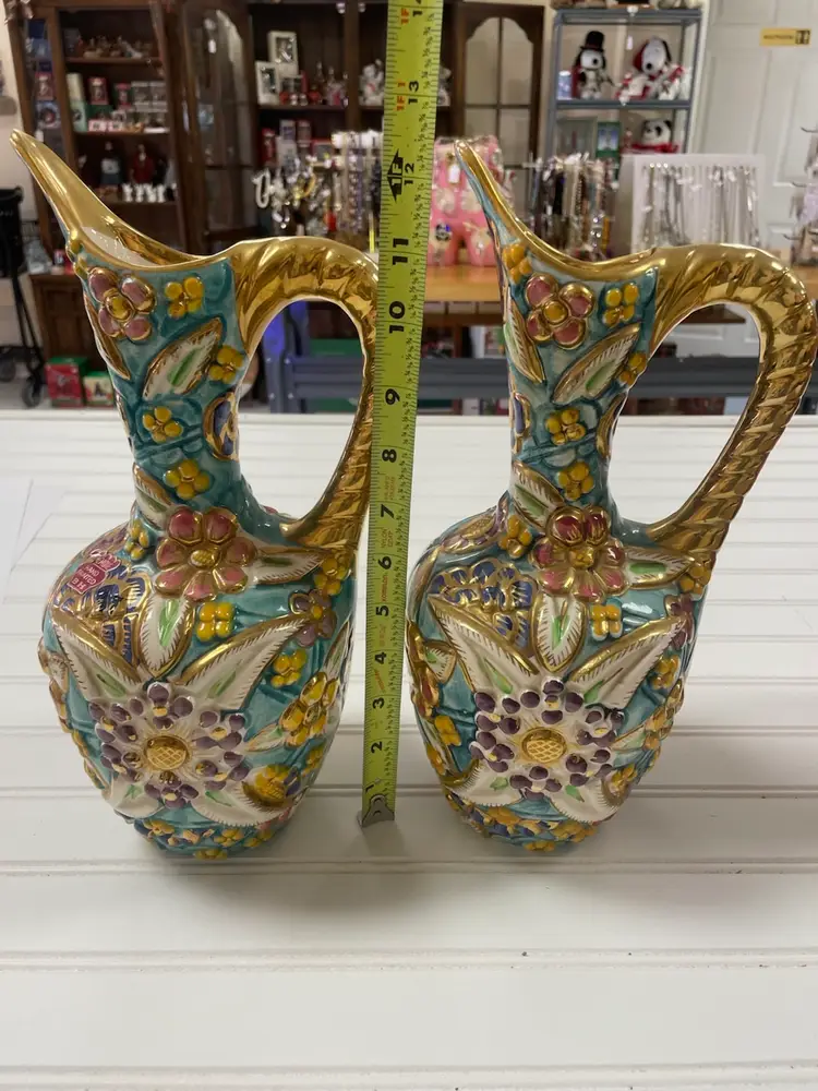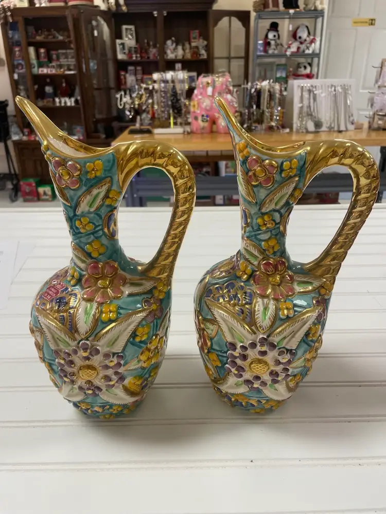 Pair of Vintage Belgium Art Pottery Gold Multi-Color Floral Pitcher / Ewer
