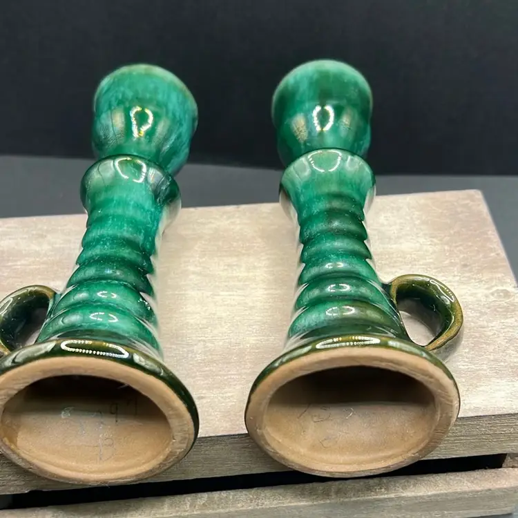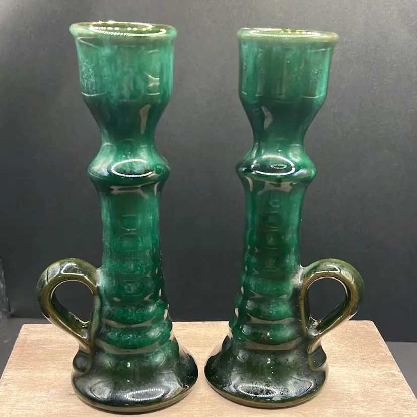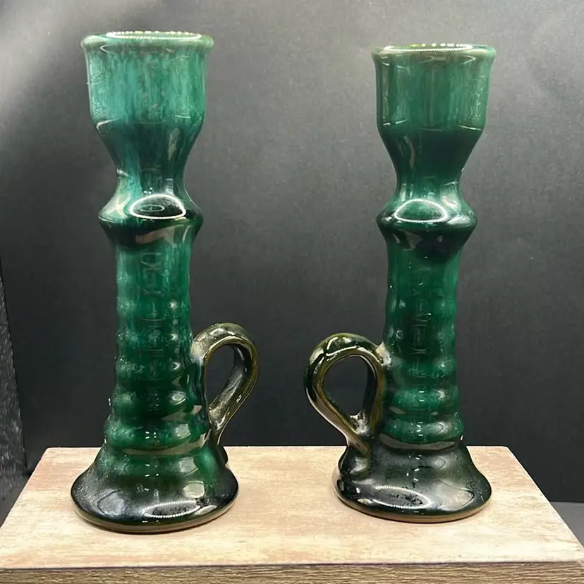 The candlesticks appear to be examples of mid-century art pottery, likely dating from the 1950s to 1970s. The style is characterized by the use of glossy, reactive glazes, and somewhat organic shapes. The handles are a design element that adds to their charm.