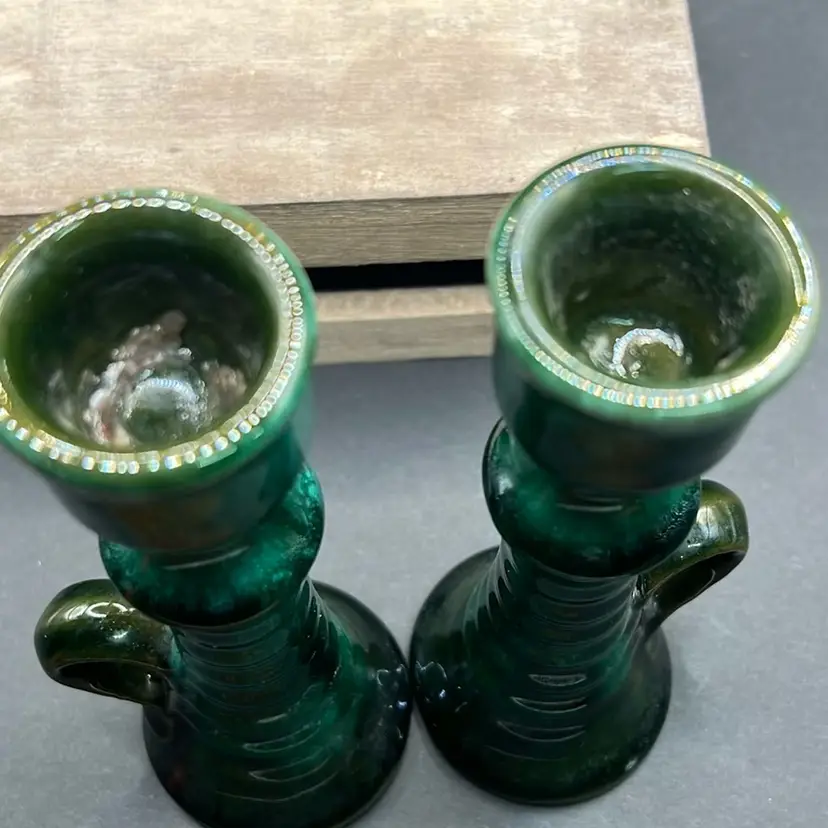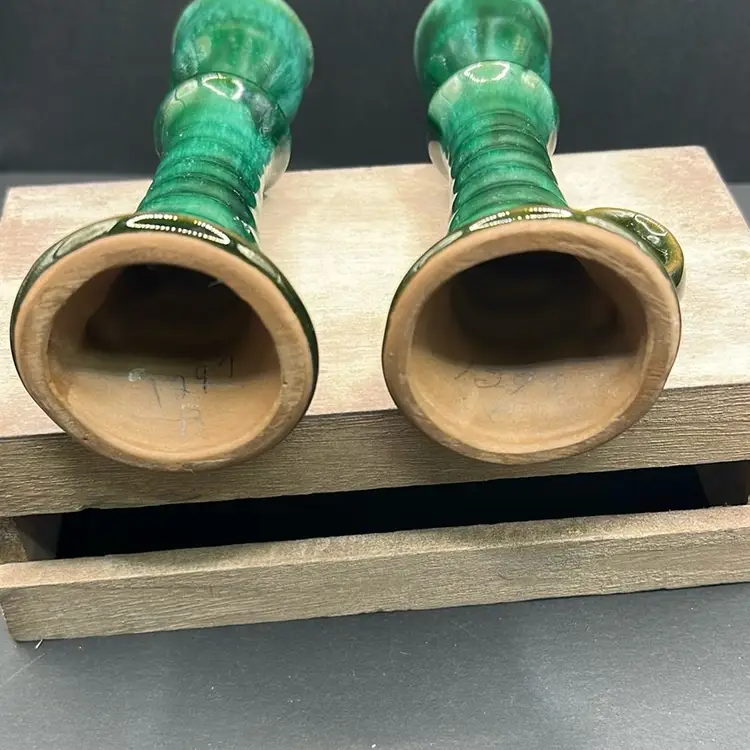 Similar pieces were produced by various studio potters and smaller ceramics workshops during this period. The green glaze is a popular color from that era. Without a maker's mark, it's difficult to attribute them to a specific artist, but they still hold value as decorative vintage items. Unknown maker, excellent condition no chips or cracks. Set of 2. See pictures for details.