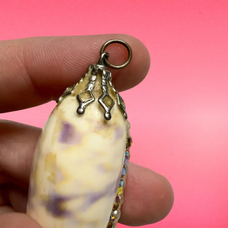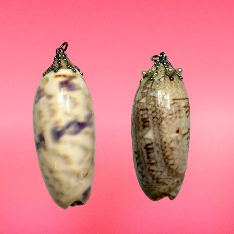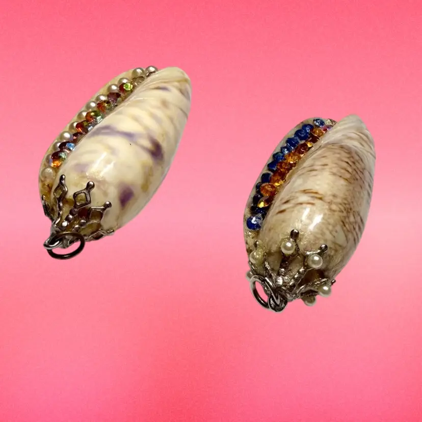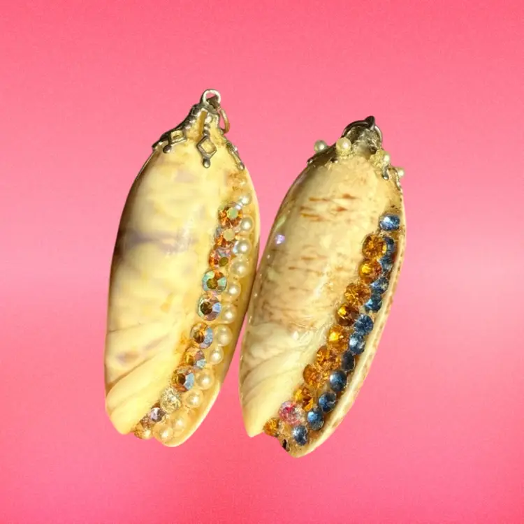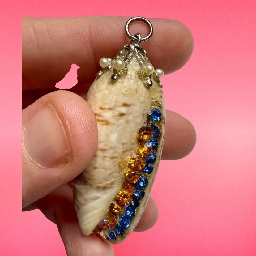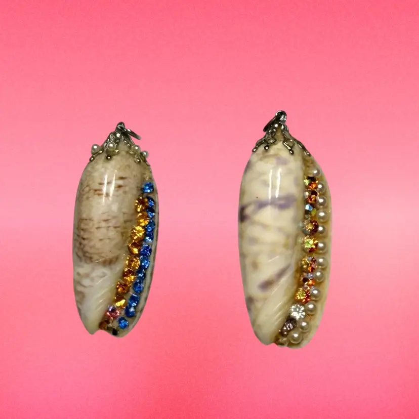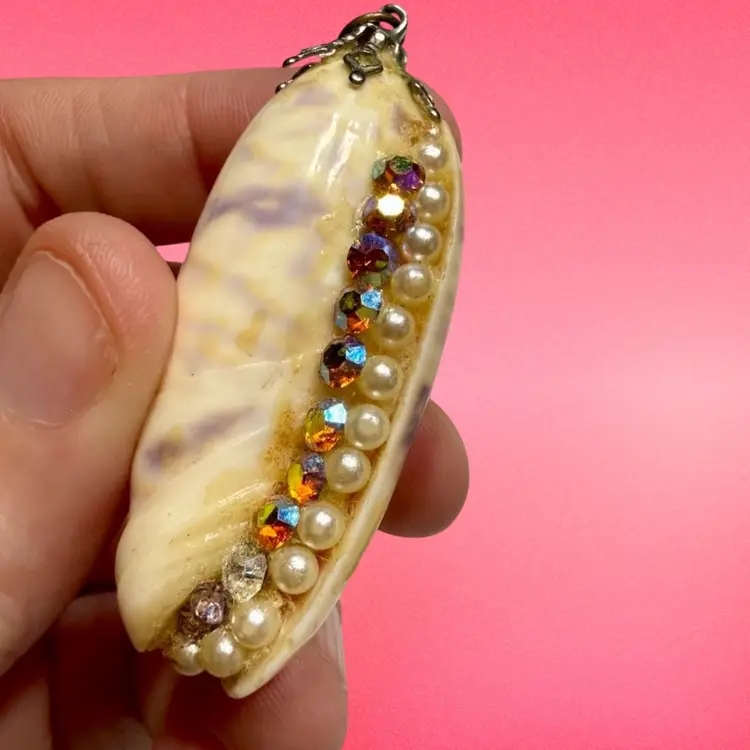 2” & 2.25”. Listing is for TWO handmade seashell pendants. Both made with genuine shells and applied rhinestones/faux pearls/top loops. Would be great for a craft project, art, or a cosplay costume! NOTE due to age, glued areas are a bit more visible.